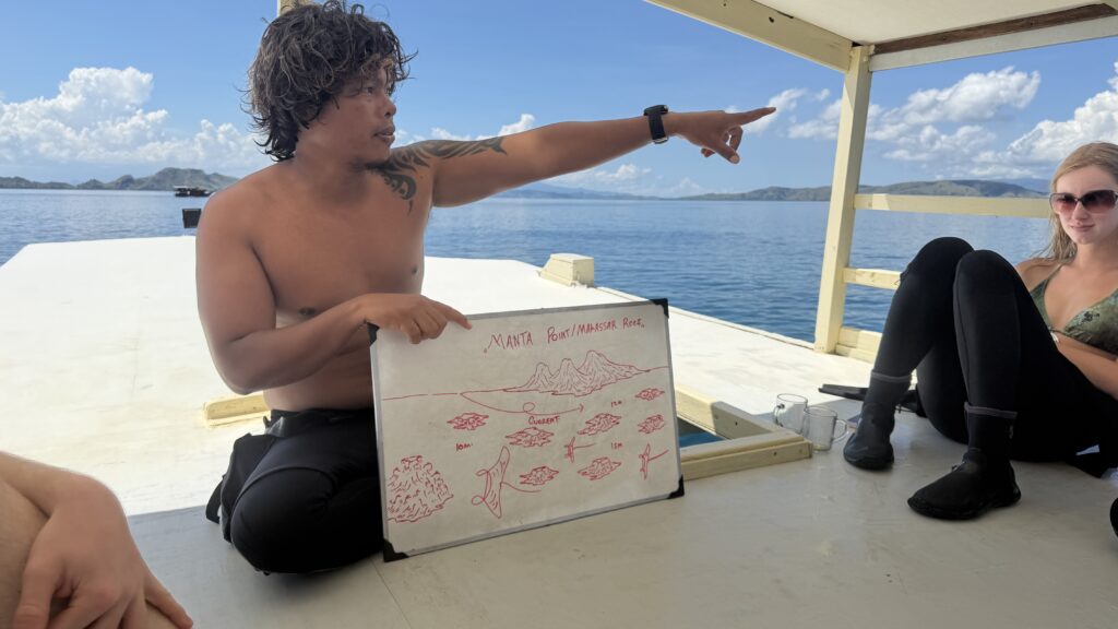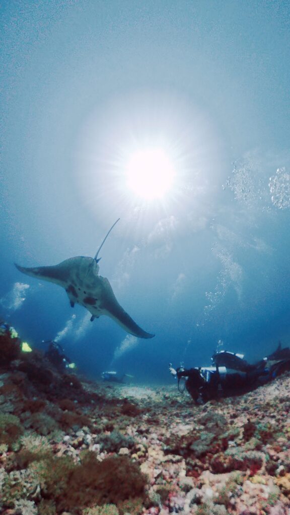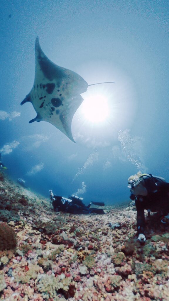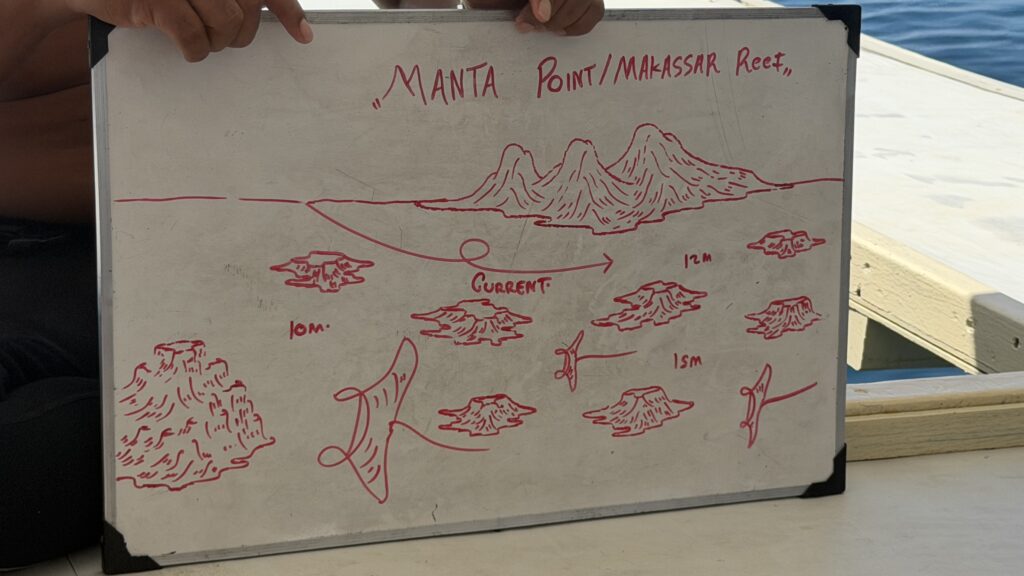 Beim zweiten Tauchgang waren wir bei einem anderen Mantapoint. bei diesem Durchgang haben wir viele Mantas gesehen und waren am Ende auch auf einer Cleaning Station, wo wir rund 20 Minuten zwei Mantas bei ihrer täglichen Reinigung durch andere Fische beobachten konnten. Einmal ist ein Manta nur 1 Meter über uns vorbei gecruist und Birgit hat uns gefilmt. Obwohl wir ja die Mantas bereits von Palau und insbesondere von Soccoro kennen, ist es immer wieder ein eine Erlebnis Mantas zu sehen.