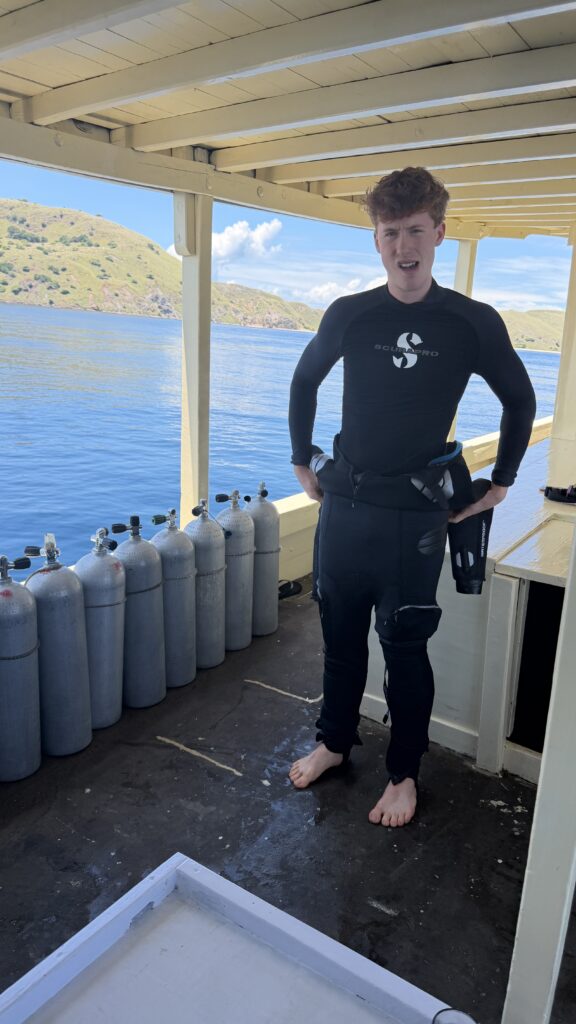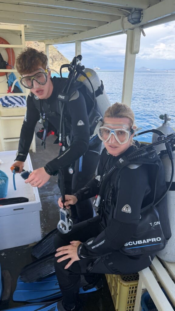 heute sind wir um 7:15 Uhr frühstücken gegangen, um 7:45 Uhr mussten wir beim Tauchboot sein, alles checken und um 8:00 Uhr Abfahrt.