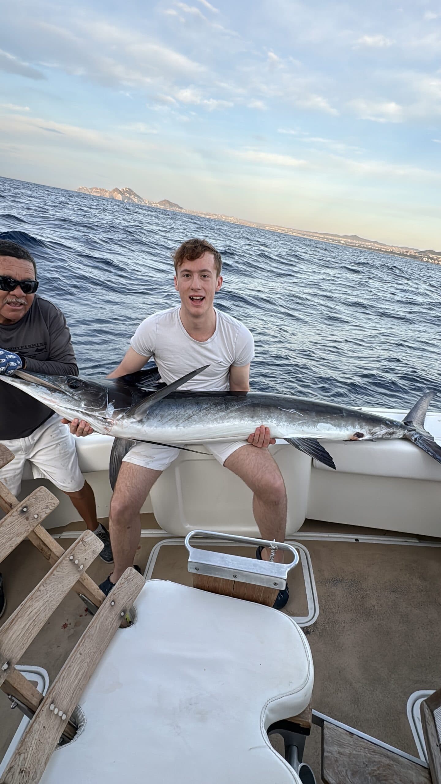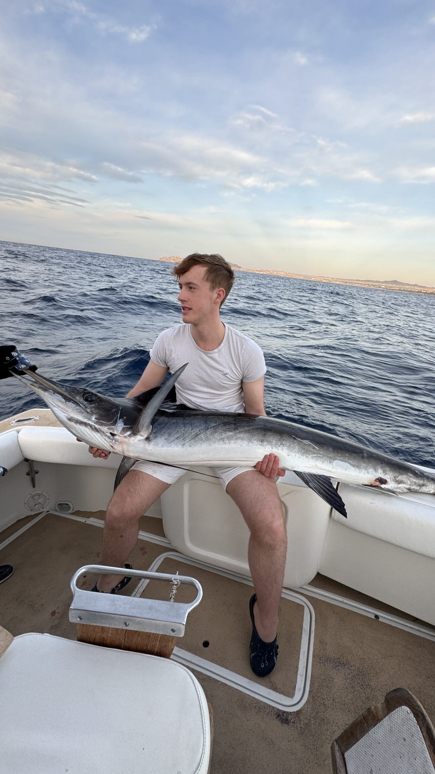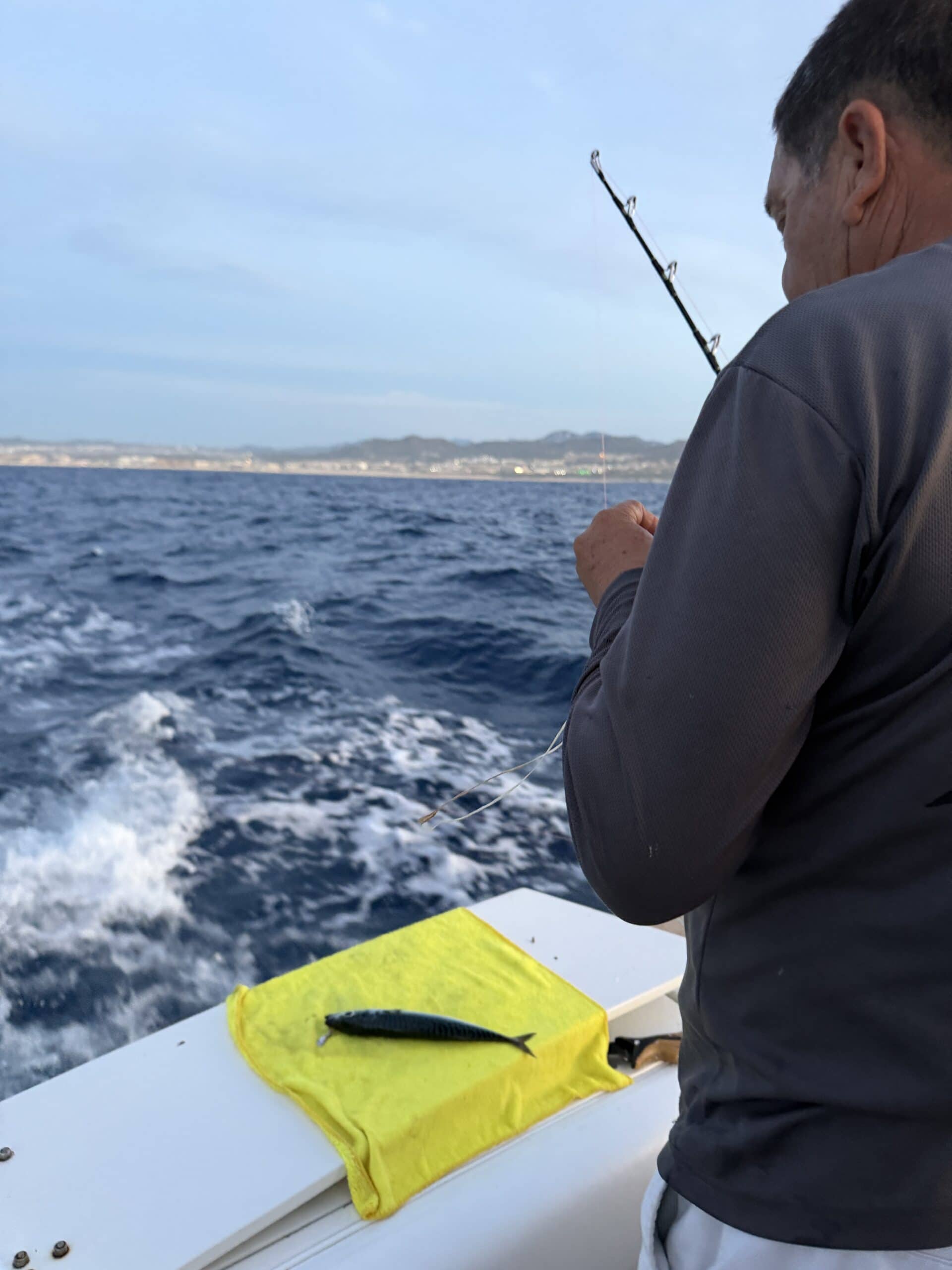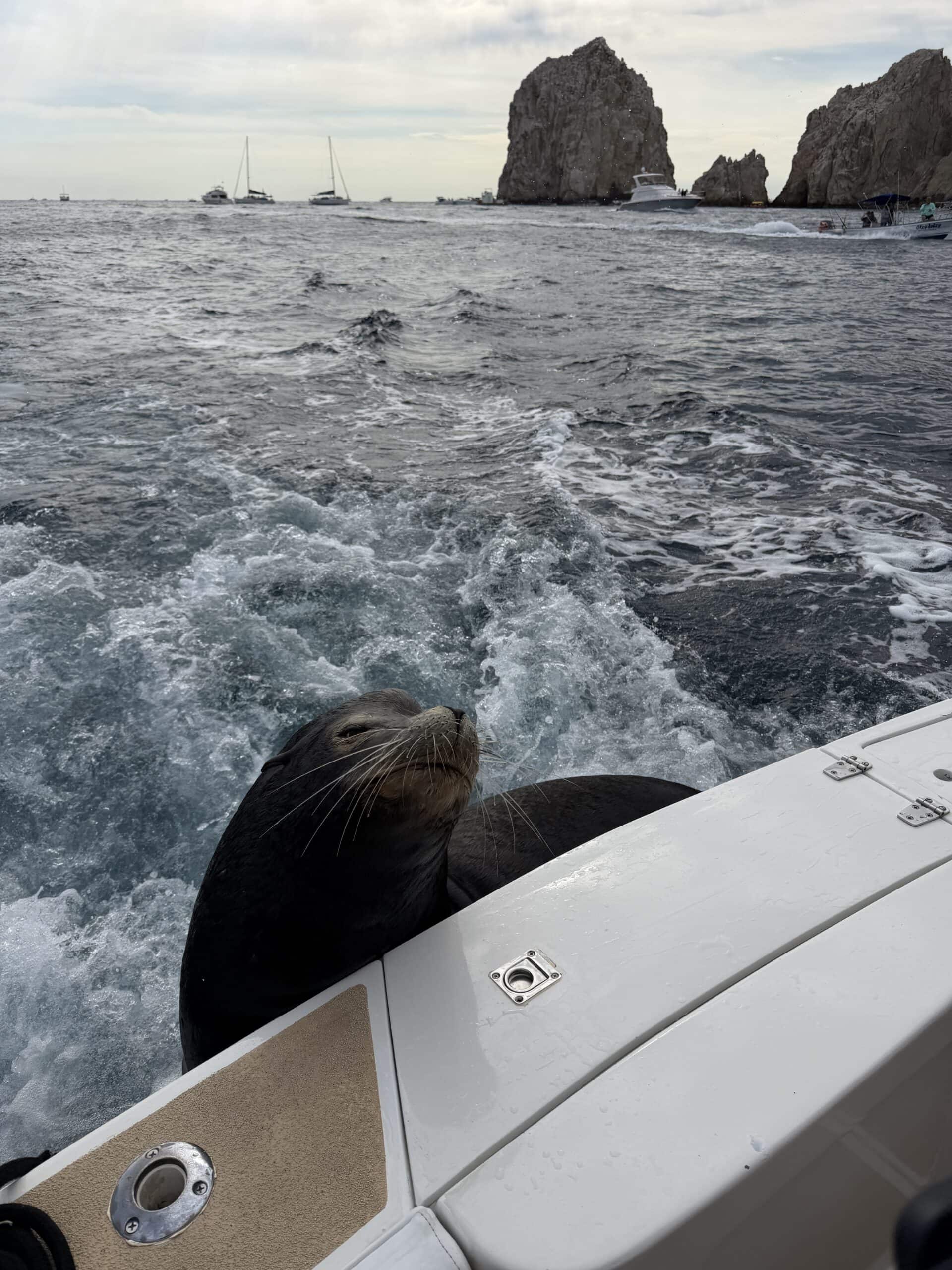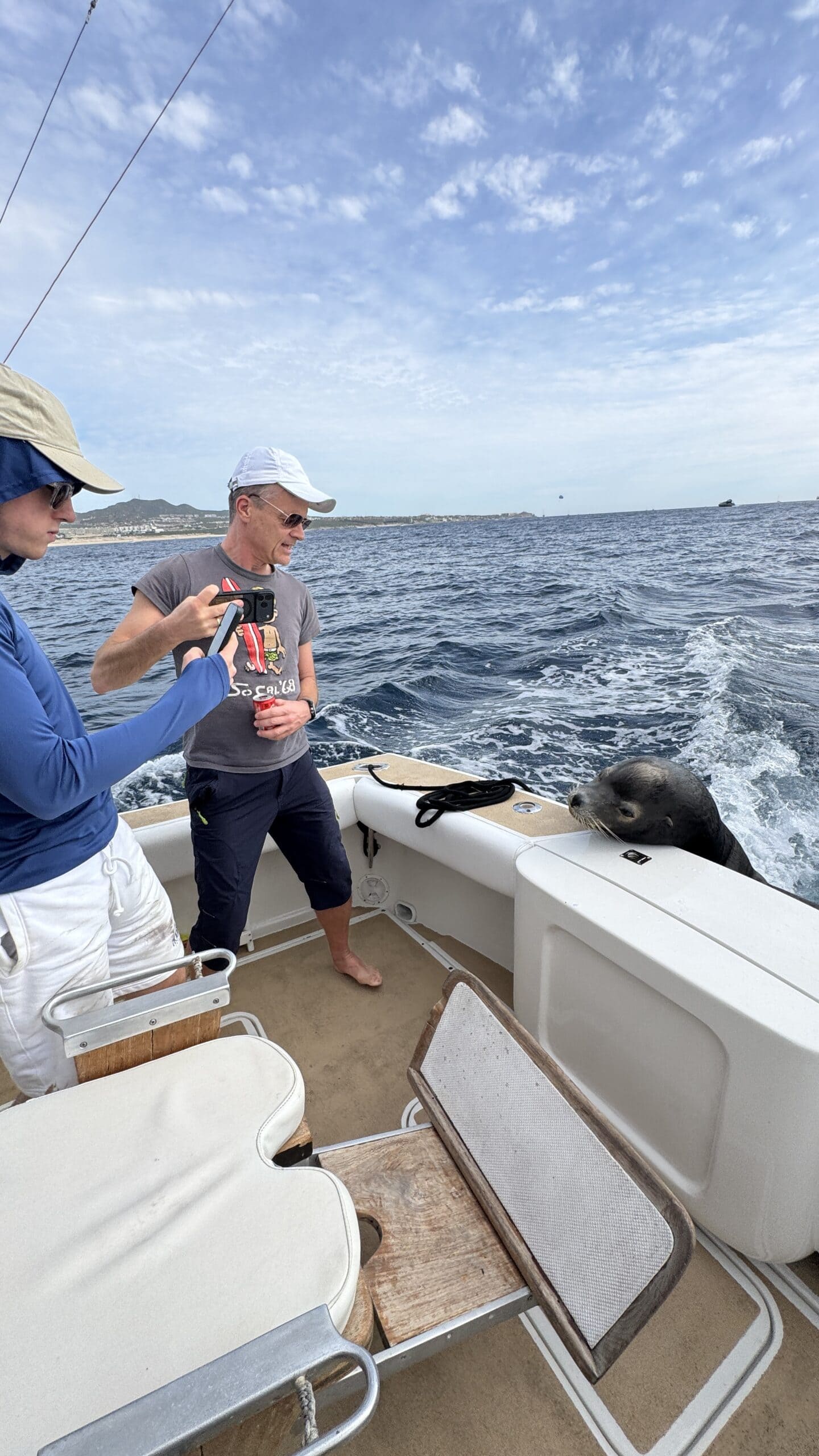 Um 7:20 Uhr Nico den Malin in der Hand für rund 30 Sekunden und gleich danach haben wir den Fisch wieder ins Wasser gelassen. Die Wellen verbunden mit der Anstrengung haben Nikan seekrank werden lassen. Wir sind dann gegen 10:30 Uhrwieder zurück zum Hafen gefahren. Dabei hat uns auch ein großer Seelöwe begleitet und ist doch kurz auf unser Boot gesprungen. Das war echt cool.