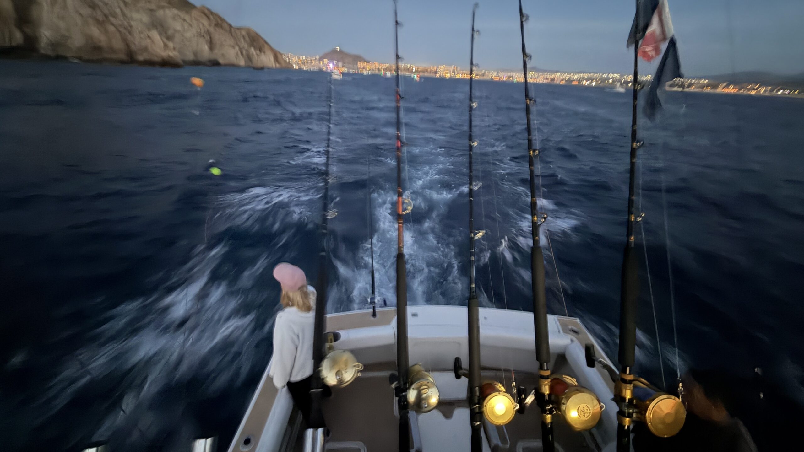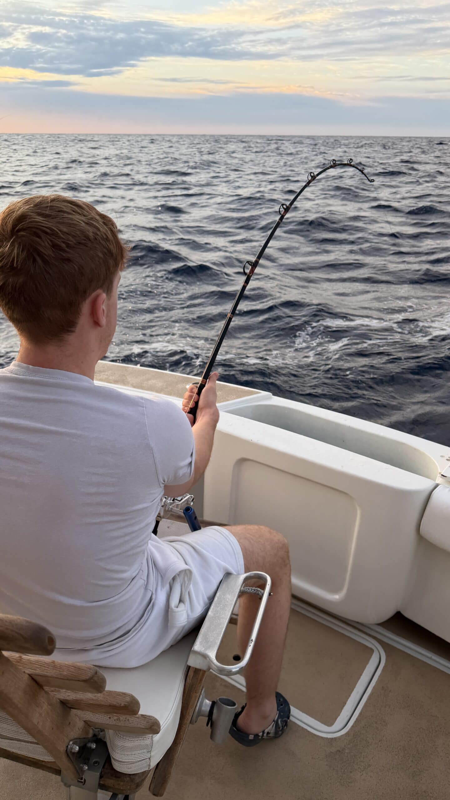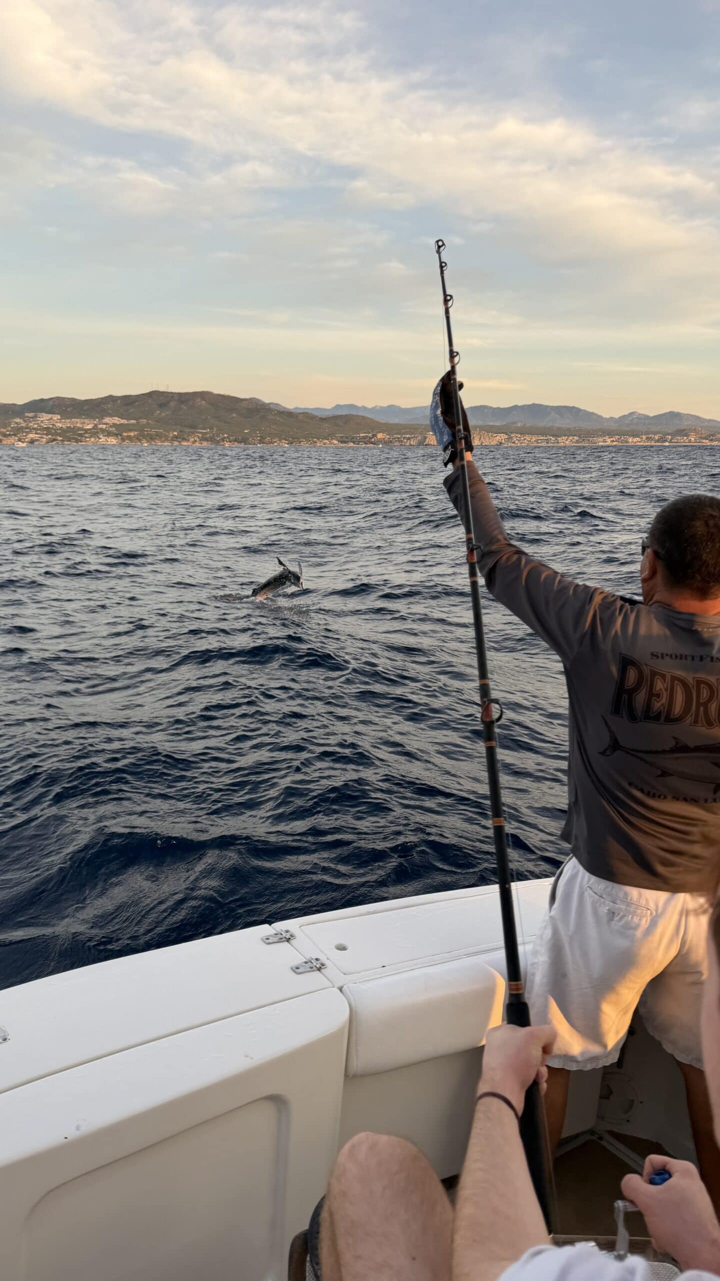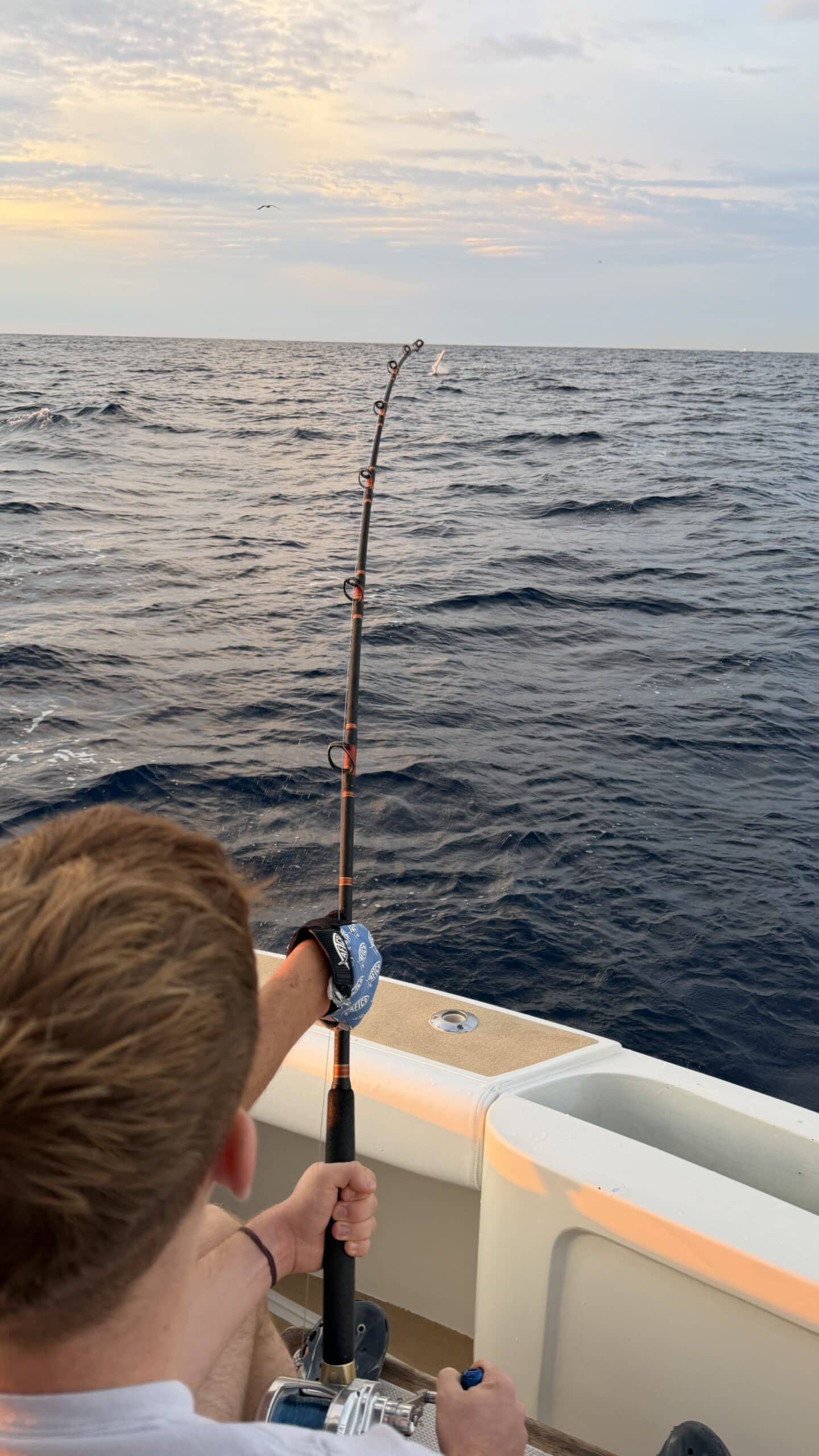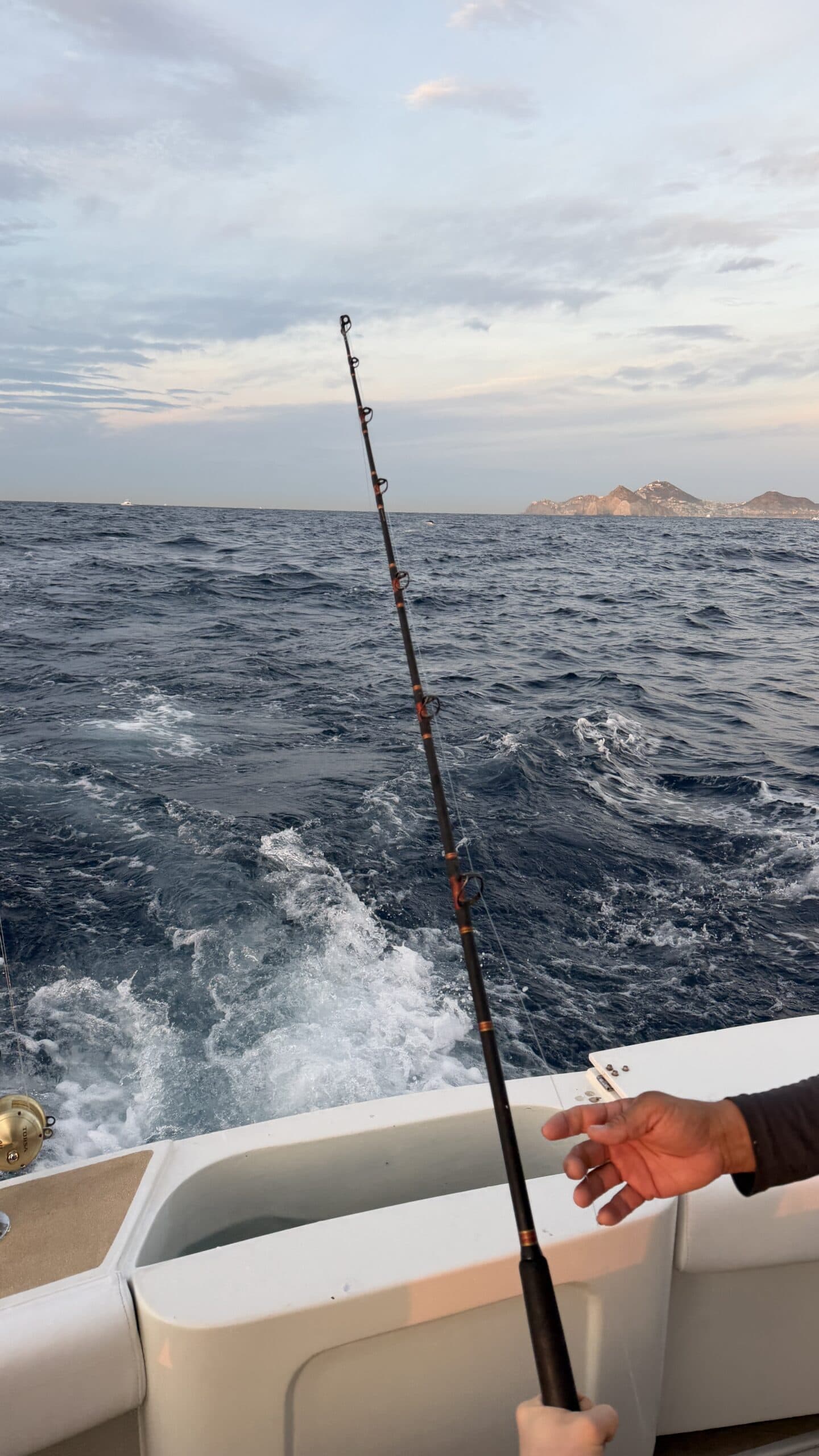 Vorbei an der Felsformation noch in der Dämmerung, wunderschön. Um 7:00 Uhrwar es soweit, Nico hatte einen Marlin an der Angel. Es war ein 2 m großer Marlin und Nico tat sich wirklich sehr sehr schwer die Anke einzuziehen. Der Fisch hatte eine sehr starke Kraft, aber am Ende hat er verloren.