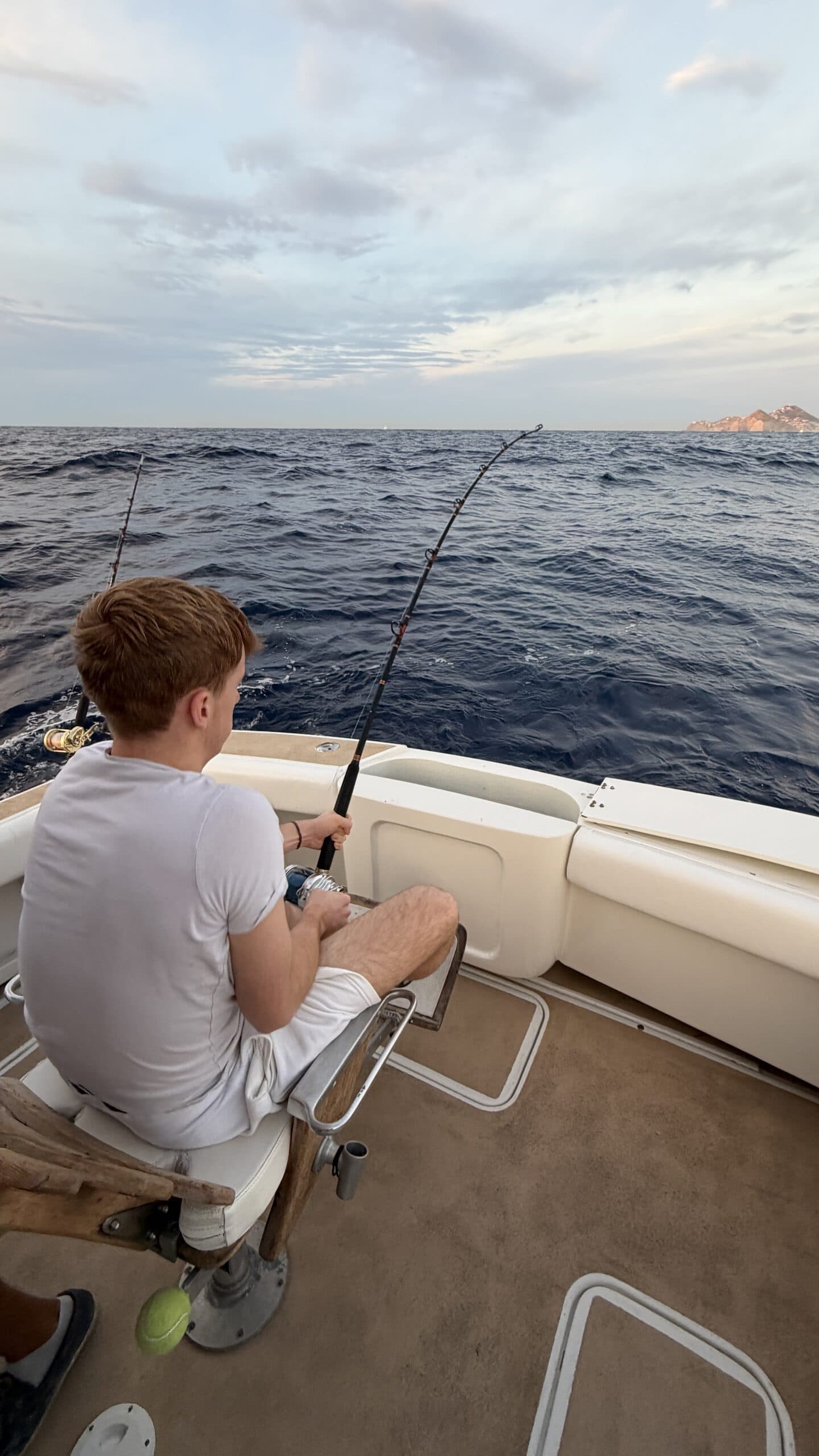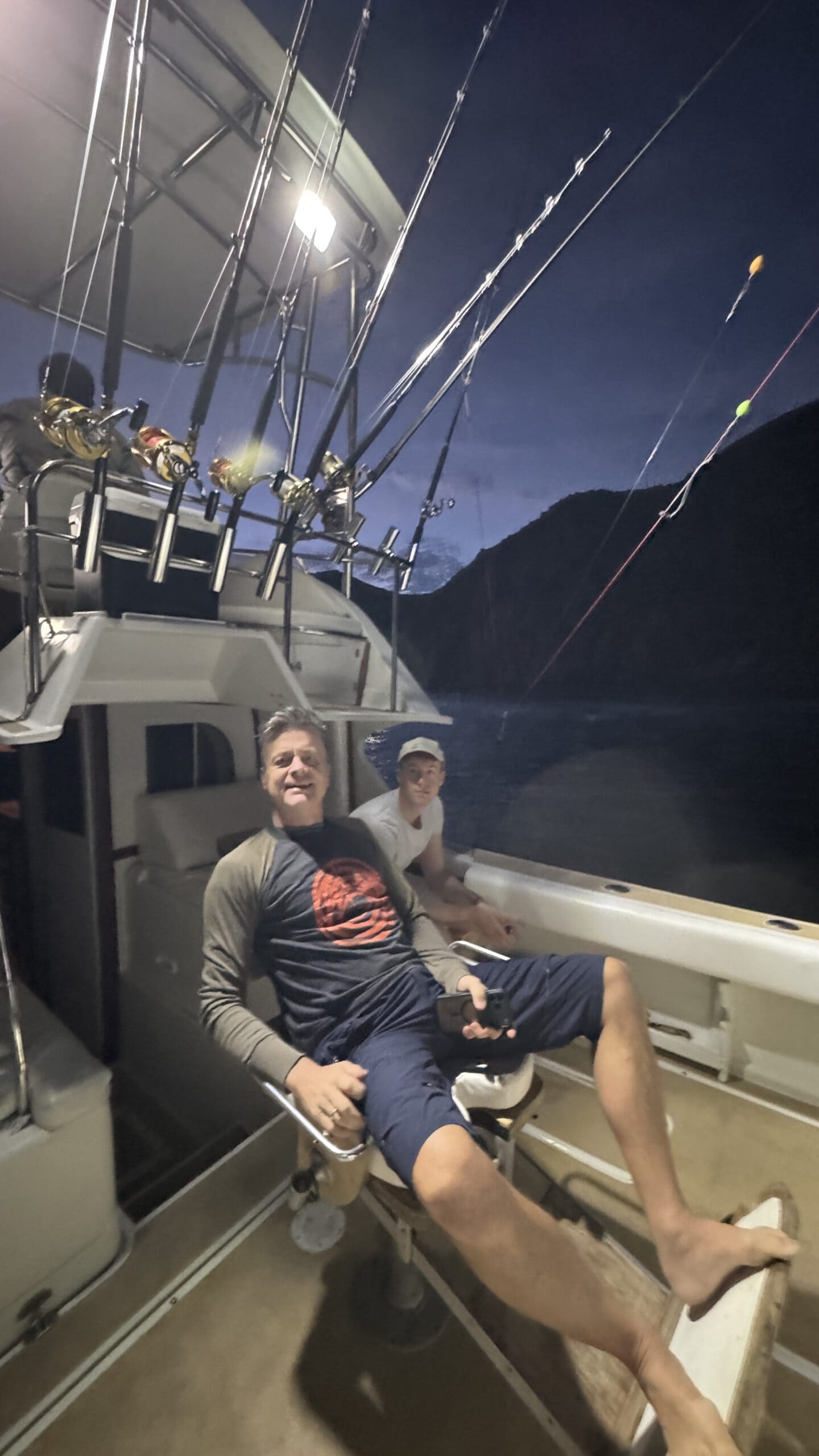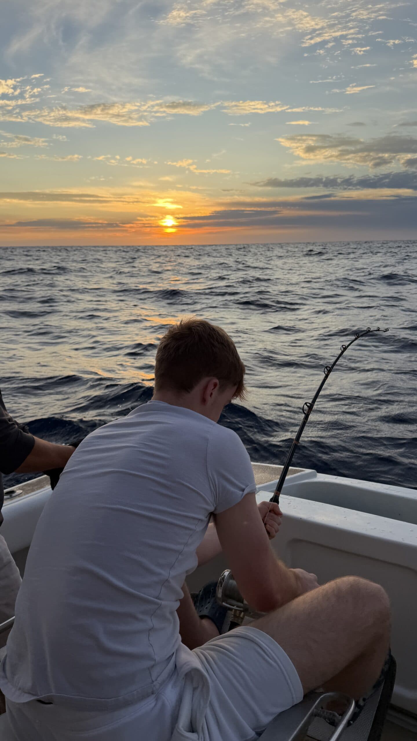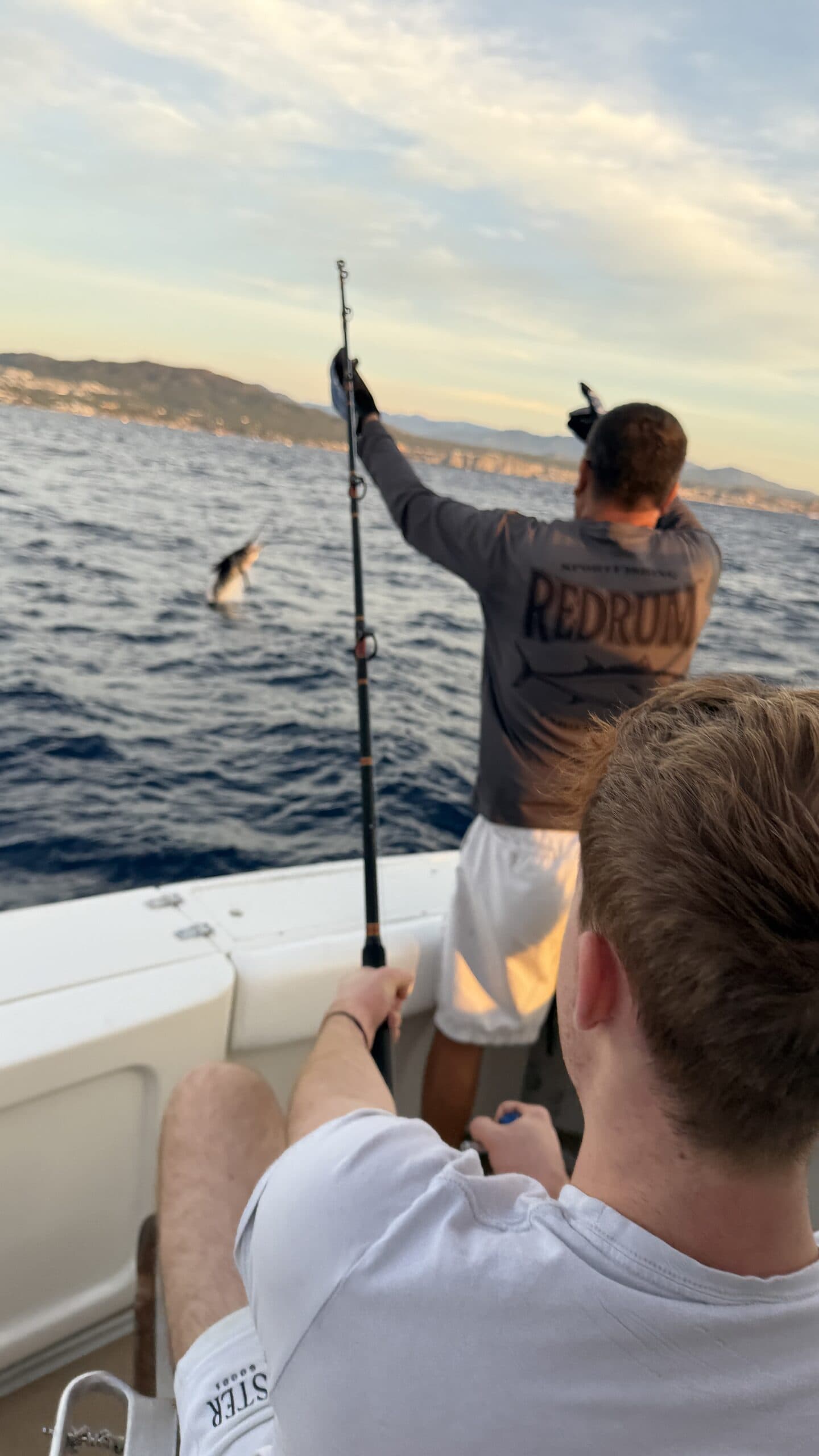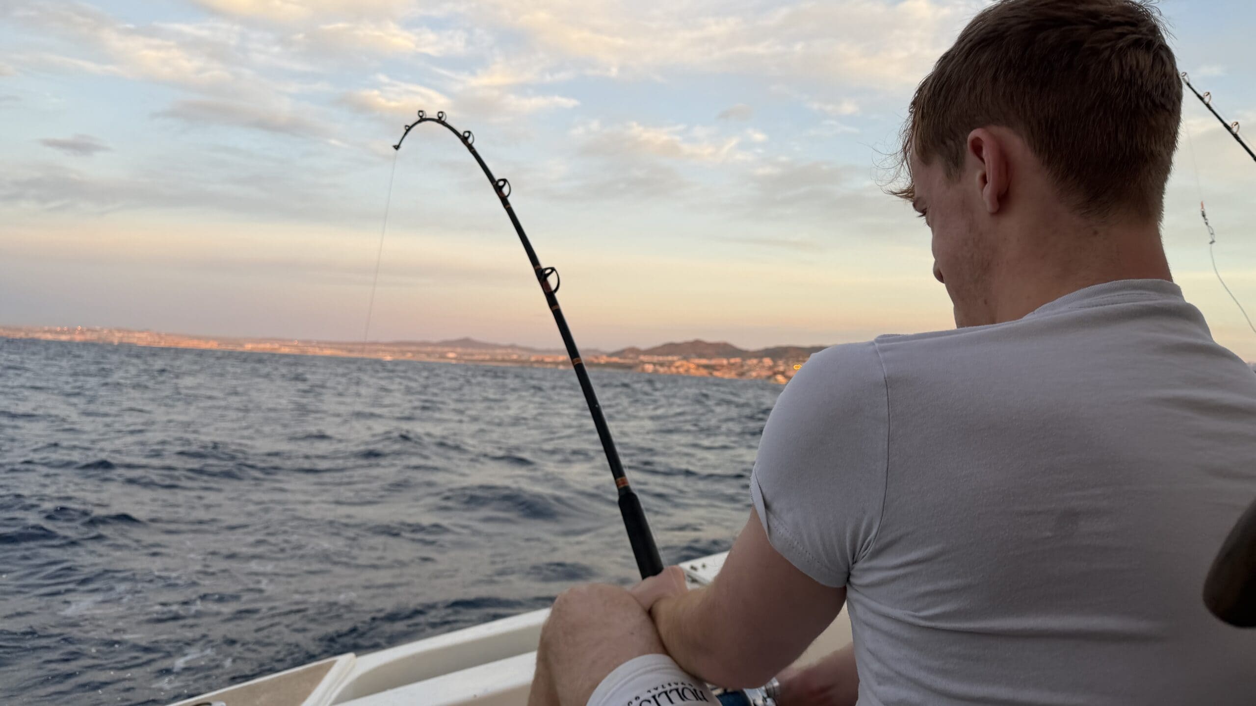 Vorbei an der Felsformation noch in der Dämmerung, wunderschön. Um 7:00 Uhrwar es soweit, Nico hatte einen Marlin an der Angel. Es war ein 2 m großer Marlin und Nico tat sich wirklich sehr sehr schwer die Anke einzuziehen. Der Fisch hatte eine sehr starke Kraft, aber am Ende hat er verloren.