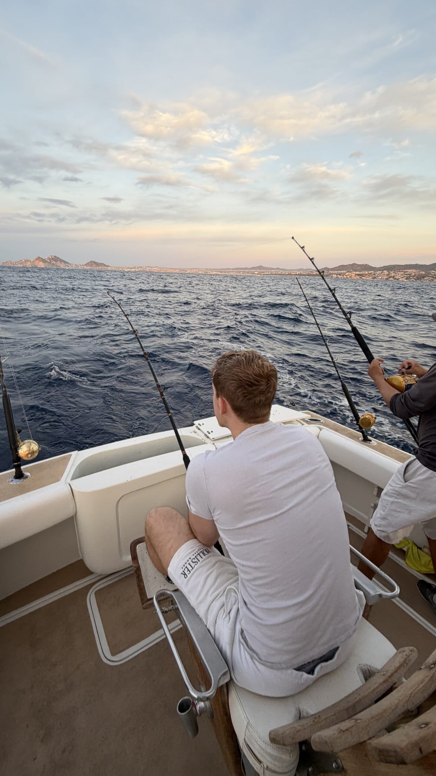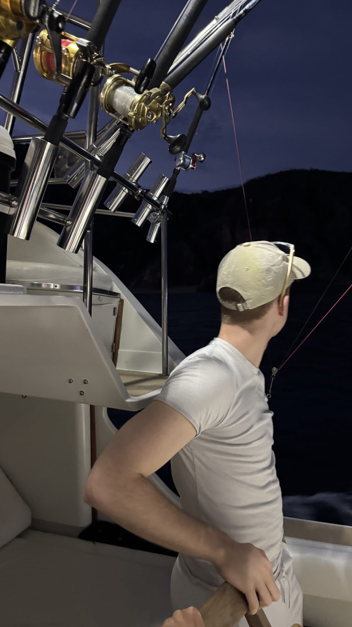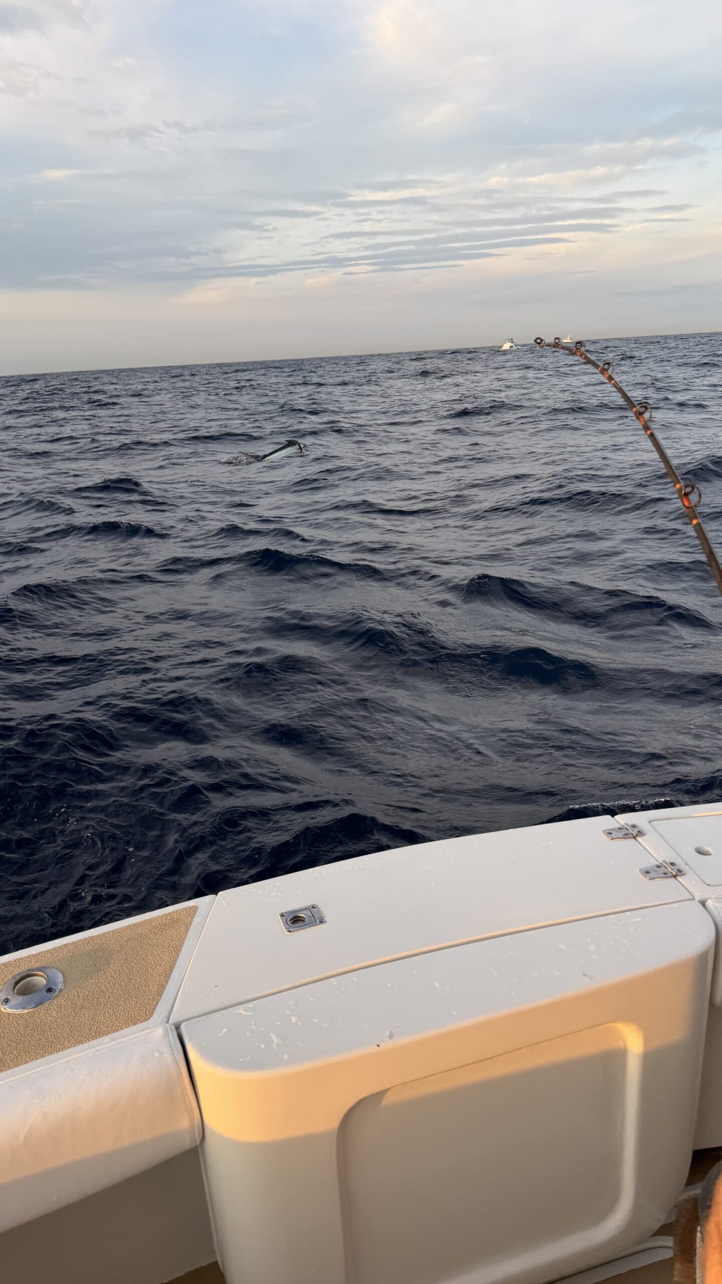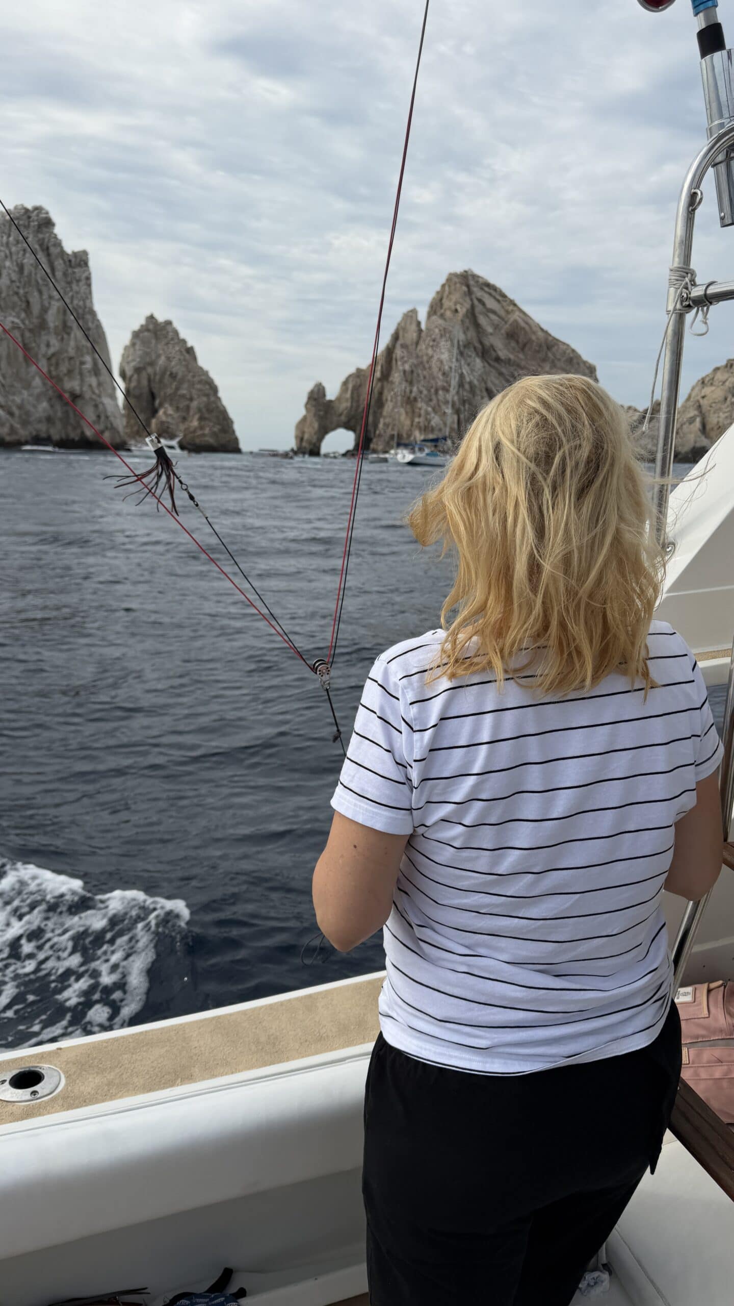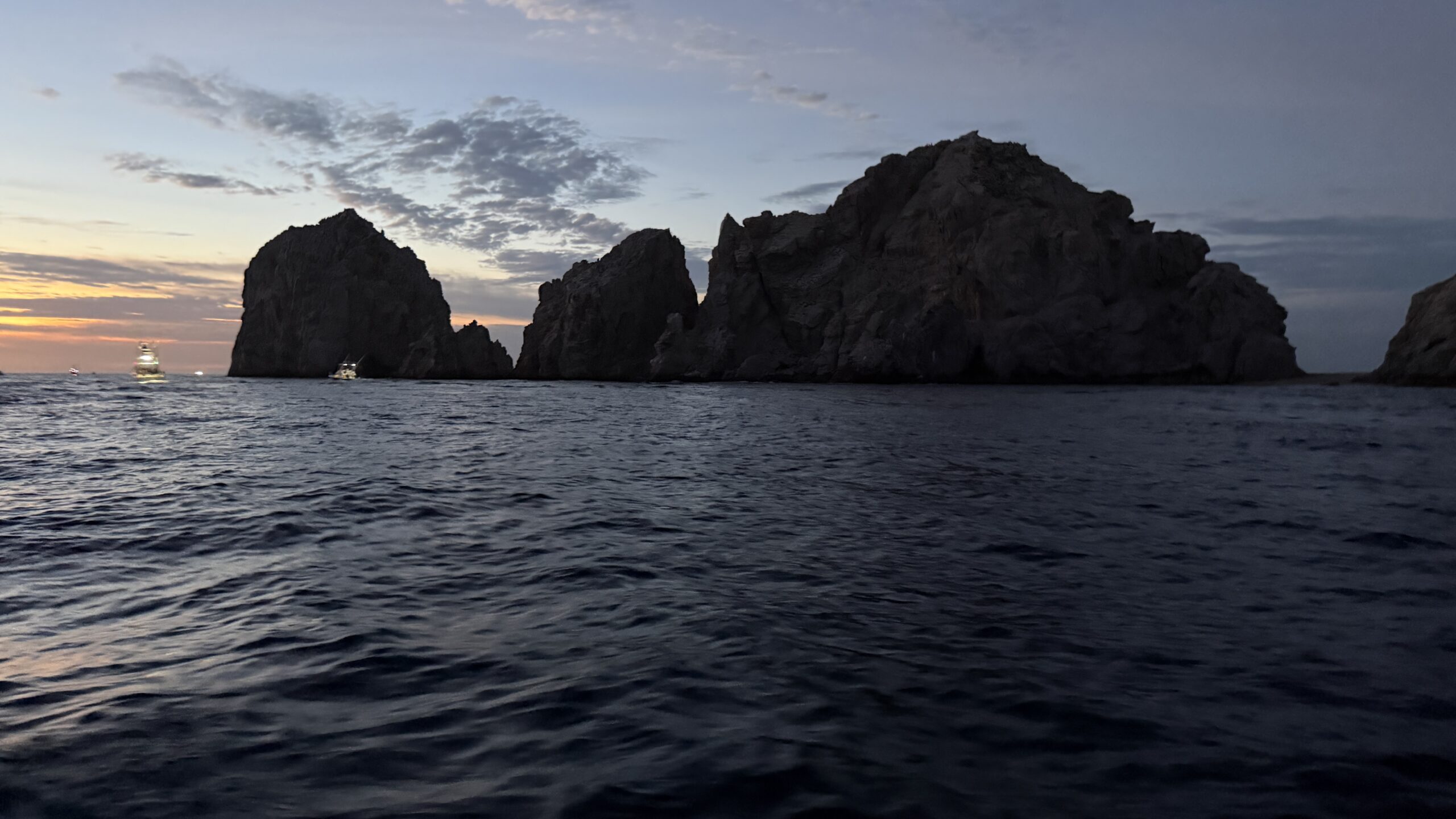 Vorbei an der Felsformation noch in der Dämmerung, wunderschön. Um 7:00 Uhrwar es soweit, Nico hatte einen Marlin an der Angel. Es war ein 2 m großer Marlin und Nico tat sich wirklich sehr sehr schwer die Anke einzuziehen. Der Fisch hatte eine sehr starke Kraft, aber am Ende hat er verloren.