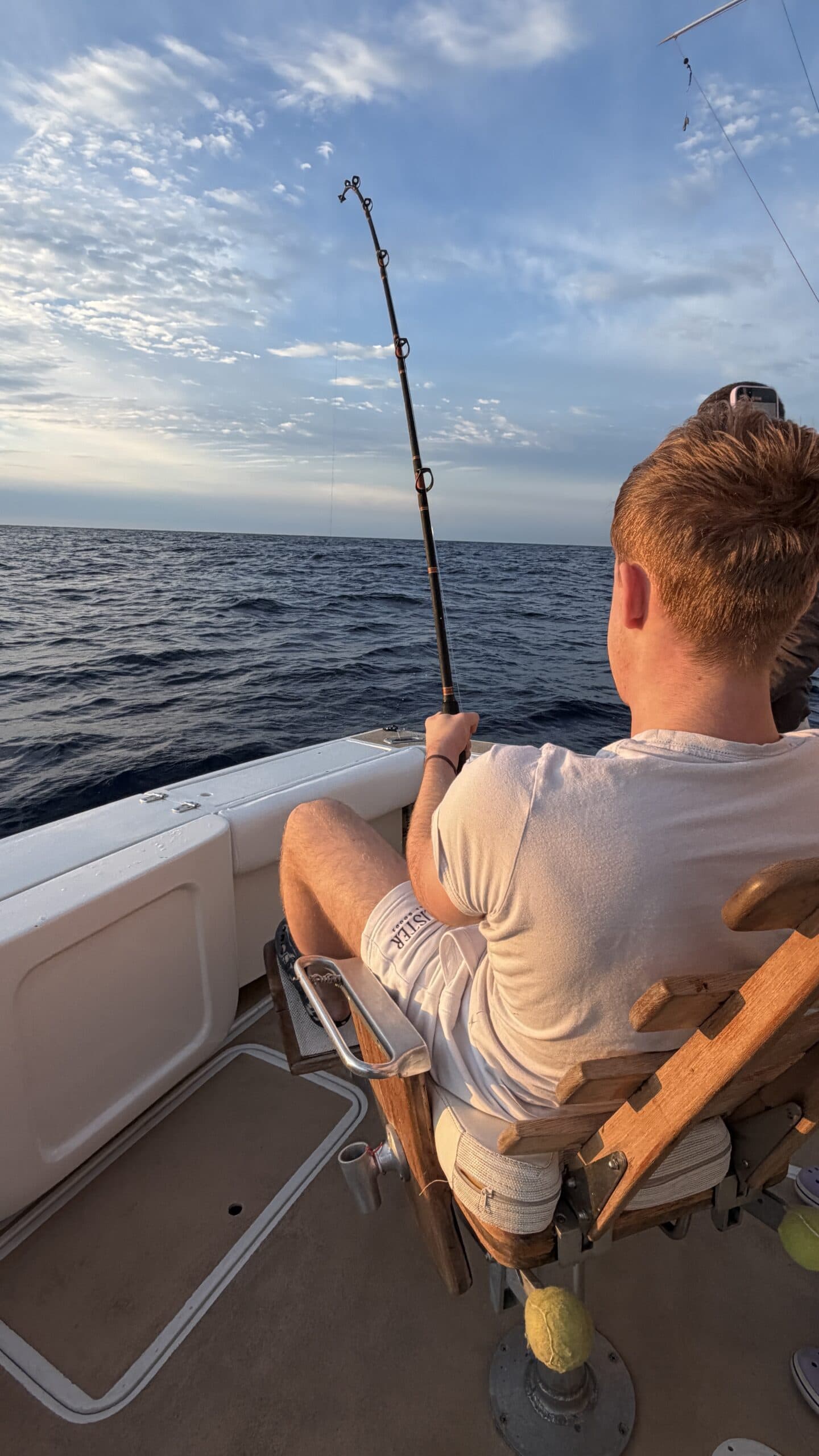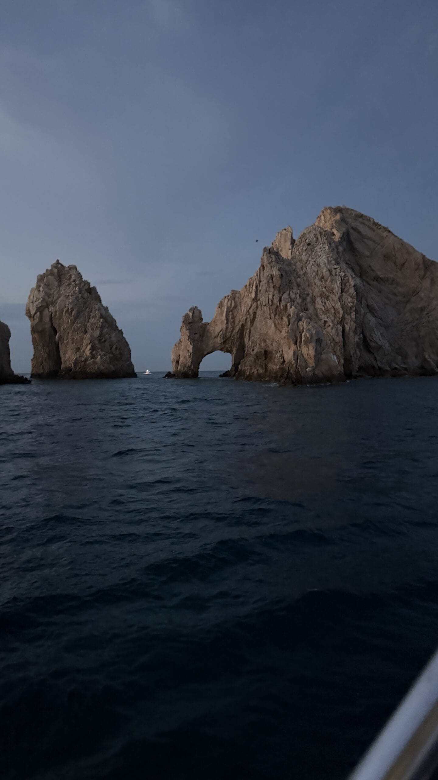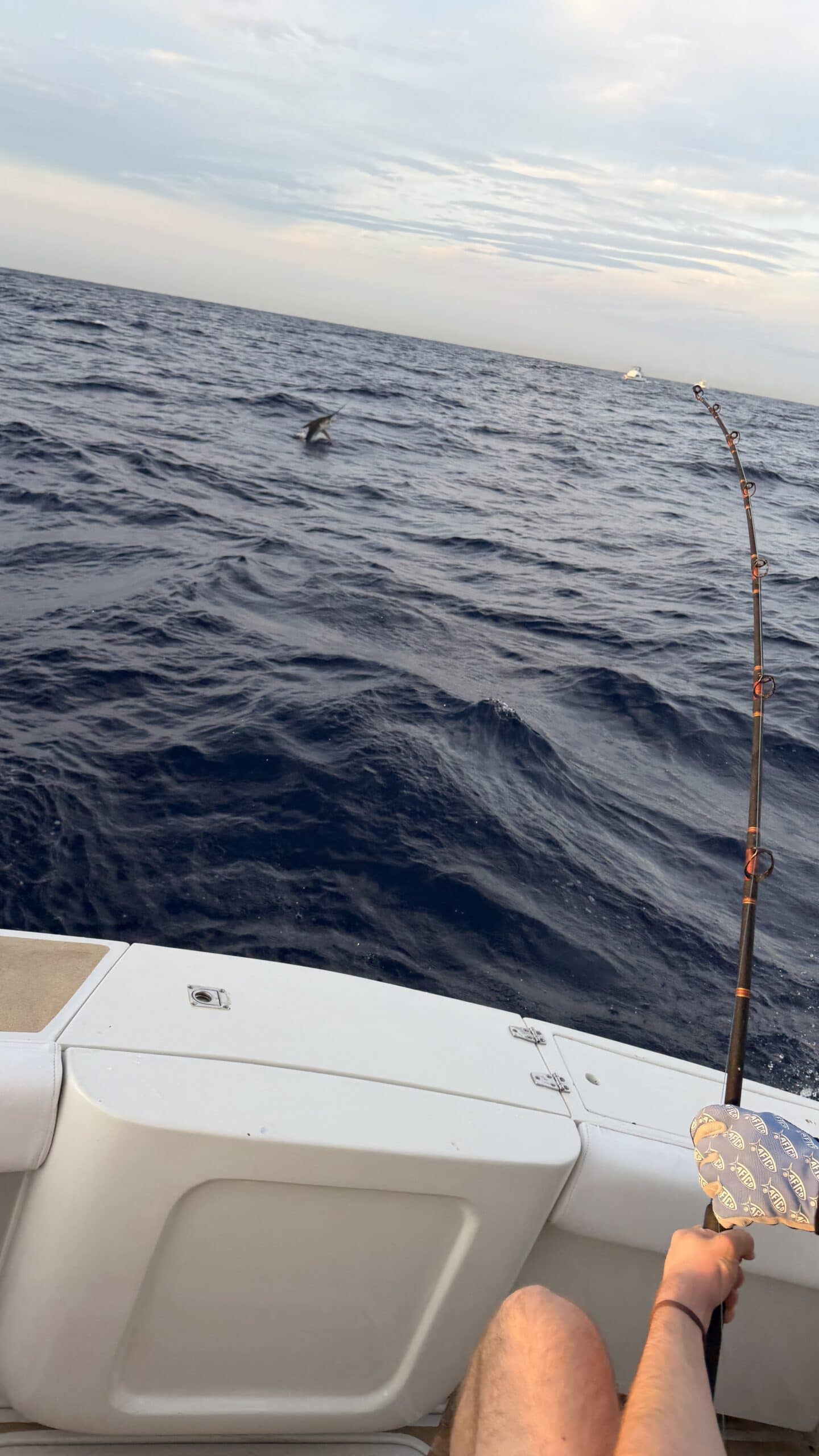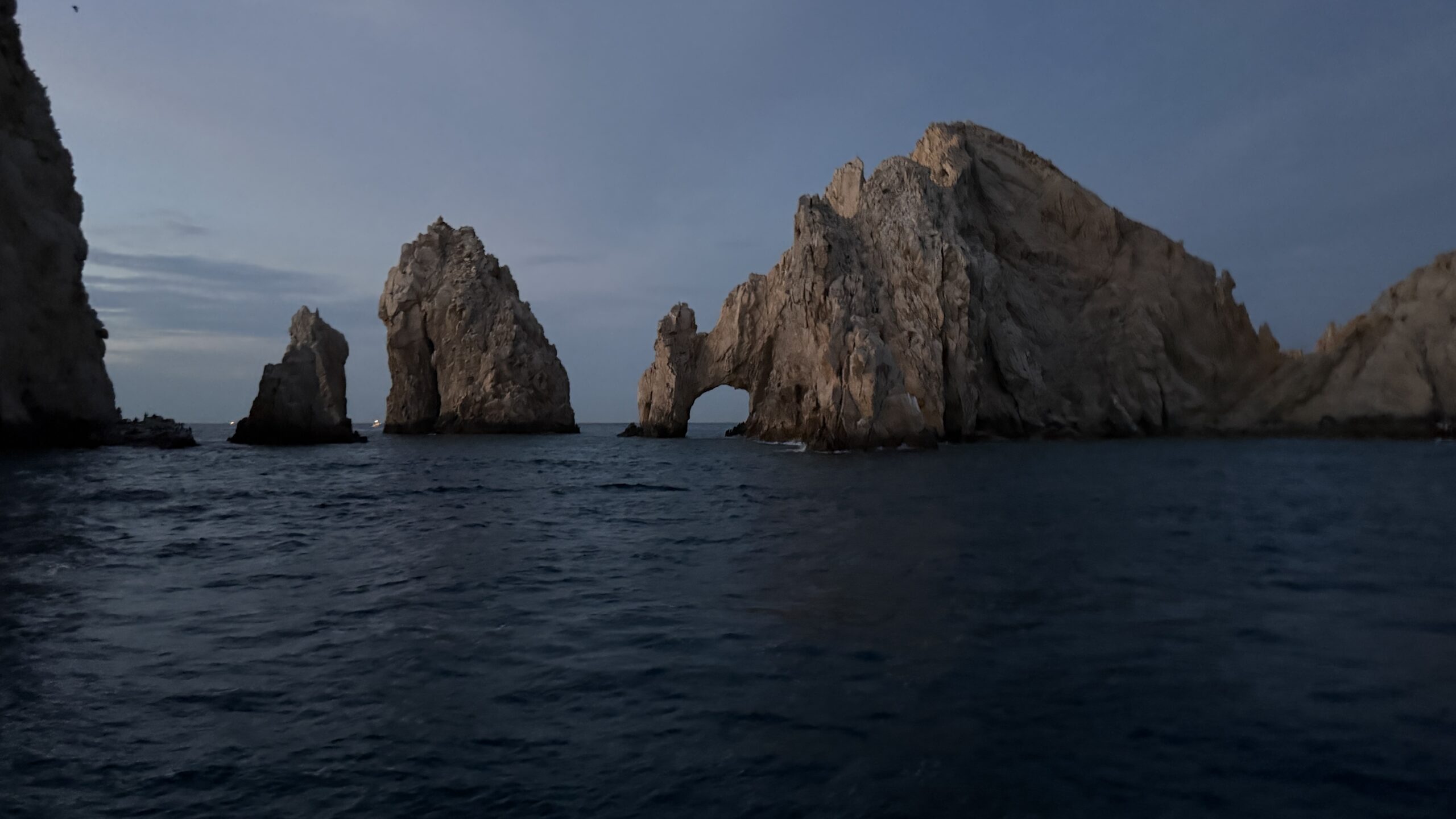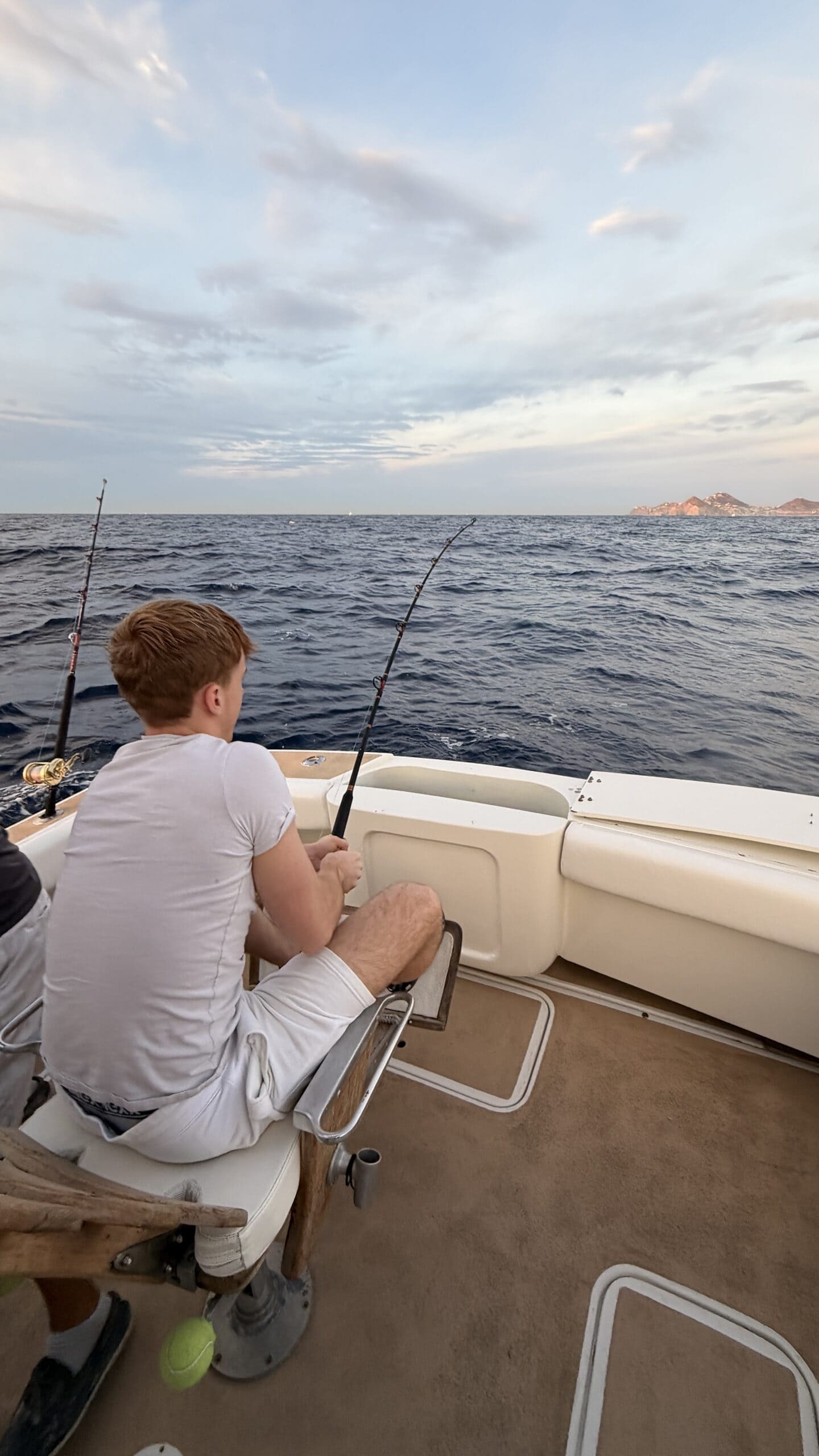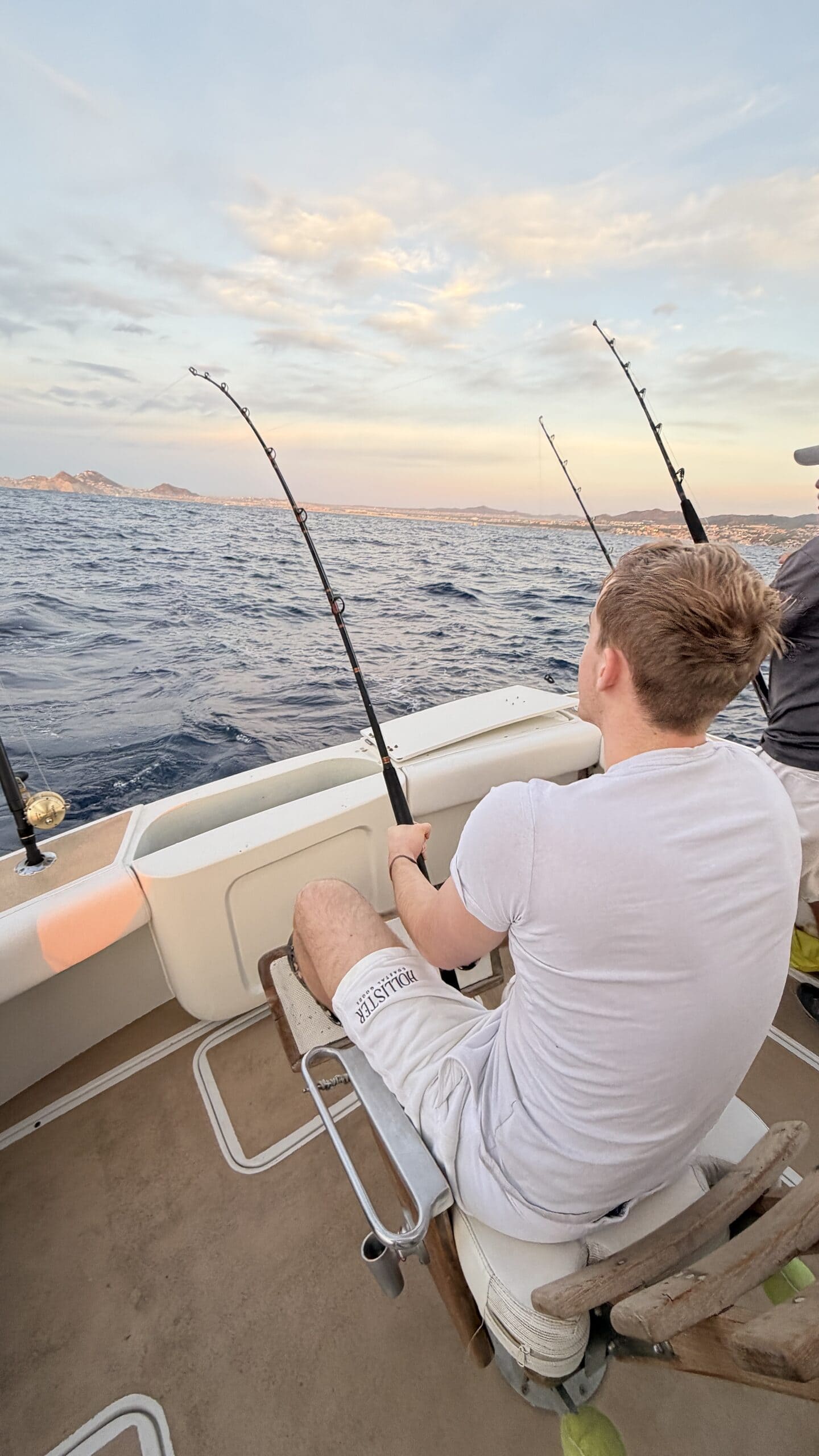 Vorbei an der Felsformation noch in der Dämmerung, wunderschön. Um 7:00 Uhrwar es soweit, Nico hatte einen Marlin an der Angel. Es war ein 2 m großer Marlin und Nico tat sich wirklich sehr sehr schwer die Anke einzuziehen. Der Fisch hatte eine sehr starke Kraft, aber am Ende hat er verloren.