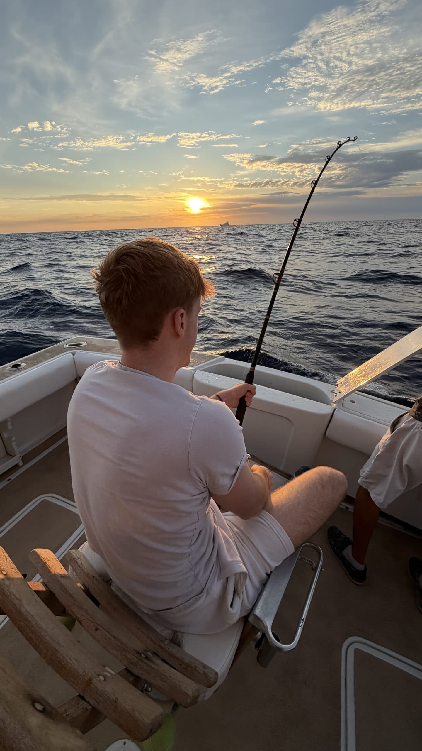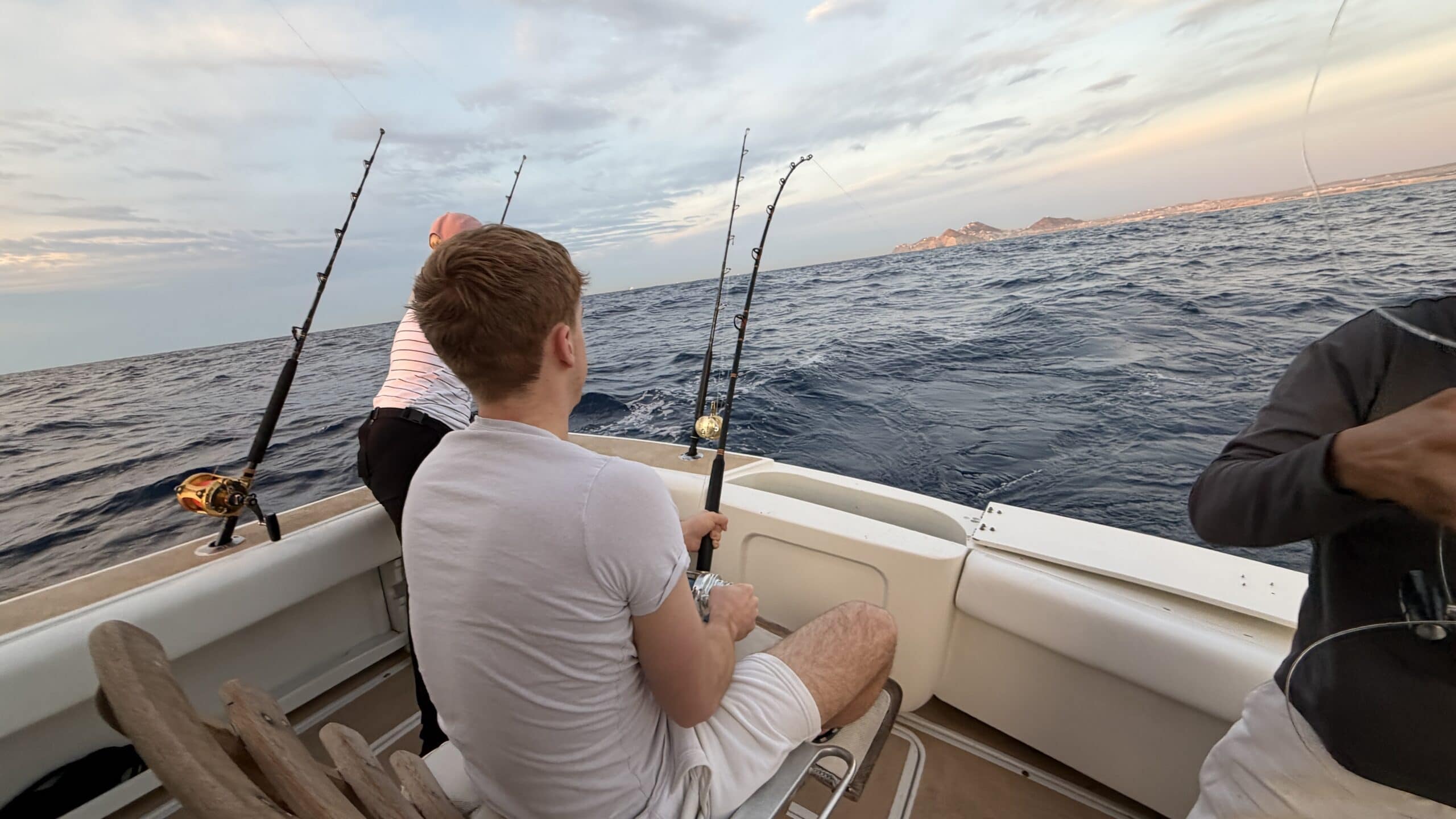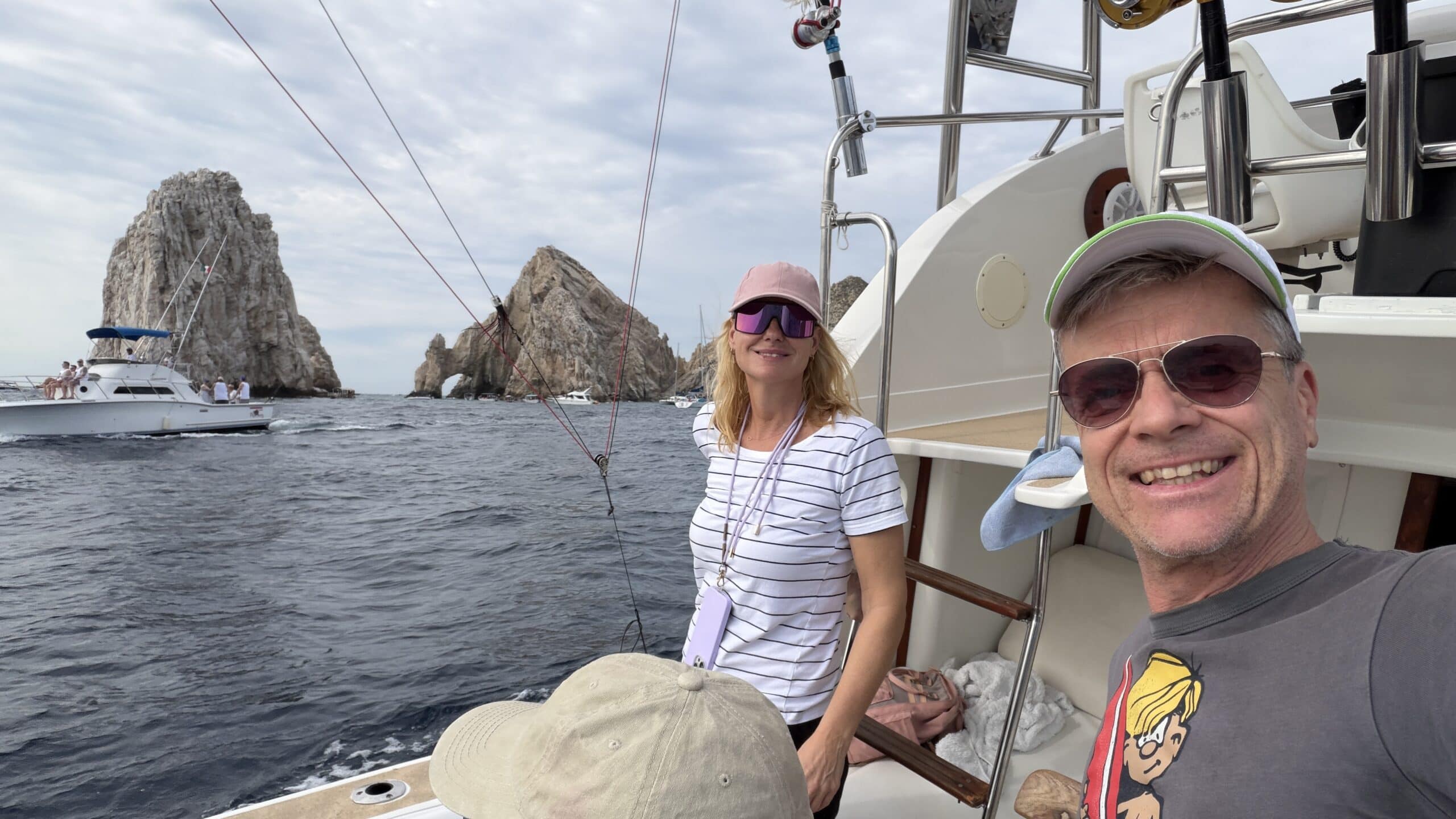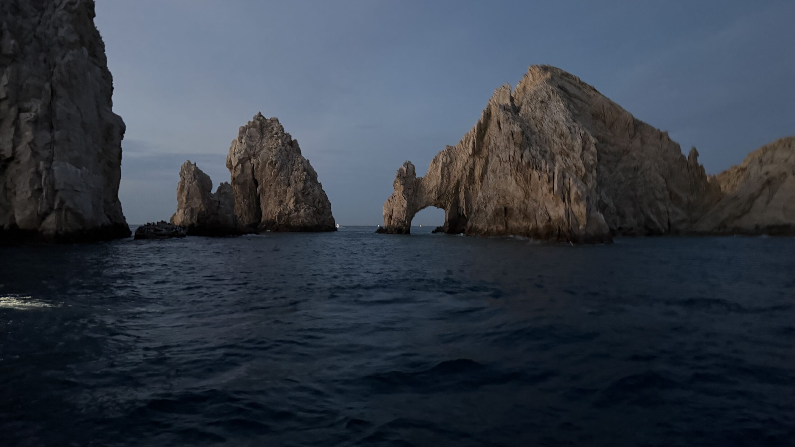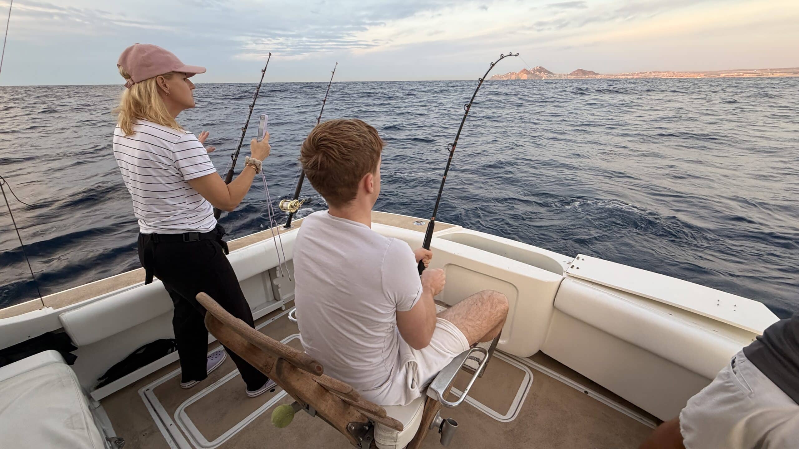 Vorbei an der Felsformation noch in der Dämmerung, wunderschön. Um 7:00 Uhrwar es soweit, Nico hatte einen Marlin an der Angel. Es war ein 2 m großer Marlin und Nico tat sich wirklich sehr sehr schwer die Anke einzuziehen. Der Fisch hatte eine sehr starke Kraft, aber am Ende hat er verloren.
