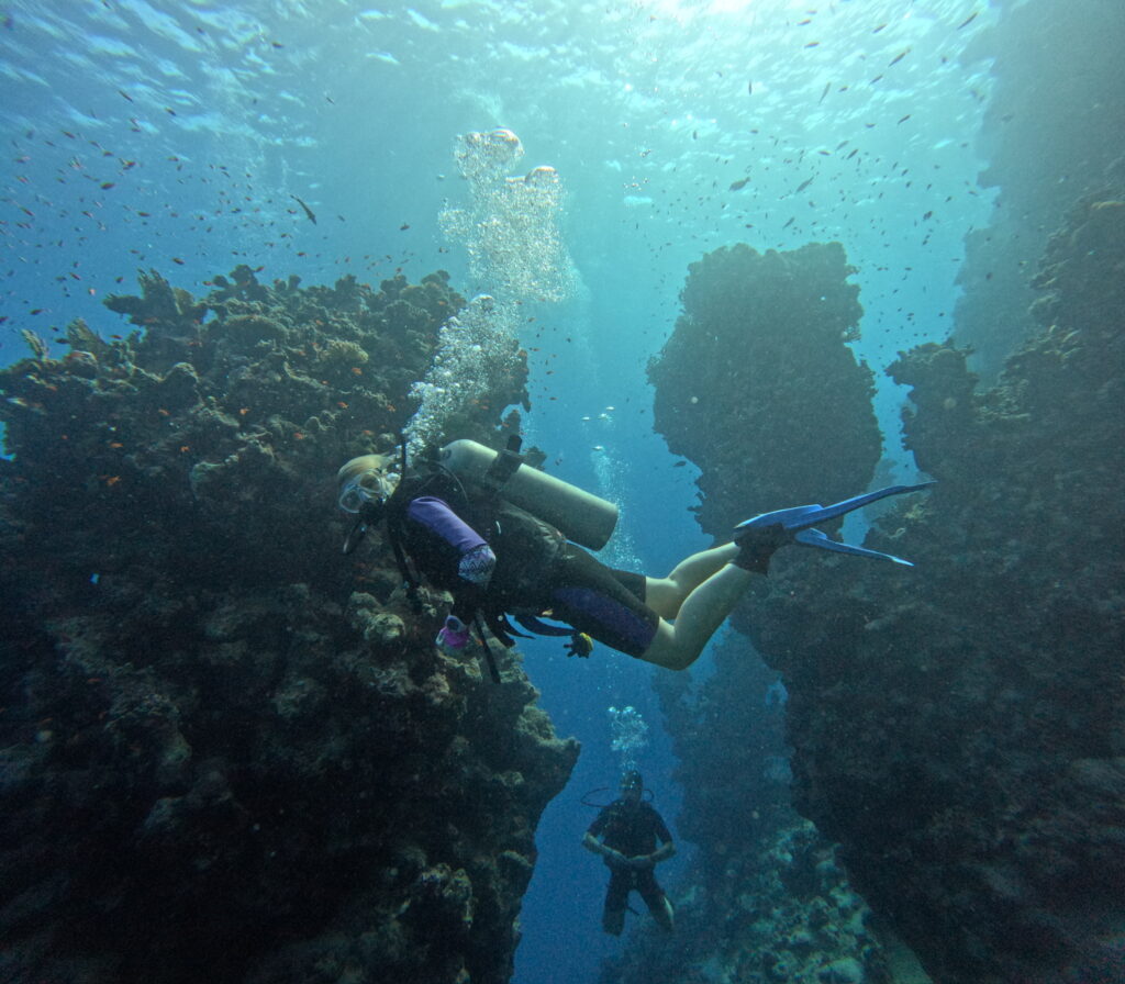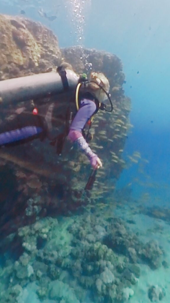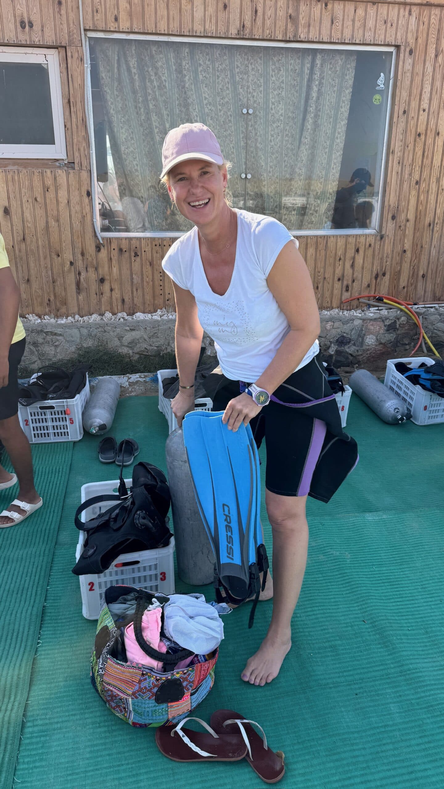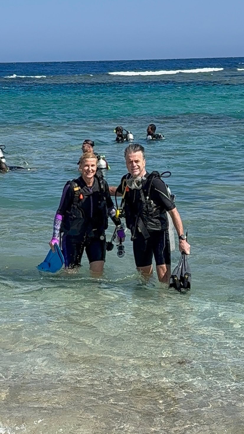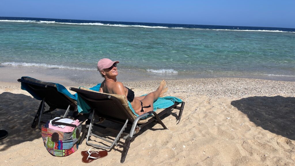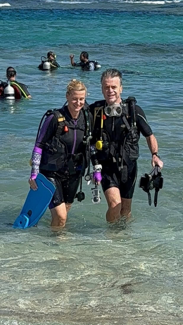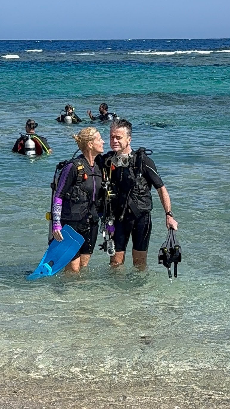 Nachdem nur Herumliegen ohne großartigem Ausblick und Komfort auf den Liegen zu langweilig ist, sind Birgit und ich heute auch zum Strandtauchgang mit Nico mitgefahren.