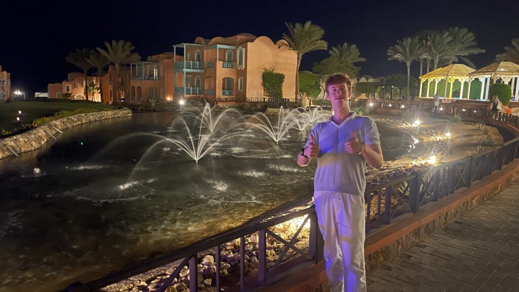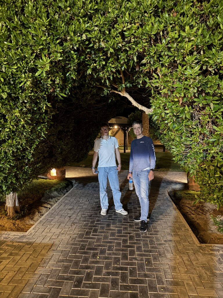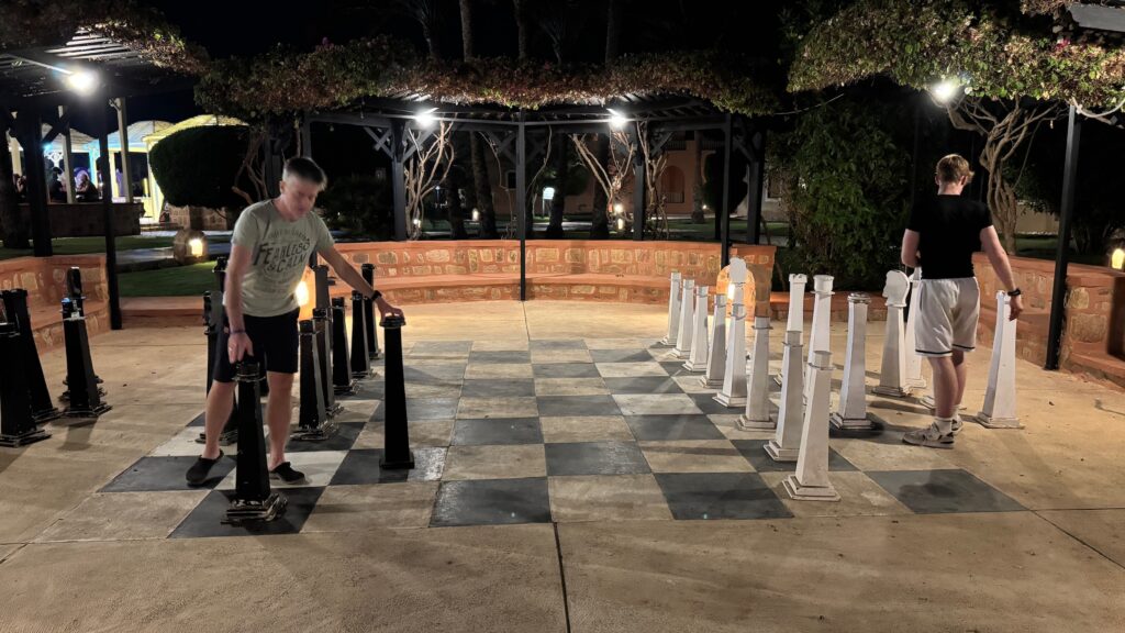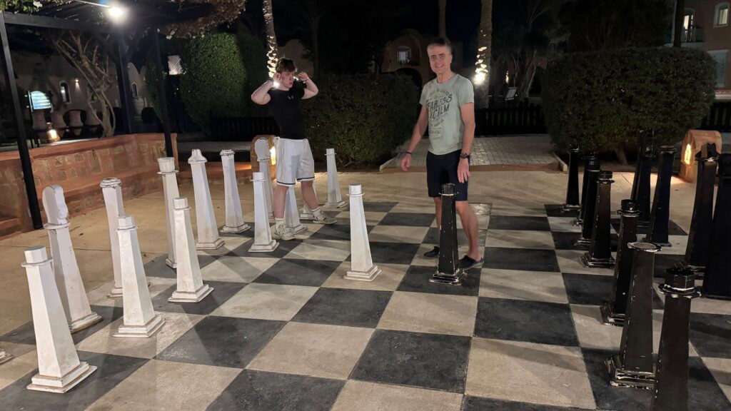 Nach dem Dive waren wir was trinken und dann chillen auf der Terrasse und gegen 20 Uhr erst Abendessen, weil Nico noch im Gym war. Nach dem Abendessen haben Nico und ich noch Schach mit großen Spielfiguren gespielt. Das war sehr ungewöhnlich.