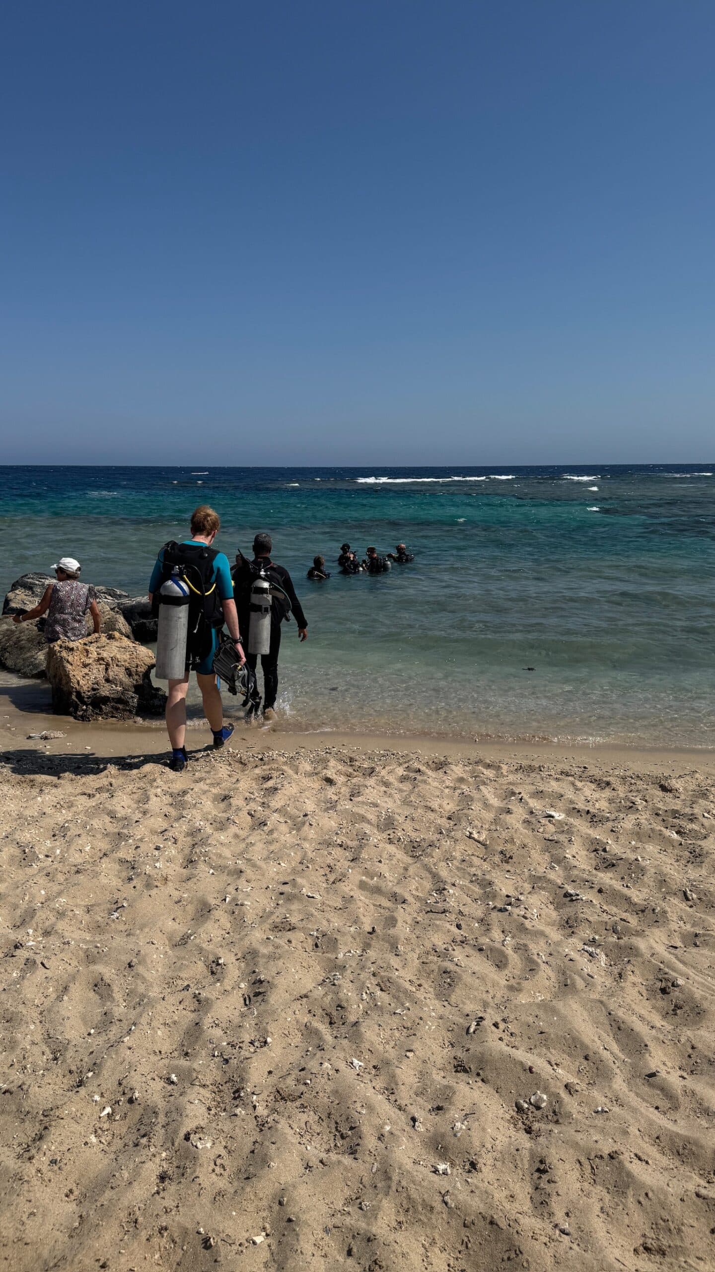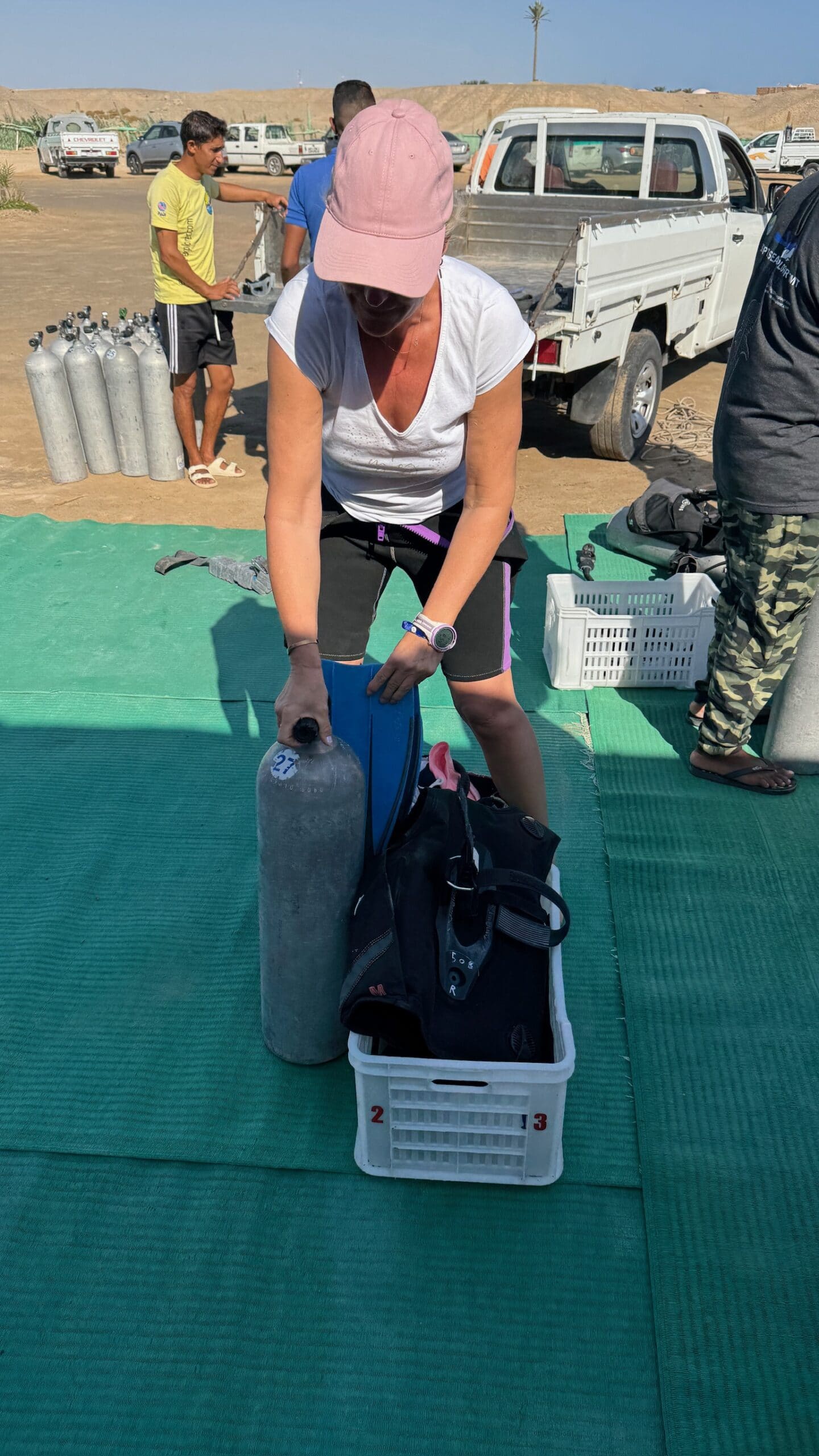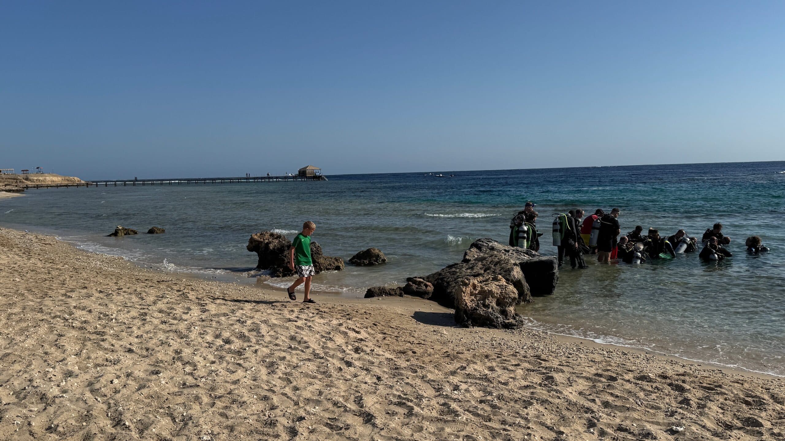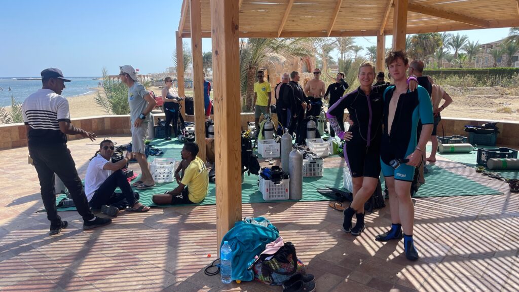 Um 8 Uhr war Tagwache und gleich danach ging’s zum Frühstück. Um 8:45 Uhr waren wir bei der Tauchbasis, die gleich bei uns ums Eck ist. Dann ging’s 20 Minuten mit dem Kleinbus nach Süden hinter El Quseir.