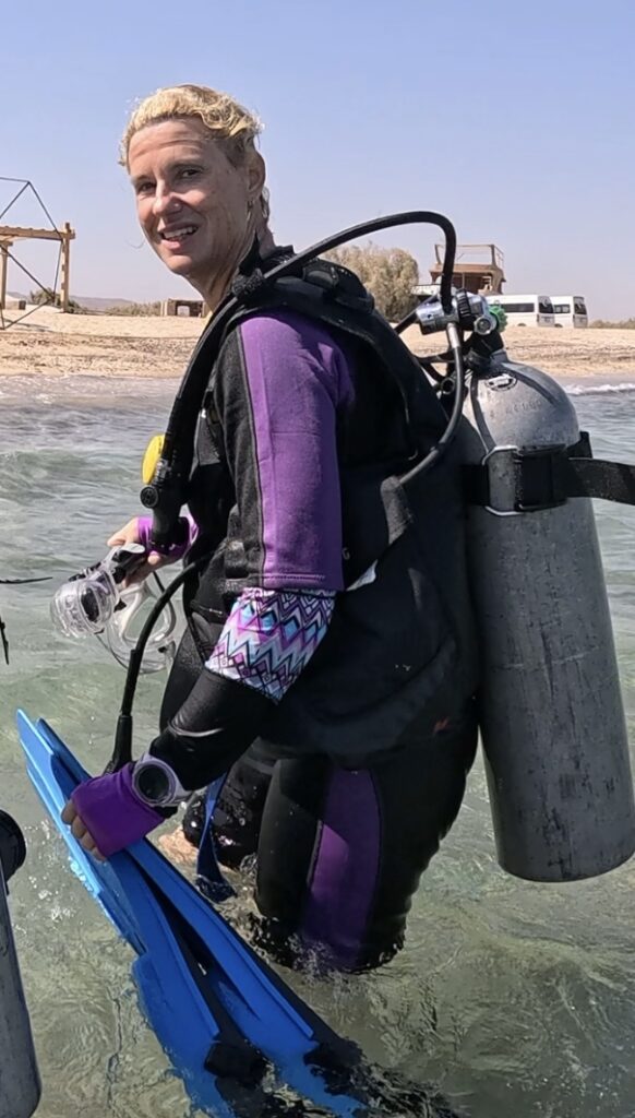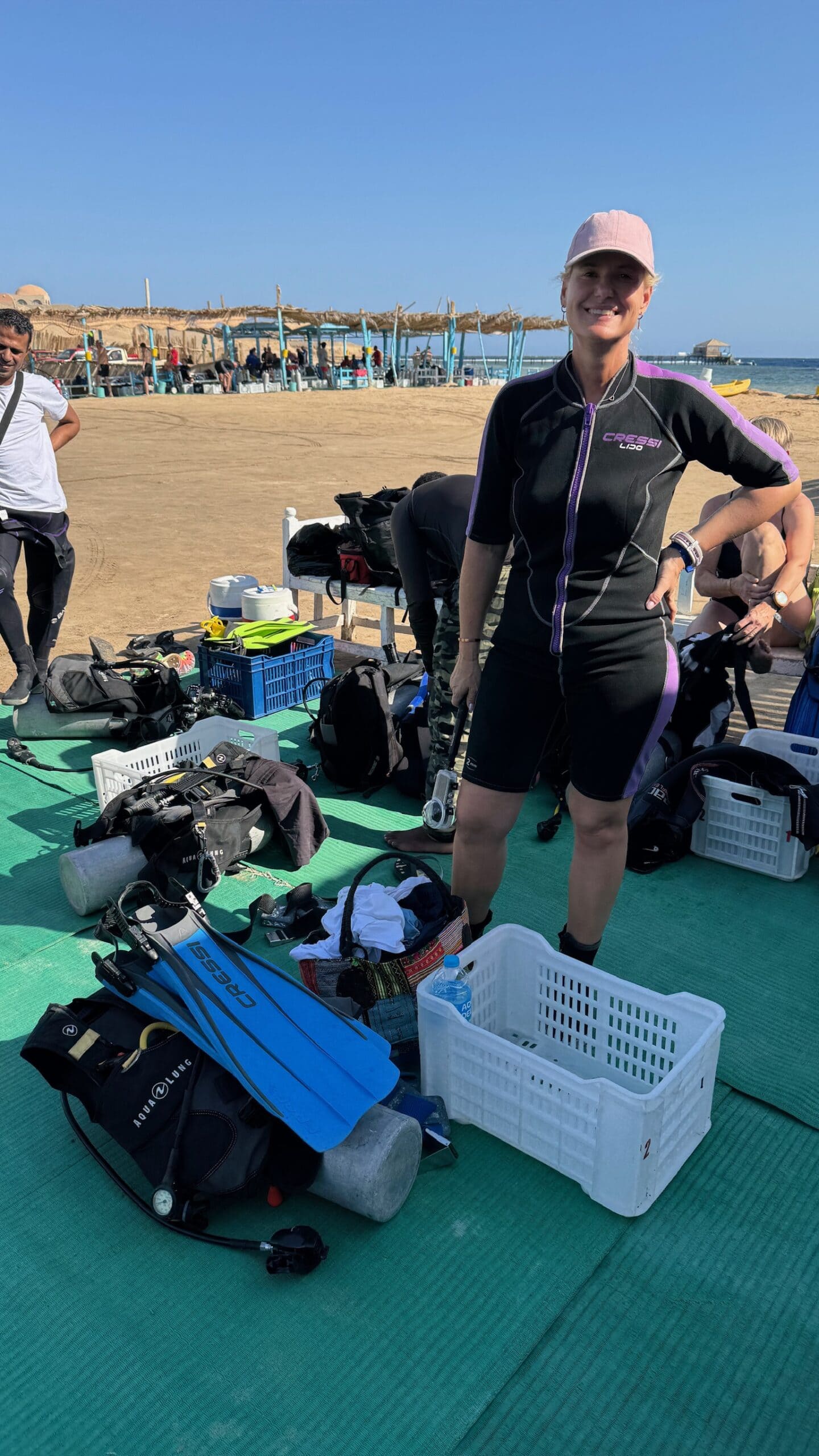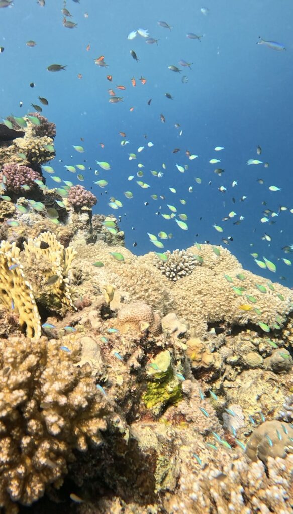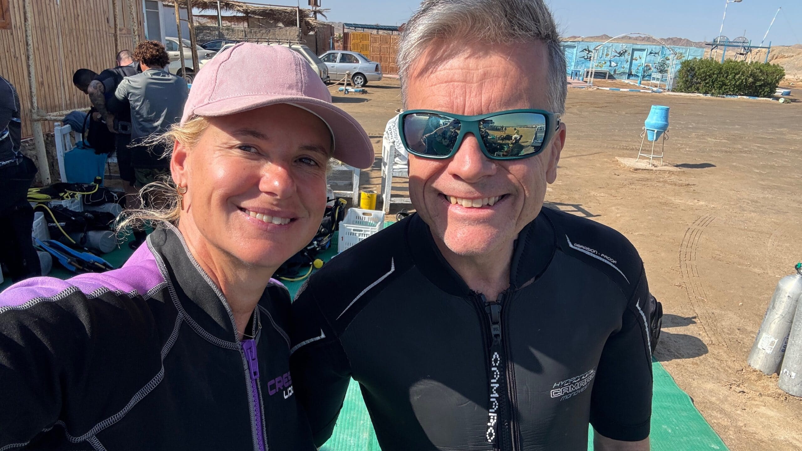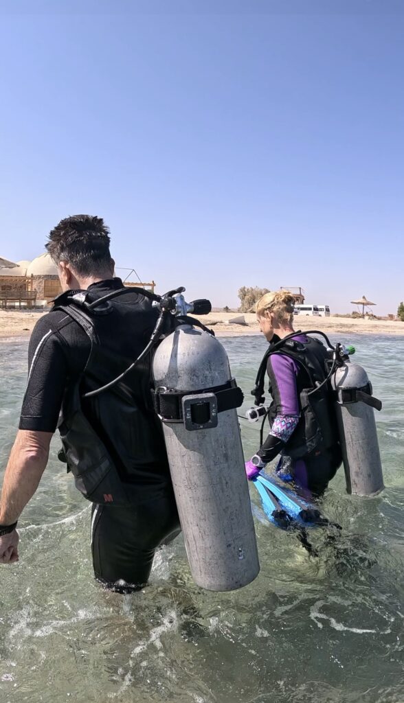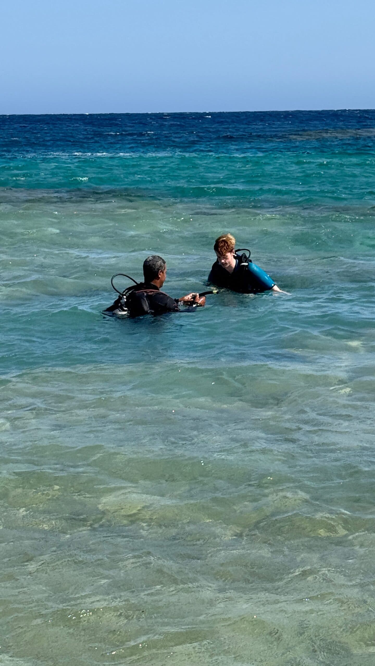 Um 8 Uhr war Tagwache und gleich danach ging’s zum Frühstück. Um 8:45 Uhr waren wir bei der Tauchbasis, die gleich bei uns ums Eck ist. Dann ging’s 20 Minuten mit dem Kleinbus nach Süden hinter El Quseir.