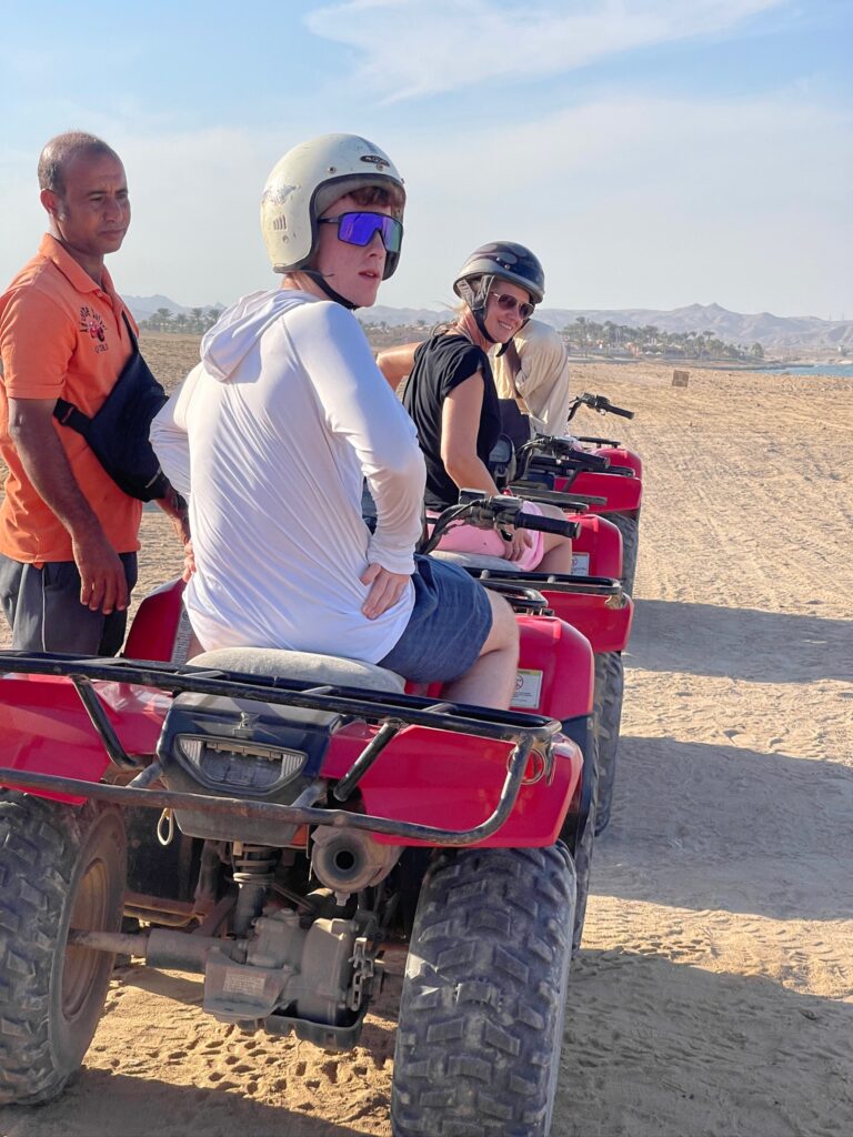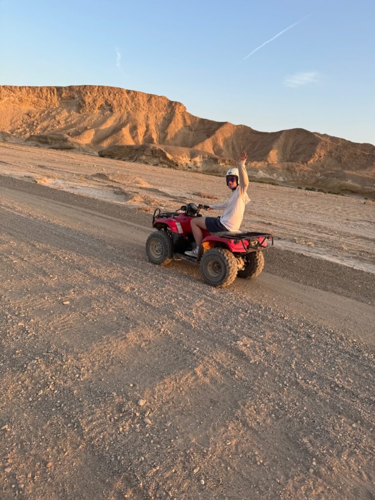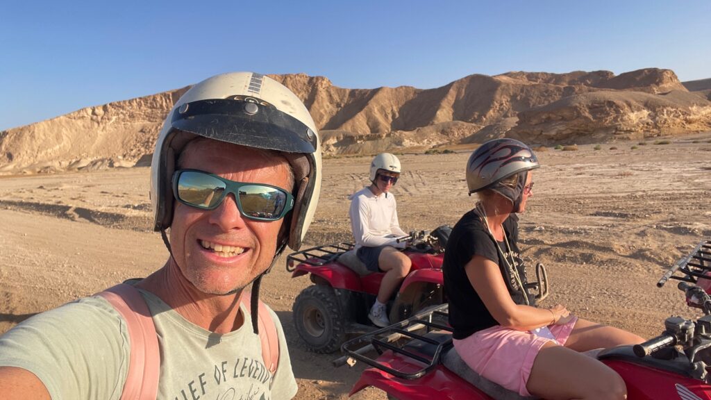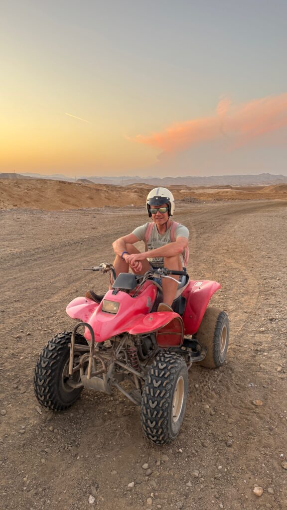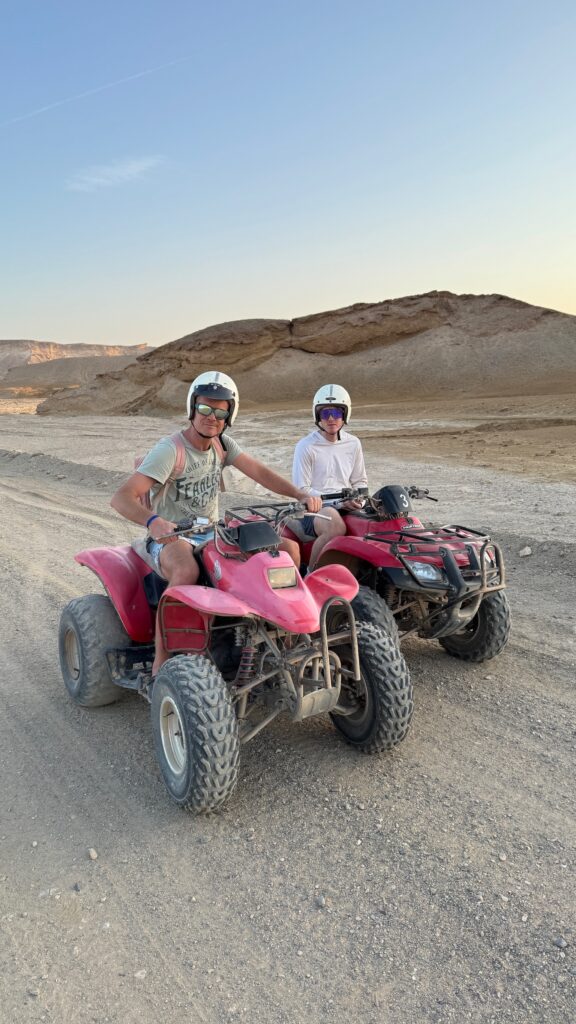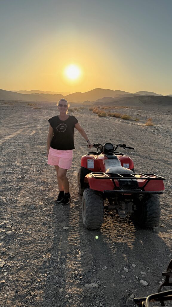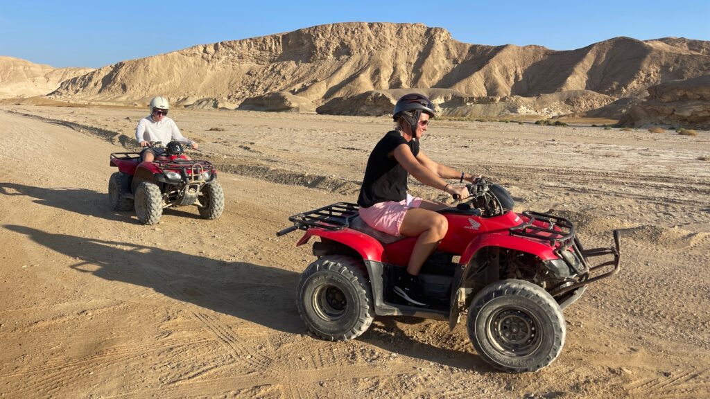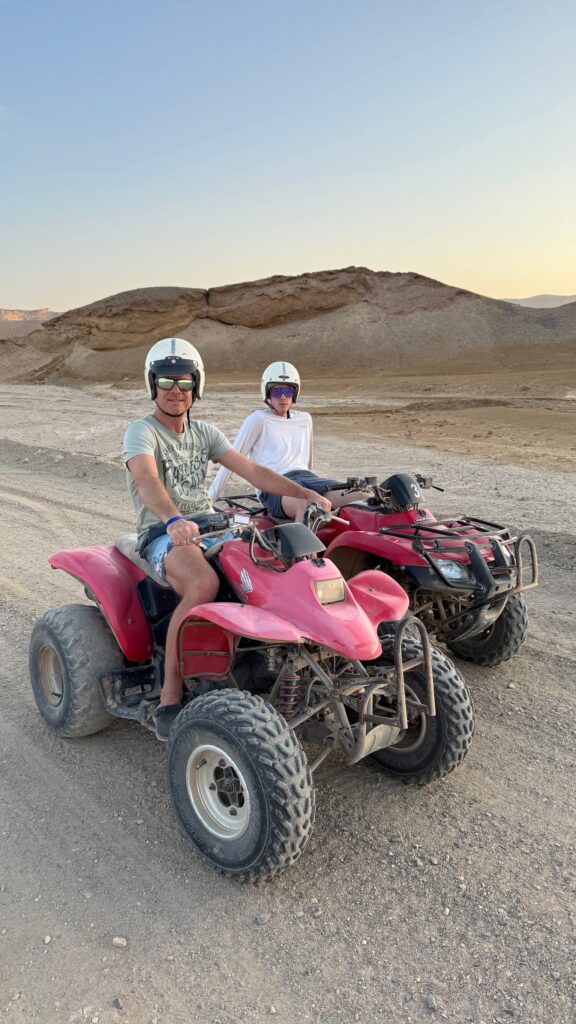 Um 15 Uhr gingen wir dann Quadfahren. Das war recht lustig. Wir sind bis zu 65 KMH gefahren durch die Steinwüste des Hinterland. Birgit hat voll mit dem Tempo mitgehalten. Beim ägyptischem Matterhorn haben wir einen Photostop gemacht. Das war witzig. Den nächsten Stop Haben wir bei einer Oase gemacht, der im Winter Wasser hat und recht viel Salzgehalt hat.