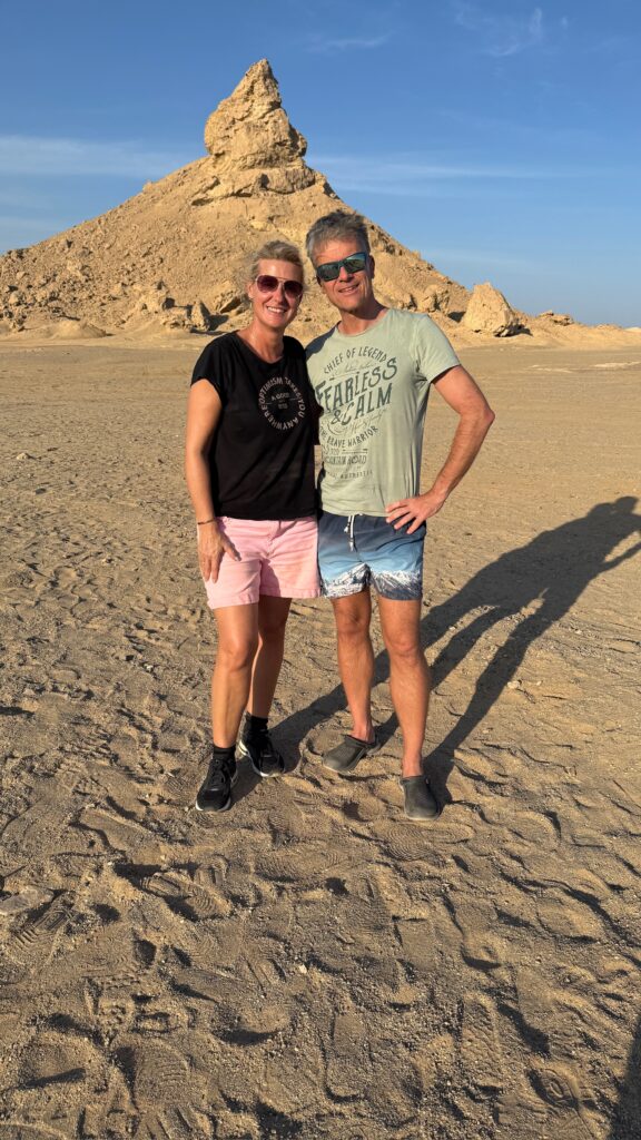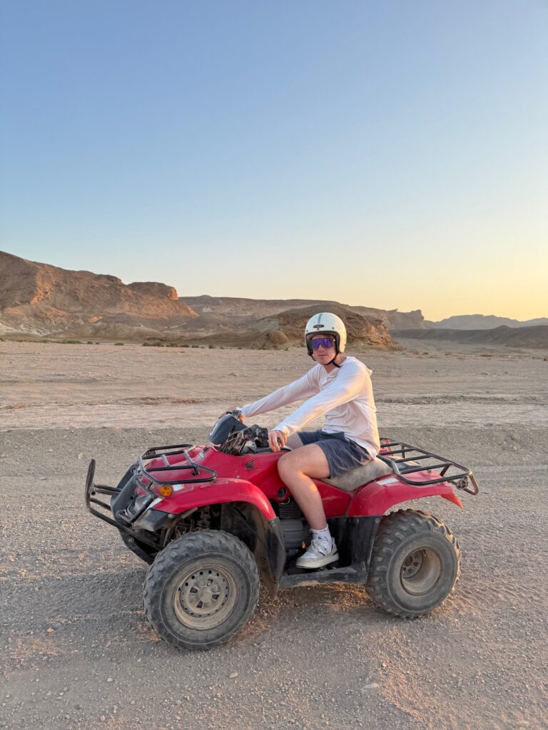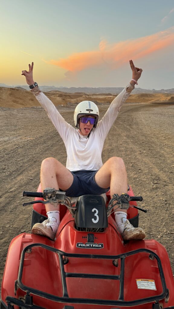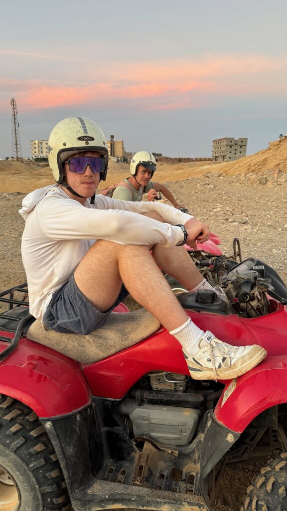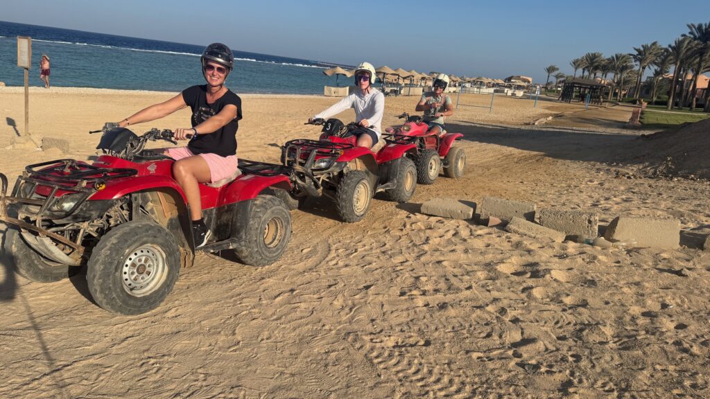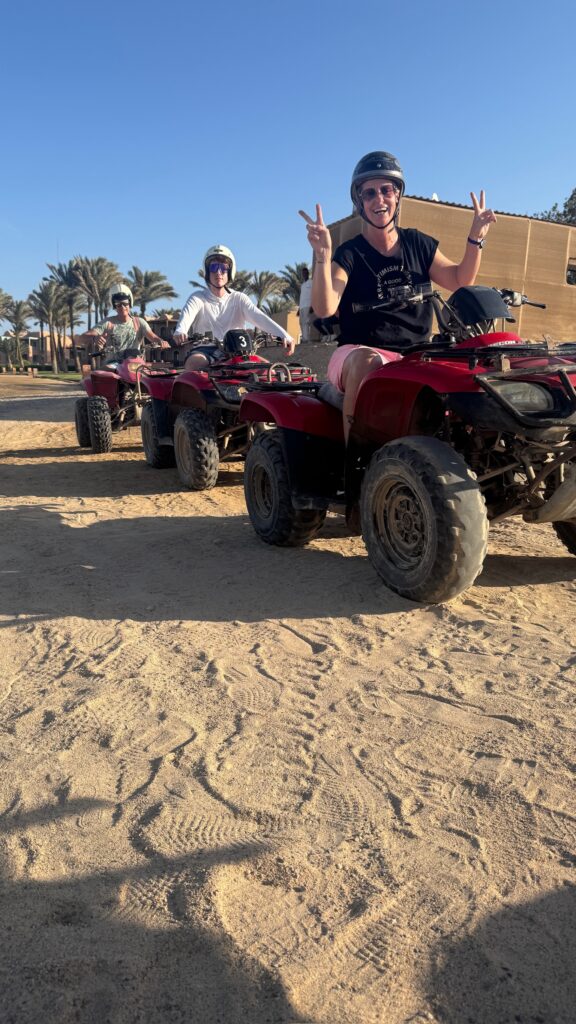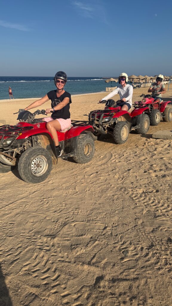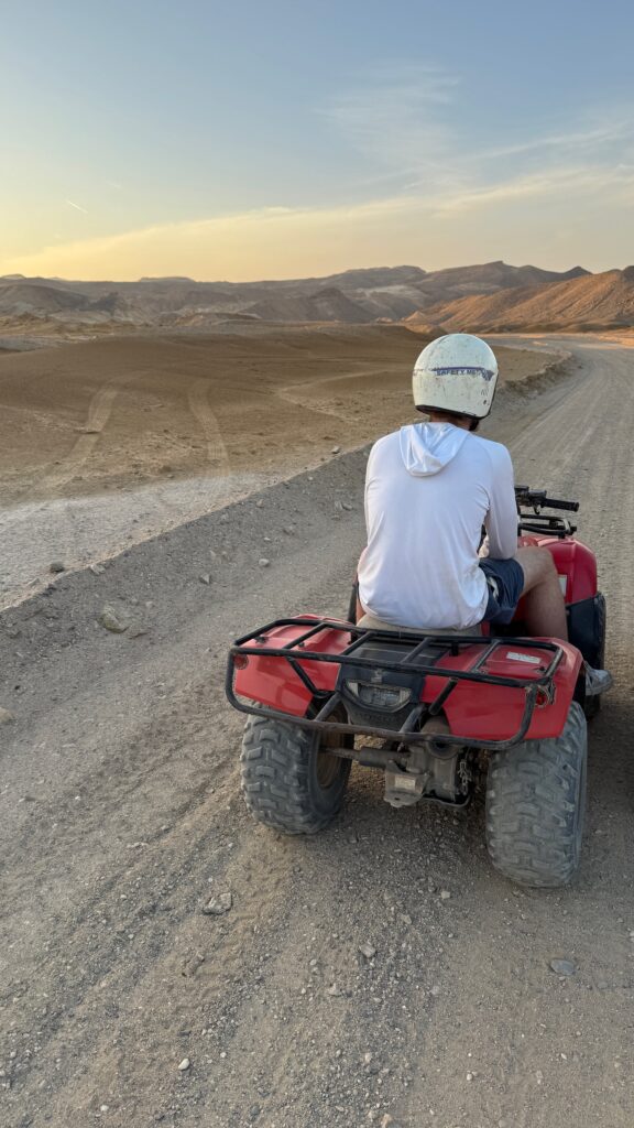 Um 15 Uhr gingen wir dann Quadfahren. Das war recht lustig. Wir sind bis zu 65 KMH gefahren durch die Steinwüste des Hinterland. Birgit hat voll mit dem Tempo mitgehalten. Beim ägyptischem Matterhorn haben wir einen Photostop gemacht. Das war witzig. Den nächsten Stop Haben wir bei einer Oase gemacht, der im Winter Wasser hat und recht viel Salzgehalt hat.