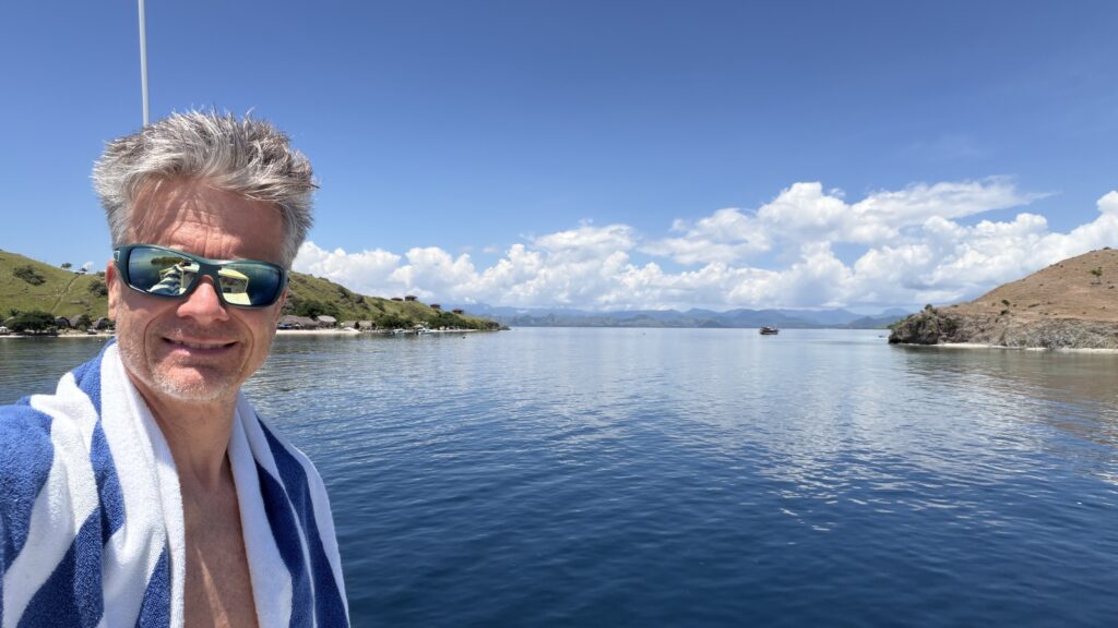 Heute fahren wir ein zweites Mal in den Norden des Komodo Nationalparks da stehen uns die drei gleichen Tauchgänge bevor. Heute begleitet uns ein Mann aus San Diego, aus Düsseldorf und ein junges Pärchen aus China. Bei der Fahrt zum 1. Divespot haben wir wieder Delphine gesehen.