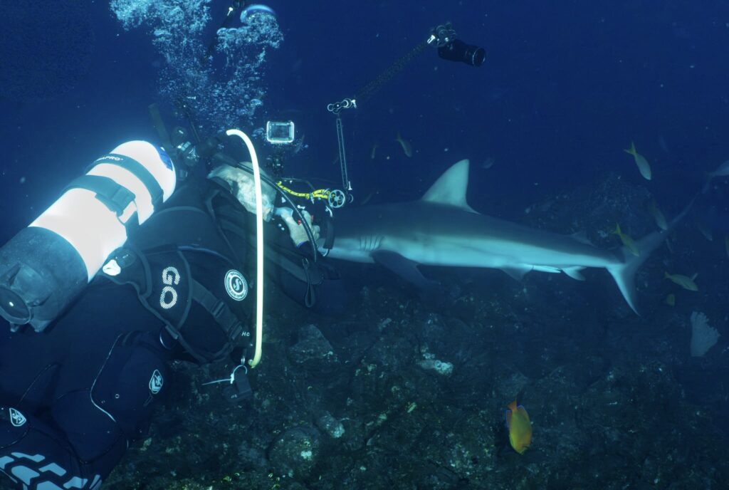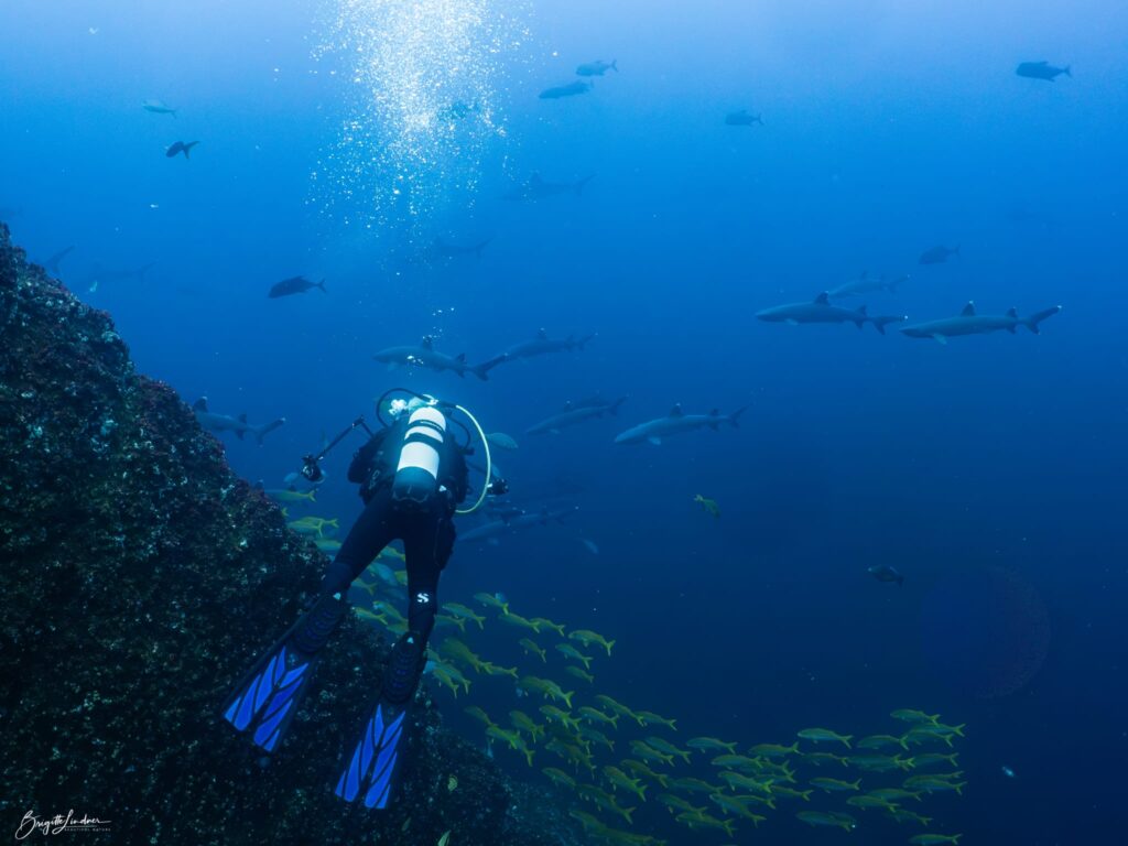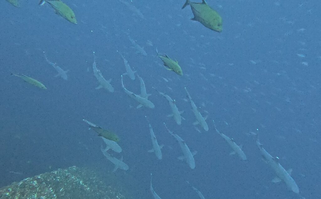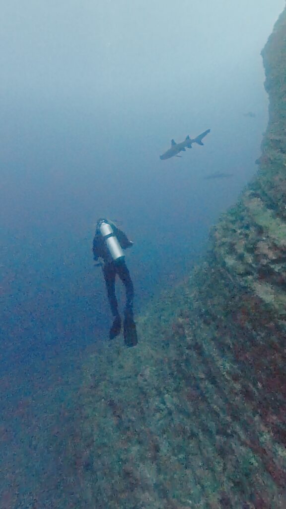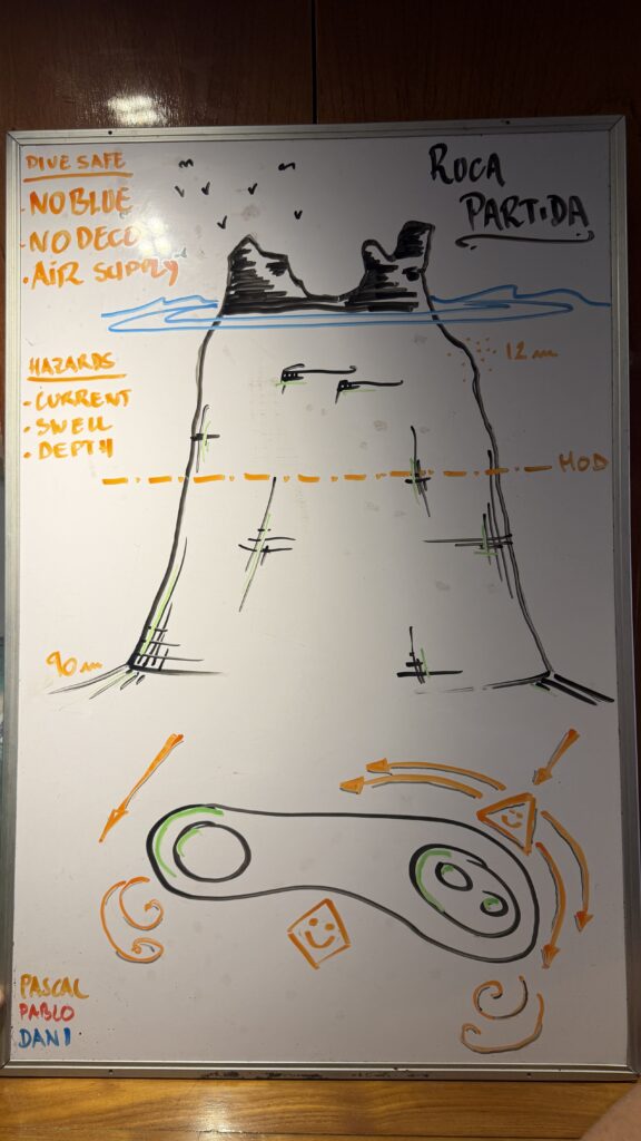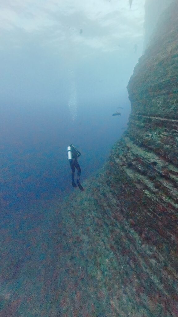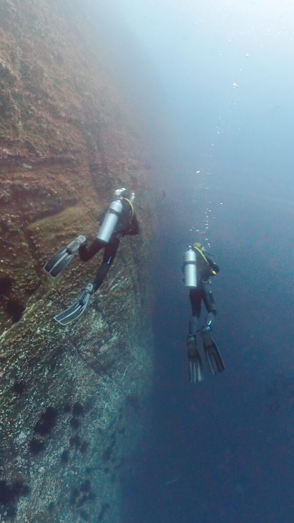 Die Tauchgänge hier waren aber auch sehr herausfordernd, da der Felsen unter Wasser 100 Meter steil bergabfällt und man beim Tauchen keinen Grund hat und so auch ständig auf seine Boyency und Tiefe achten musste.
