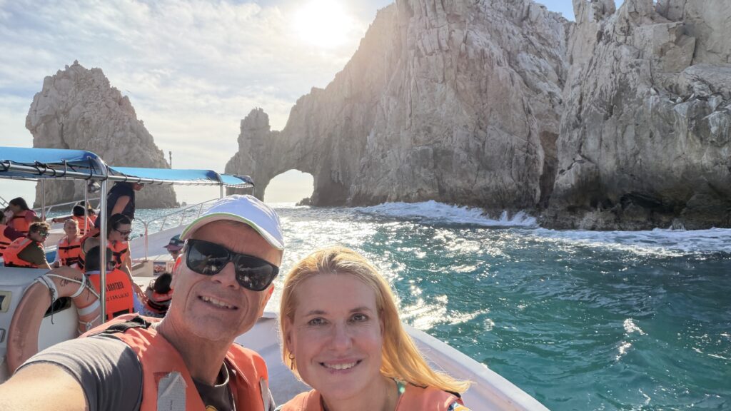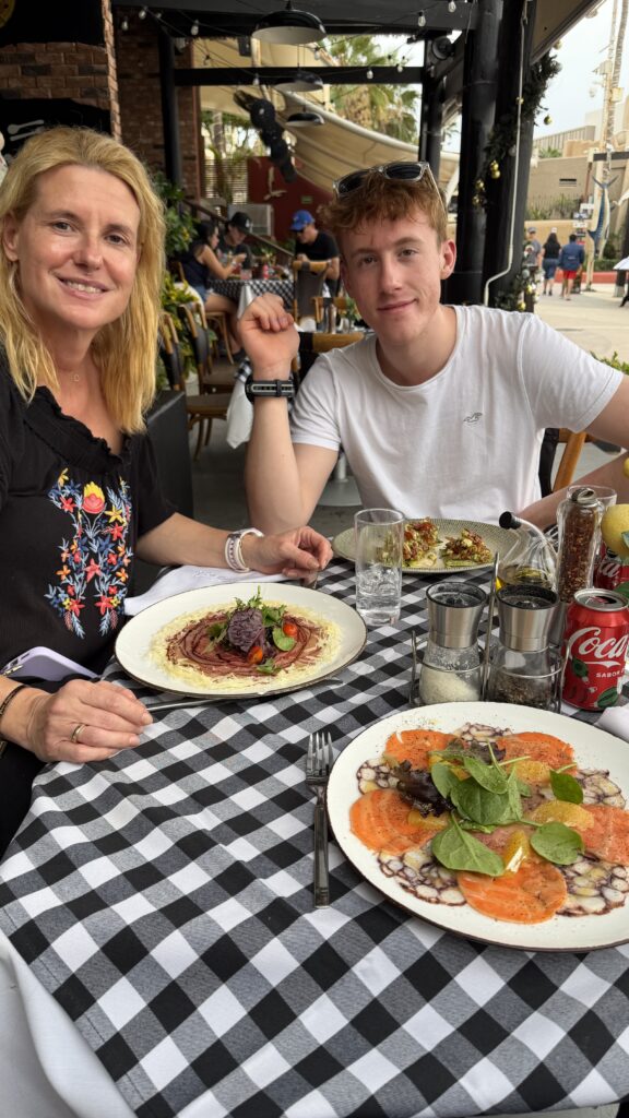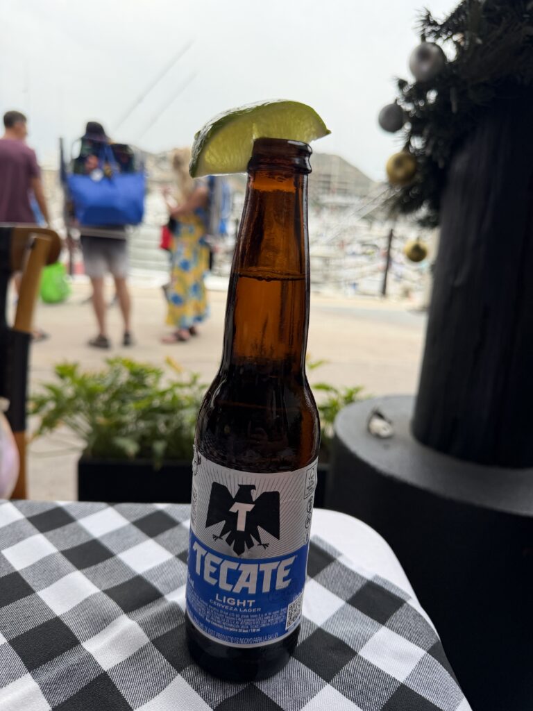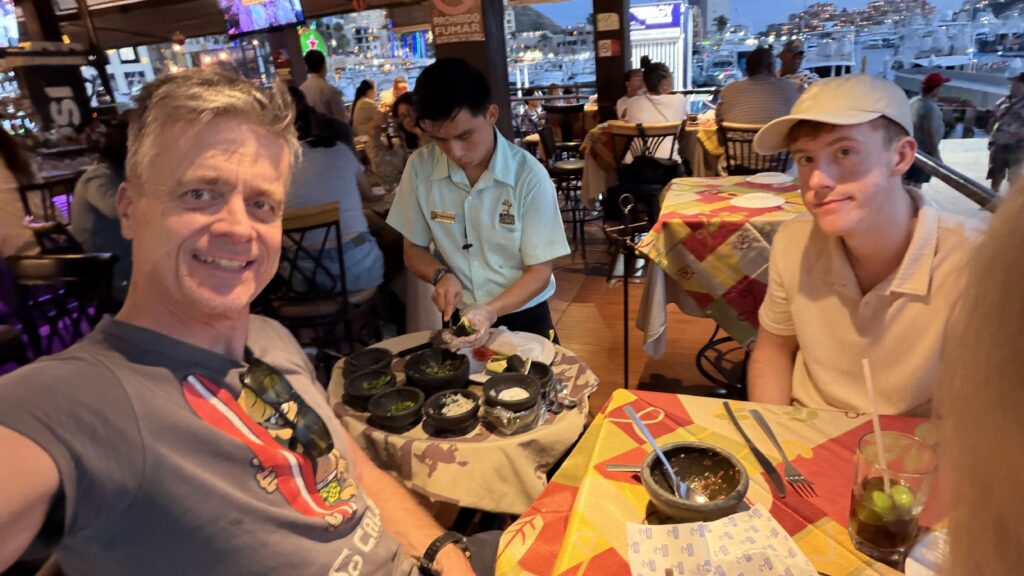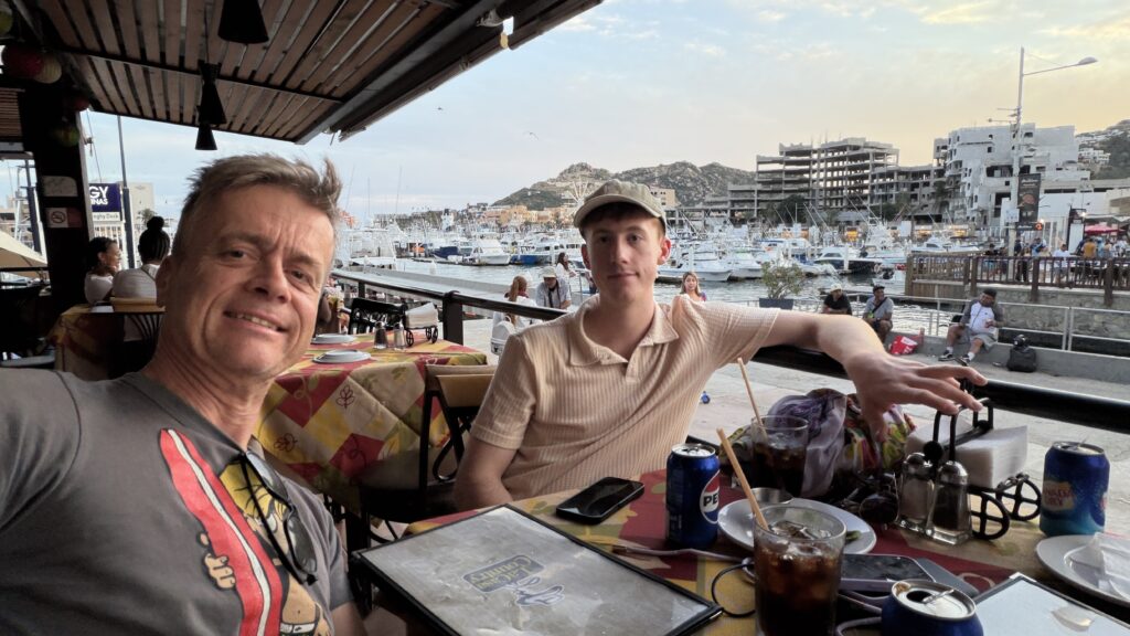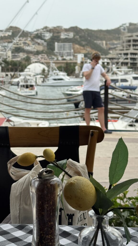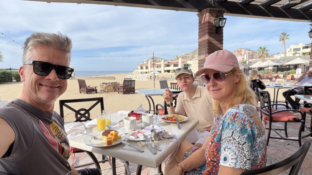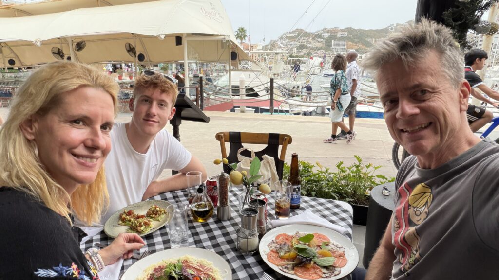 Nachdem die Zeitverschiebung in den Westen recht einfach ist, sind wir recht normal in der Früh aufgewacht und waren recht gemütlich um 9:30 UhrMittagessen mit Blick aufs Meer.