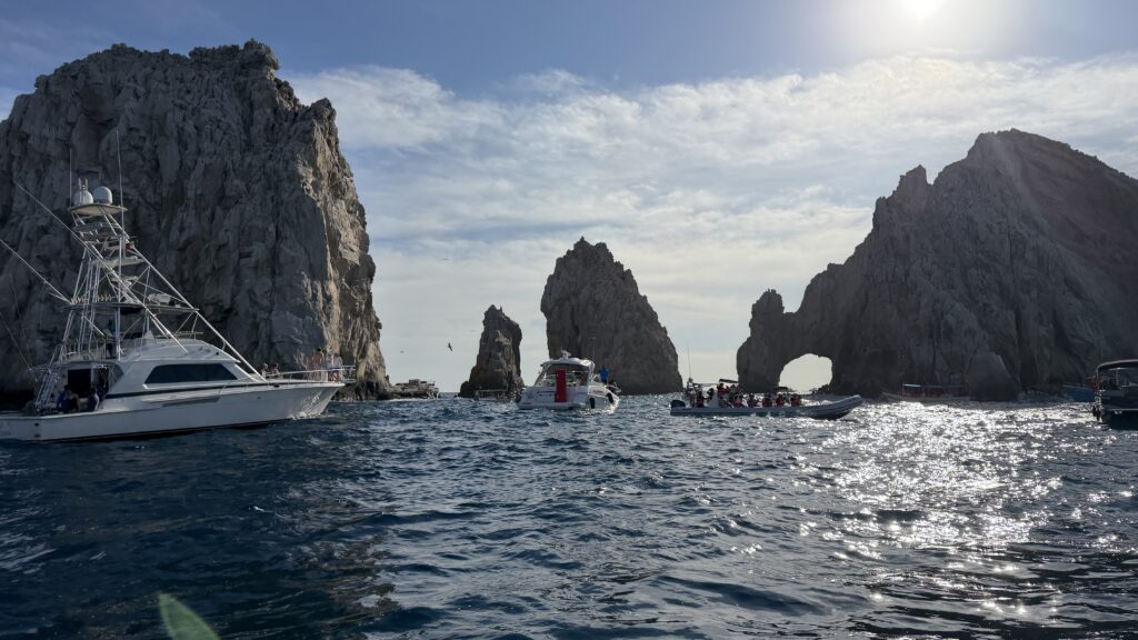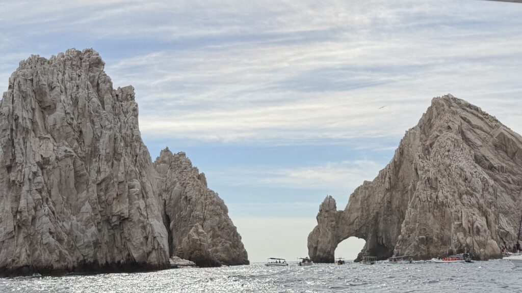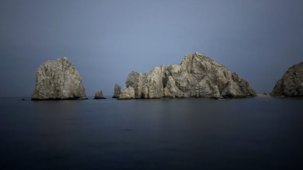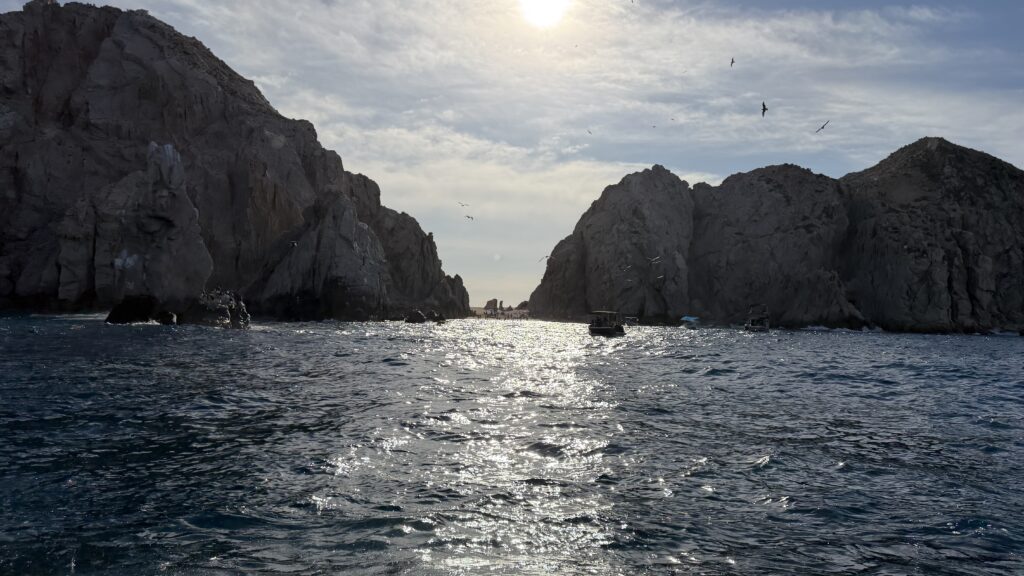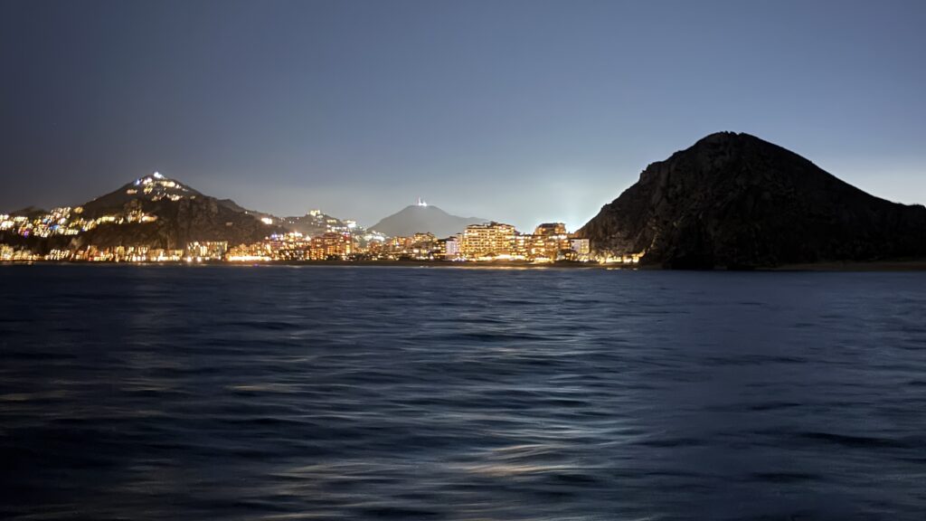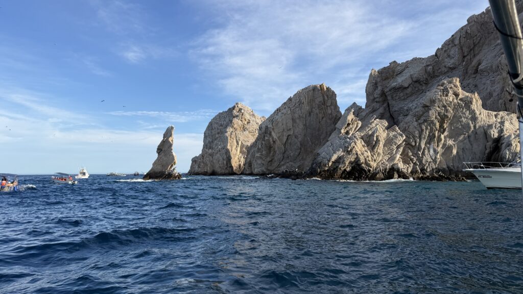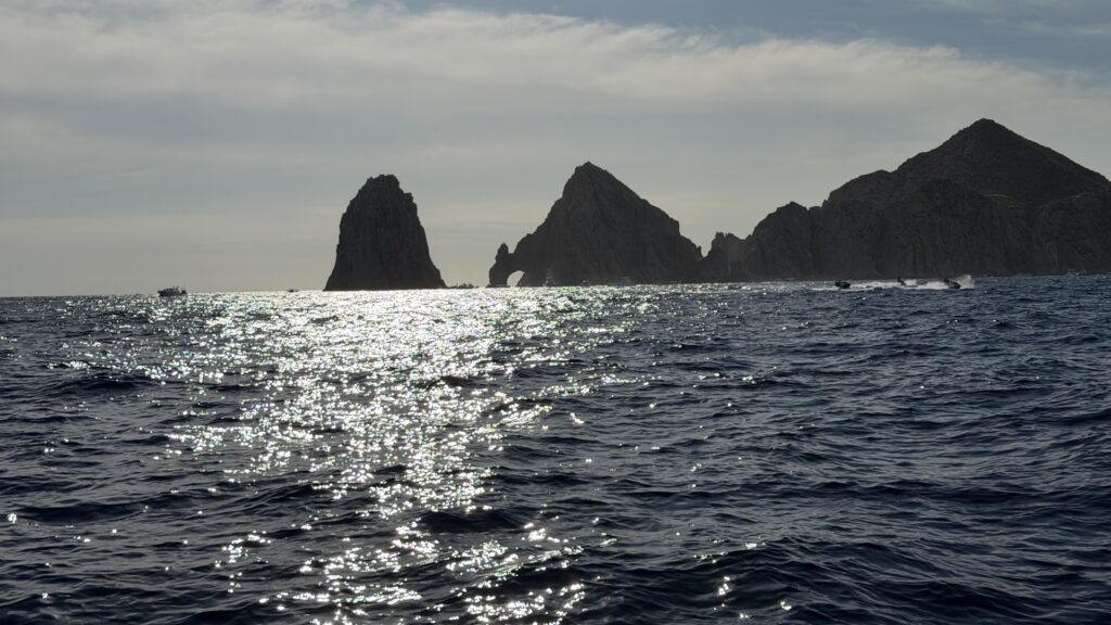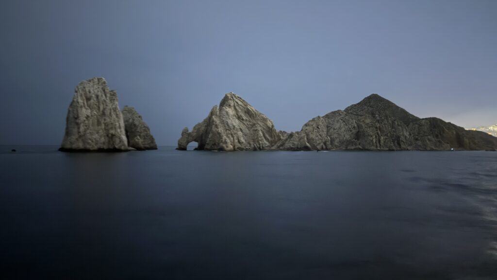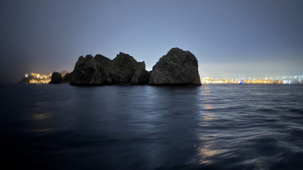 Vorbei an der Felsformation noch in der Dämmerung, wunderschön. Um 7:00 Uhrwar es soweit, Nico hatte einen Marlin an der Angel. Es war ein 2 m großer Marlin und Nico tat sich wirklich sehr sehr schwer die Anke einzuziehen. Der Fisch hatte eine sehr starke Kraft, aber am Ende hat er verloren.