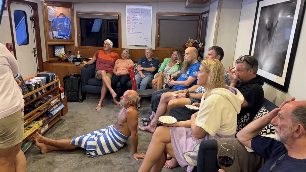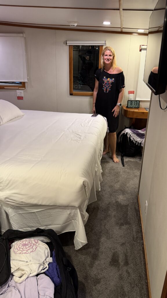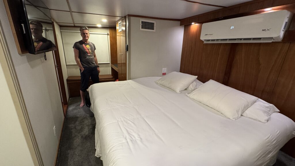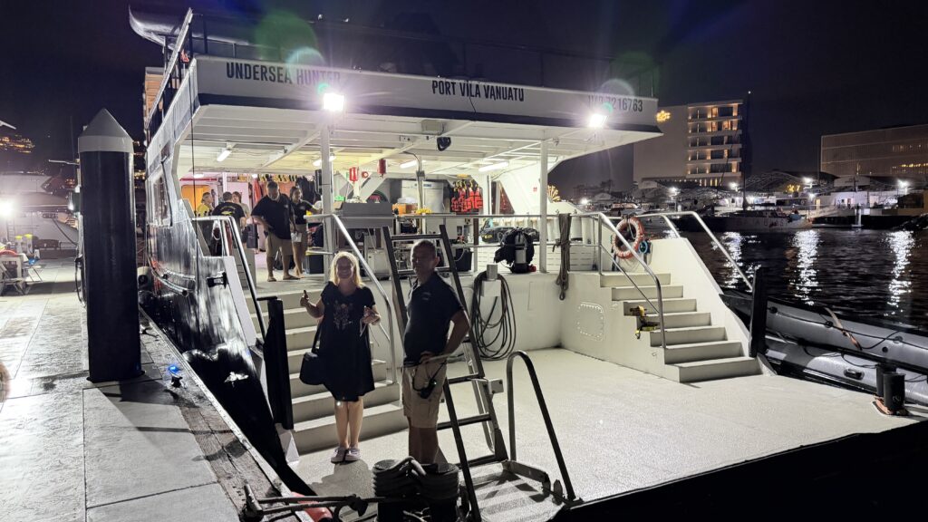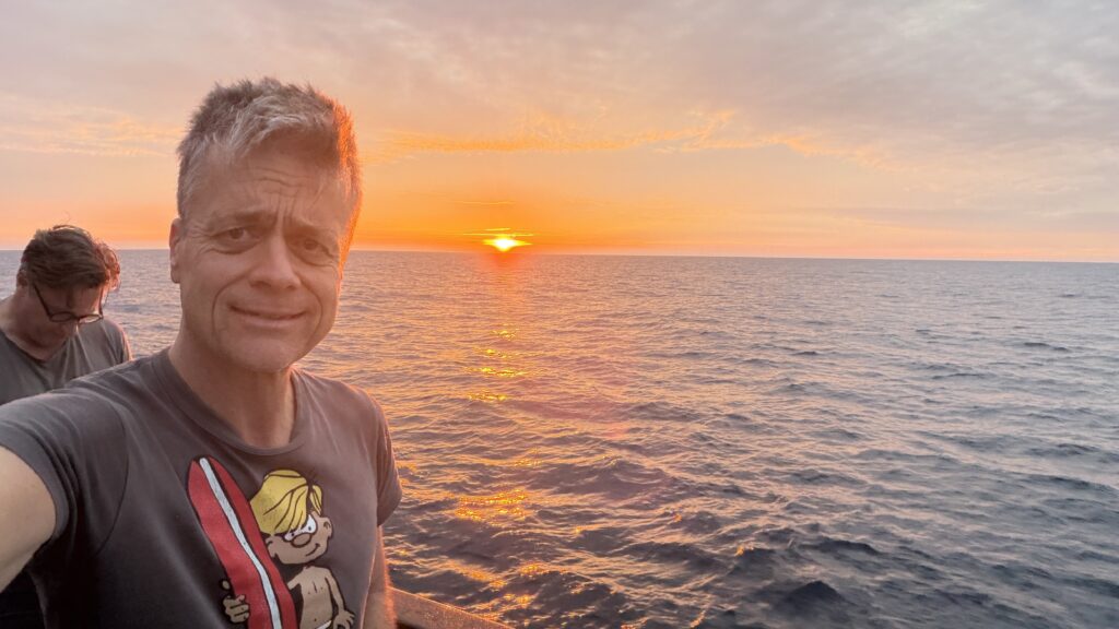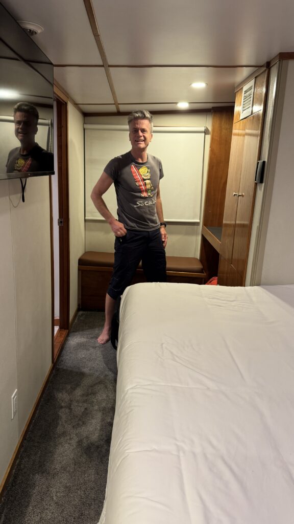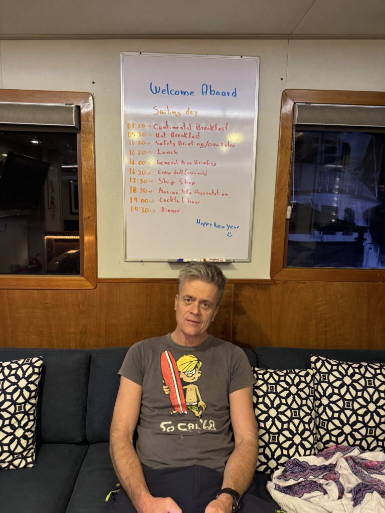 Um 18:00 Uhr war dann großes Treffen in der Tauchbasis mit allen Tauchkollegen und kurz vor 20:00 Uhr sind wir dann zum Schiff gefahren und haben unsere Kabine bezogen. Jetzt stehen 30 Stunden Folter beziehungsweise hohe Wellen vor uns. Und das alles am 31. Dezember 2025 zu Silvester, Juchuuuu (wir machen das aber alles freiwillig 😜).