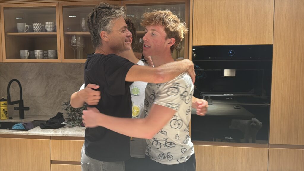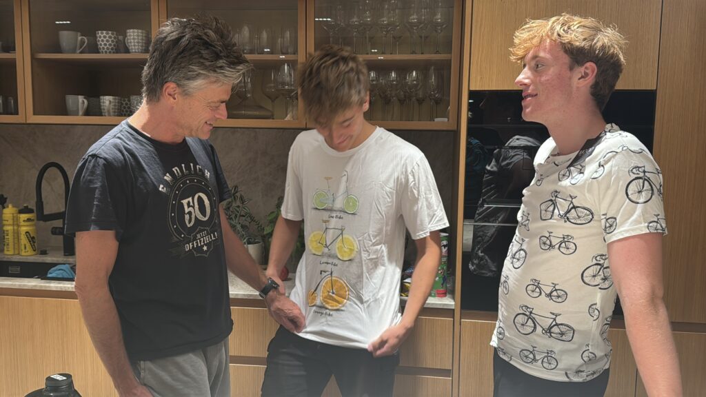 Gestern waren wir noch bei den Schrenks zum Carboloading am Abend eingeladen (Nudelessen). Moritz war auch dabei. Die letzten Vorbereitungen haben wir dann bei den Schrenks gemacht. Gummibänder mit quick Verschluss von Josef auf die Laufschuhe gegeben und den neuen Neo von Luca repariert, weil Estella beim 6h Swim diesen mit ihren Nägeln an 20 Stellen eingerissen hat. Den neuen Neo von Luca wird dann Moritz heute verwenden. Nico wird als einziger ohne Neo schwimmen. Dadurch hat er doch einen großen Nachteil beim Schwimmen, weil man schneller ist, dafür gewinnt er ein bisserl in der Wechselzone, weil er ihn nicht ausziehen muss.