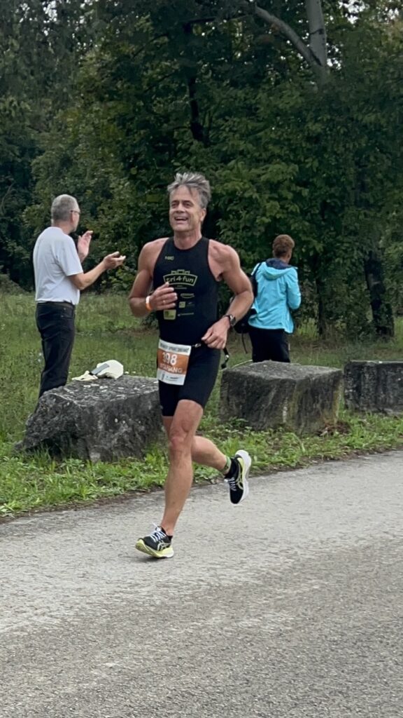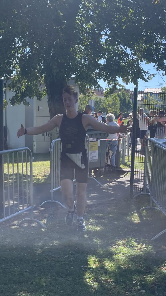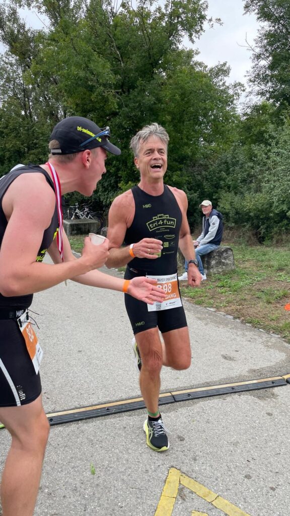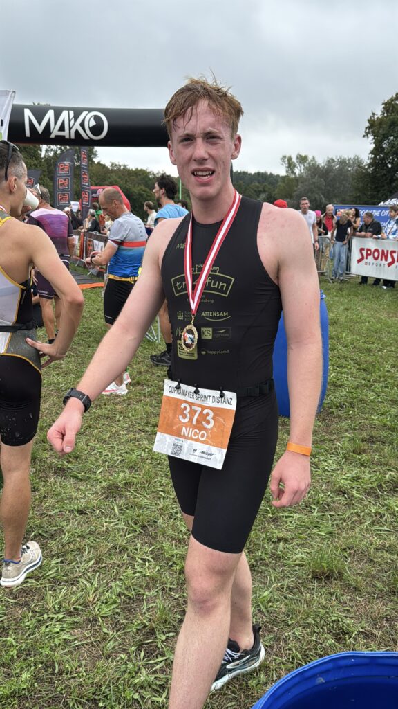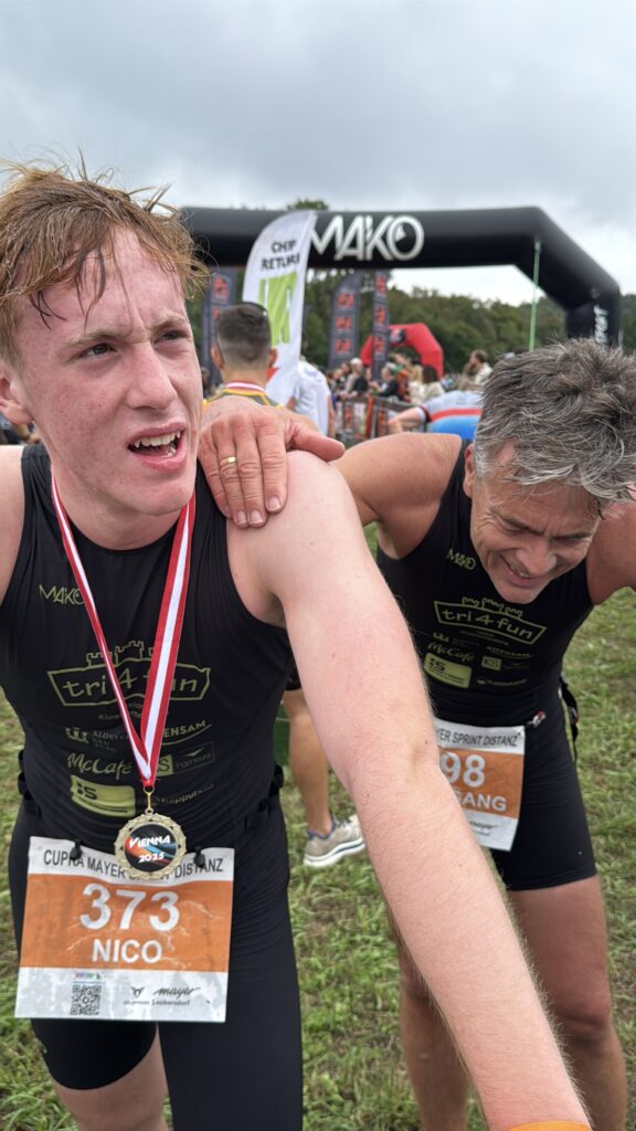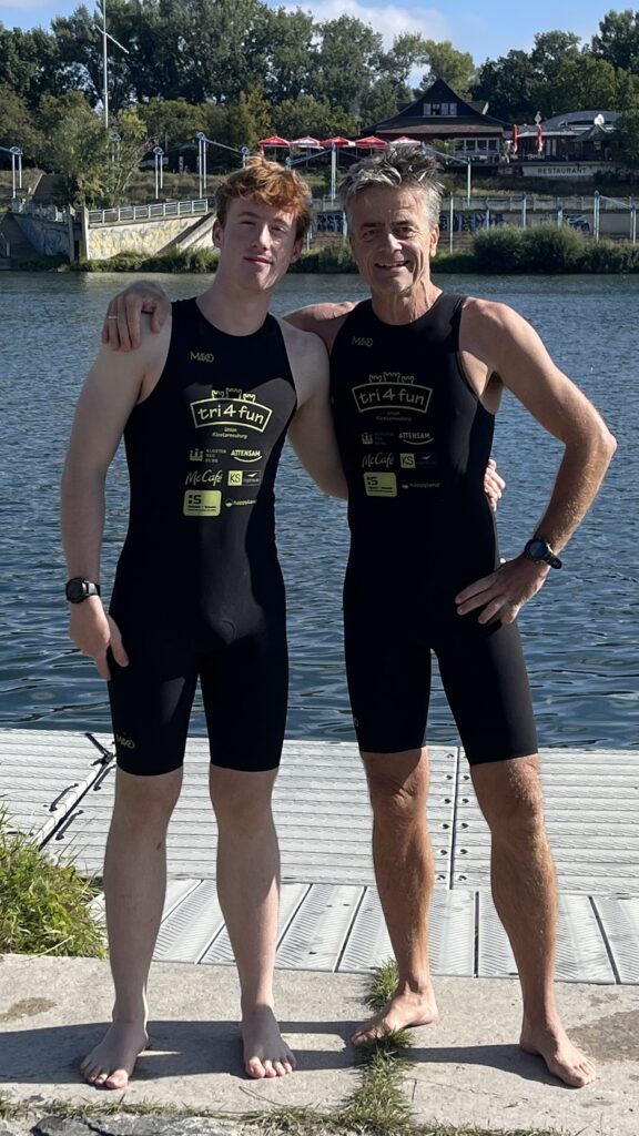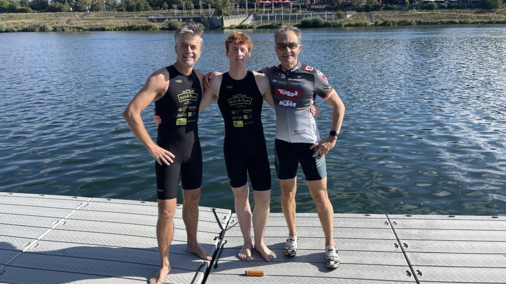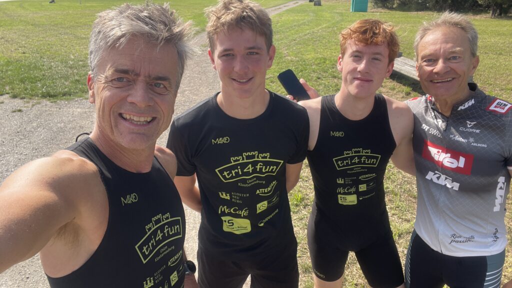 Um 11 Uhr war dann Start und zwar ein Wasserstart. Moritz war unser schnellster (von 250 Startern als 8er aus dem Wasser), Nico war der erste Nichtneopren Schwimmer aus dem Wasser (so rd. 16er) und ich war auch nicht viel langsamer. Wechselzeit schnell absolviert. Am Rad war dann ich der schnellste, obwohl ich nur mit dem roten Canyon gefahren bin (mit vorderem Kotflügel) und zwar knapp unter 30 Minuten. Nico war rd. 15 Sekunden langsamer und Moritz rd. 1 Minute langsamer. Dafür war dann Moritz wieder der Schnellste beim Laufen mit unter 19 Minuten. Ich bin knapp unter 23 Minuten gelaufen und Nico war so 15 Sekunden wieder langsamer als ich. Moritz ist mit einer Gesamtzeit von knapp unter 1 Stunde 6 Minuten overall 10. geworden. Nico hat mit einer Zeit von knapp unter 1 Stunde 10 Minuten die Jugendwertung klar gewonnen und ich war mit meiner Zeit von 1 Stunde 10 Minuten und 15 Sekunden sehr happy. Wir waren alle super happy. Unsere Supporter waren großartig und haben uns zu Höchstleistungen angespornt. Mit einer Laufpace von unter 5 Minuten auf den Km war ich auch überrascht. Leider hat am Abend dann mein Knie zum Schmerzen begonnen und es dauerte rd. 3 Wochen bis wieder alles gut wurde. Um 13 Uhr war dann die Siegerehrung und Nico stand ganz oben am Podium und hat seinen ersten Triathlonpokal gewonnen. Moritz ist in der Juniorenwertung Dritter geworden. Ich bin in der age group 55-60 Jahre 6. geworden.