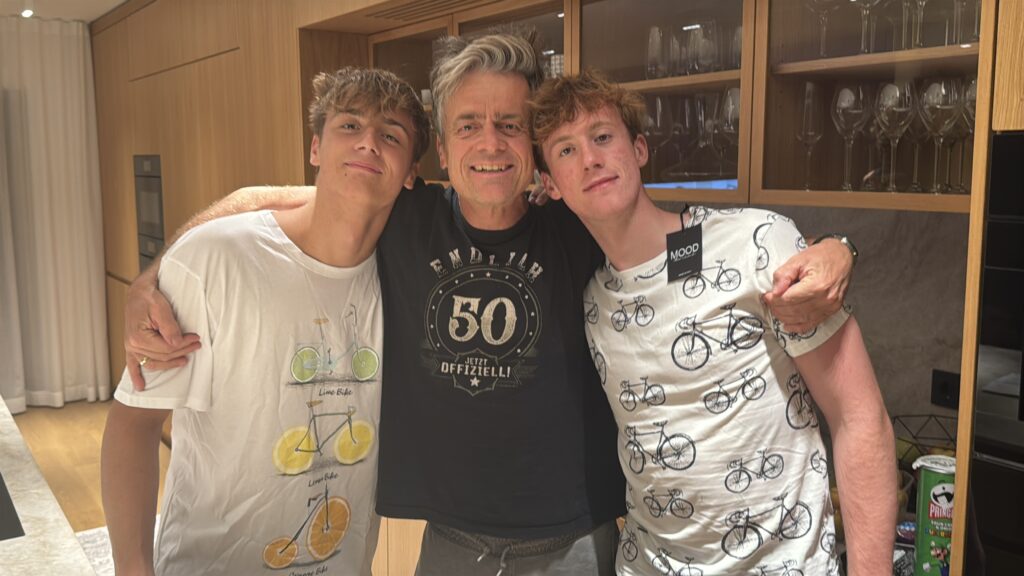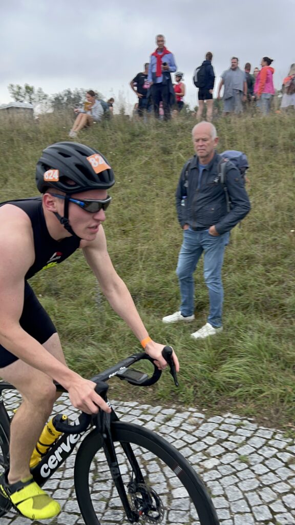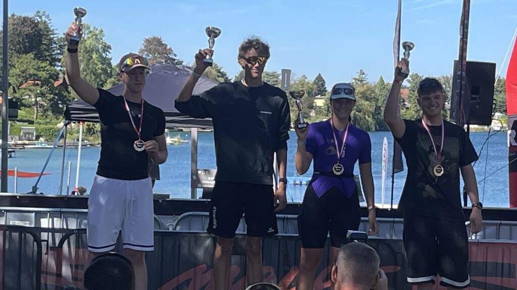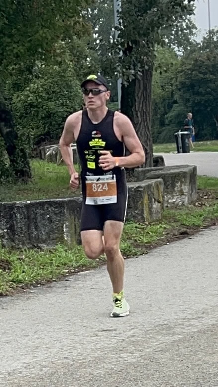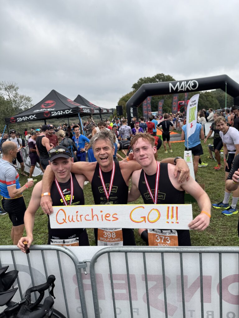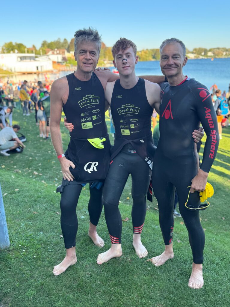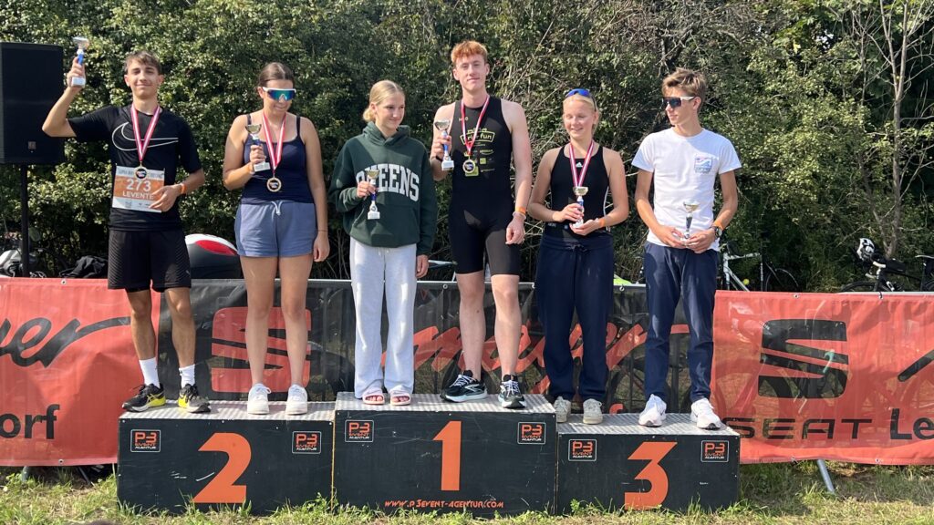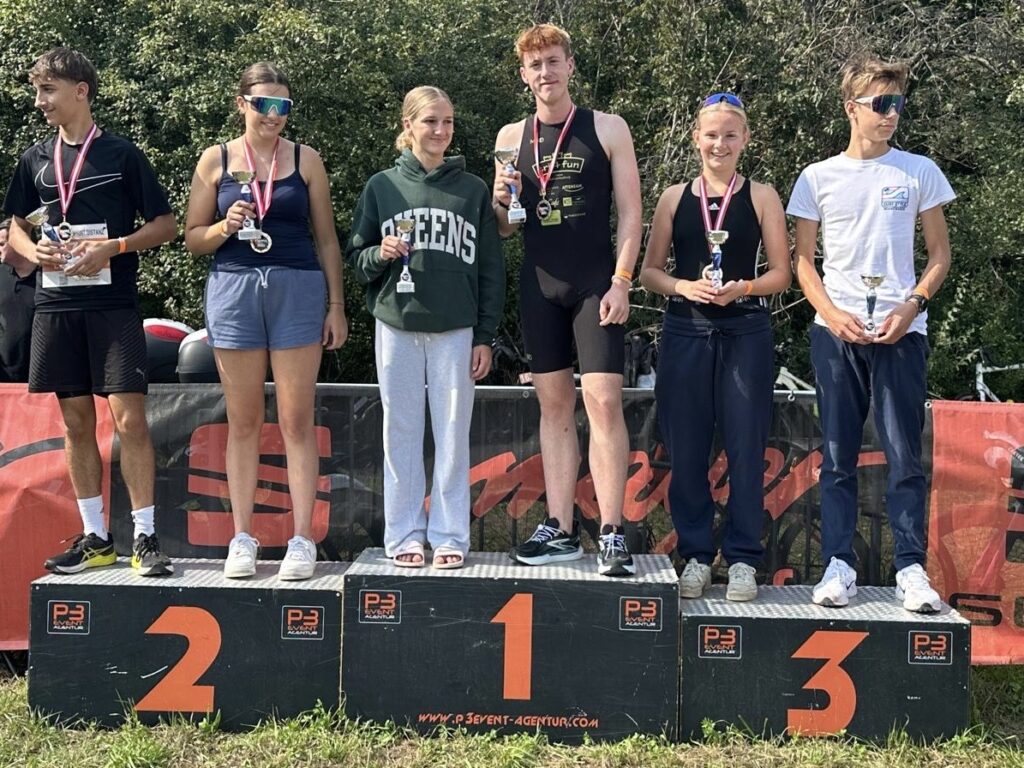 Um 11 Uhr war dann Start und zwar ein Wasserstart. Moritz war unser schnellster (von 250 Startern als 8er aus dem Wasser), Nico war der erste Nichtneopren Schwimmer aus dem Wasser (so rd. 16er) und ich war auch nicht viel langsamer. Wechselzeit schnell absolviert. Am Rad war dann ich der schnellste, obwohl ich nur mit dem roten Canyon gefahren bin (mit vorderem Kotflügel) und zwar knapp unter 30 Minuten. Nico war rd. 15 Sekunden langsamer und Moritz rd. 1 Minute langsamer. Dafür war dann Moritz wieder der Schnellste beim Laufen mit unter 19 Minuten. Ich bin knapp unter 23 Minuten gelaufen und Nico war so 15 Sekunden wieder langsamer als ich. Moritz ist mit einer Gesamtzeit von knapp unter 1 Stunde 6 Minuten overall 10. geworden. Nico hat mit einer Zeit von knapp unter 1 Stunde 10 Minuten die Jugendwertung klar gewonnen und ich war mit meiner Zeit von 1 Stunde 10 Minuten und 15 Sekunden sehr happy. Wir waren alle super happy. Unsere Supporter waren großartig und haben uns zu Höchstleistungen angespornt. Mit einer Laufpace von unter 5 Minuten auf den Km war ich auch überrascht. Leider hat am Abend dann mein Knie zum Schmerzen begonnen und es dauerte rd. 3 Wochen bis wieder alles gut wurde. Um 13 Uhr war dann die Siegerehrung und Nico stand ganz oben am Podium und hat seinen ersten Triathlonpokal gewonnen. Moritz ist in der Juniorenwertung Dritter geworden. Ich bin in der age group 55-60 Jahre 6. geworden.