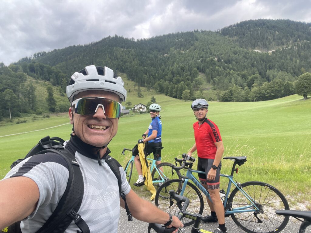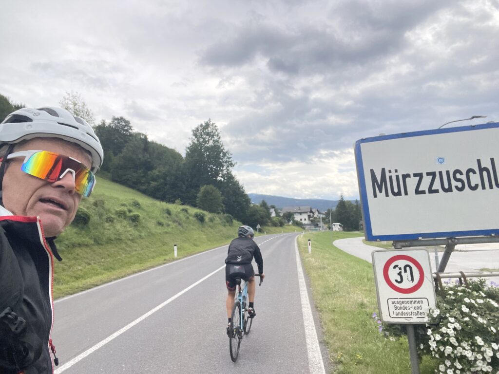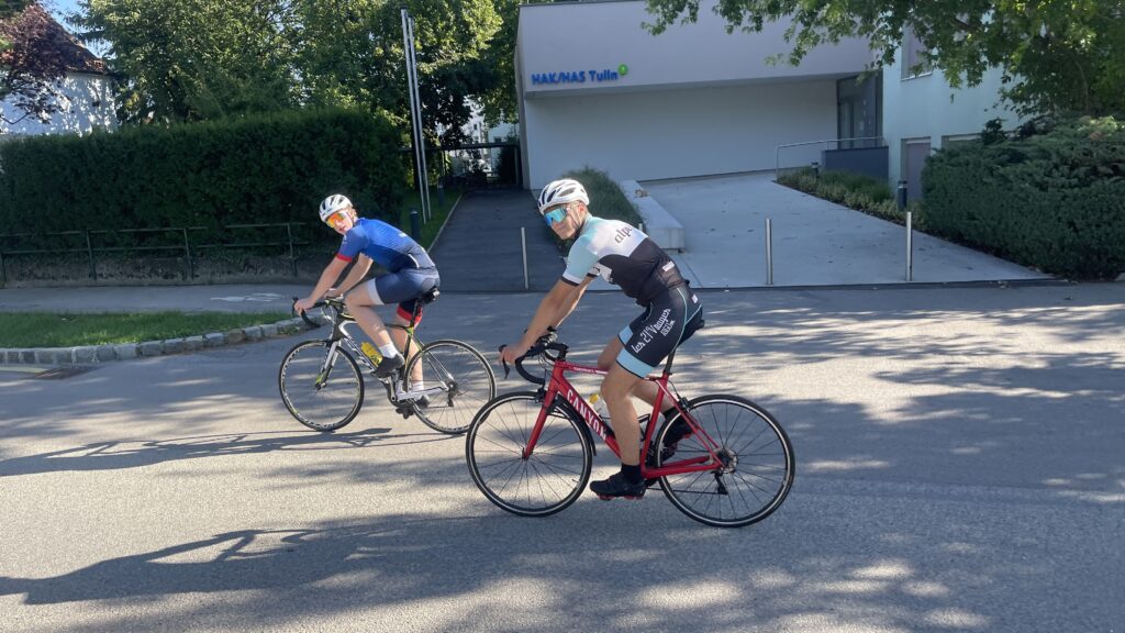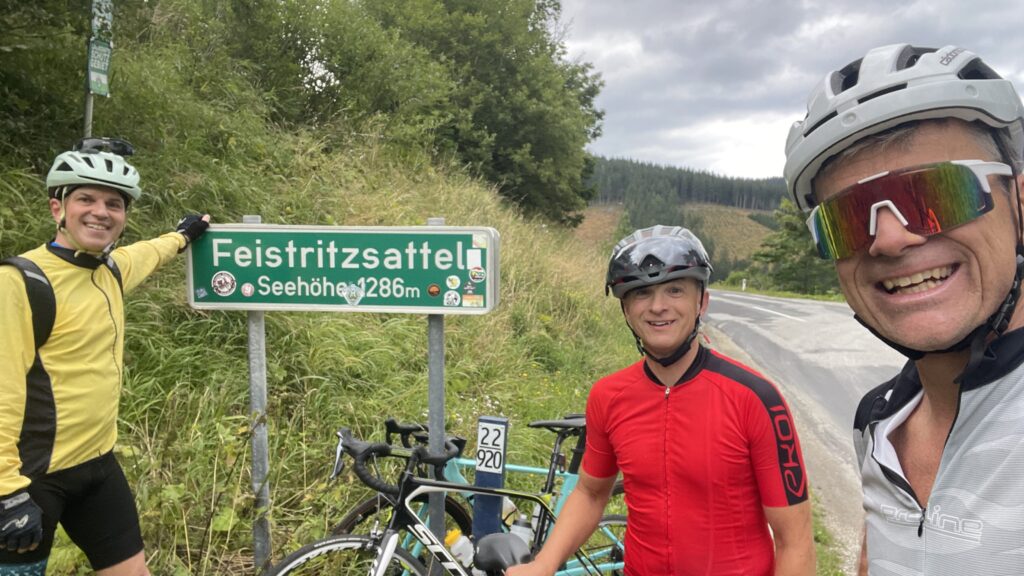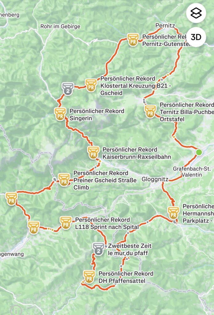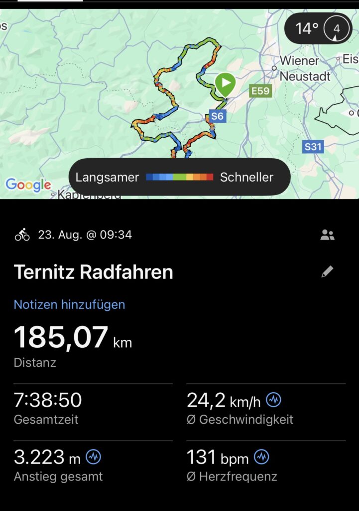 Bereits genau vor 7 Jahren bin ich mit Christian nach Ternitz gefahren und sind die Radstrecke damals schon ident gefahren. Heute war später Treffpunkt um 08.00 Uhrbei mir, weil ich am Abend davor am Neustifter Kirtag war. Ich habe leider viel zu viel Wein und Shots getrunken und bin erst um 1:30 Uhr ins Bett gekommen. Aufgrund späten Schlafengehens und viel Alkohol habe ich nicht gut geschlafen. Ich habe mich um 7 Uhr aufwecken lassen und meine Bodybatterie war bei nur 25 %, mir ging es auch nicht gut. Aber wenn man sich was ausmacht, dann sagt man nicht ab. Die erste halbe Stunde bin ich nur am Boden gelegen, dann habe ich mir ein bisserl was zum Frühstücken gemacht und Wasserflaschen mit Carbo und Iso vorbereitet. Um 8 Uhr war Christian dann vor der Tür, mit rd. 8 Minuten Verspätung sind wir dann losgefahren, Christian musste fahren. So gegen 9:30 Uhr waren wir dann in Ternitz, wo wir Andi getroffen haben. Christian und Andi bereiten sich auf den Ötztaler Radmarathon in Sölden (Kütai – Brenner – Jaufenpass – Timmelsjoch mit 5.500 Höhenmeter) vor.