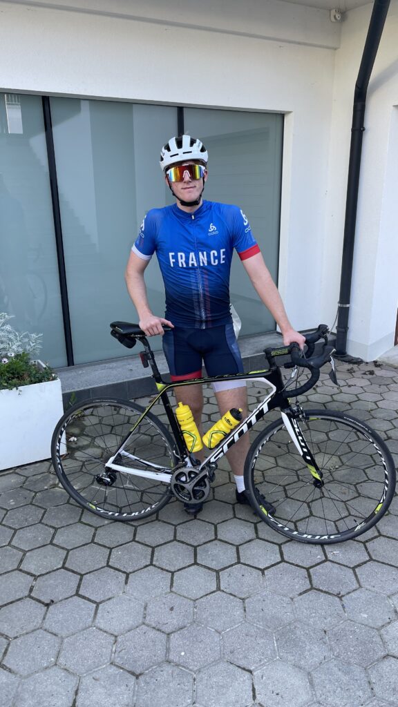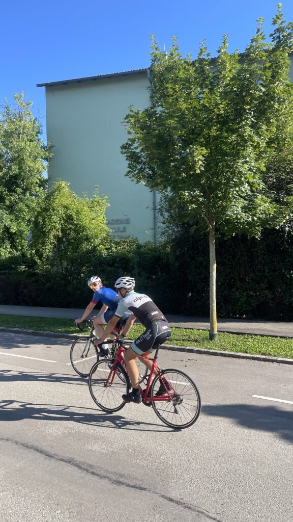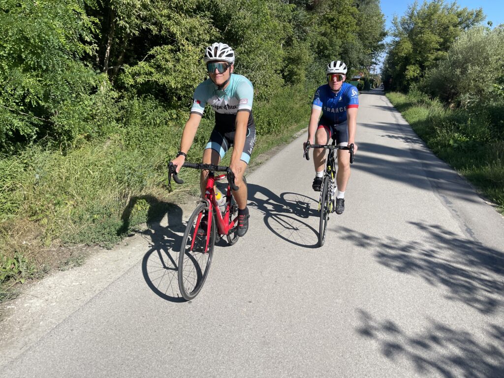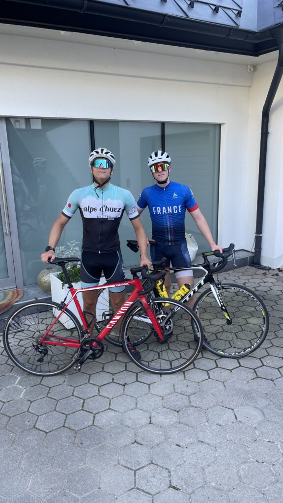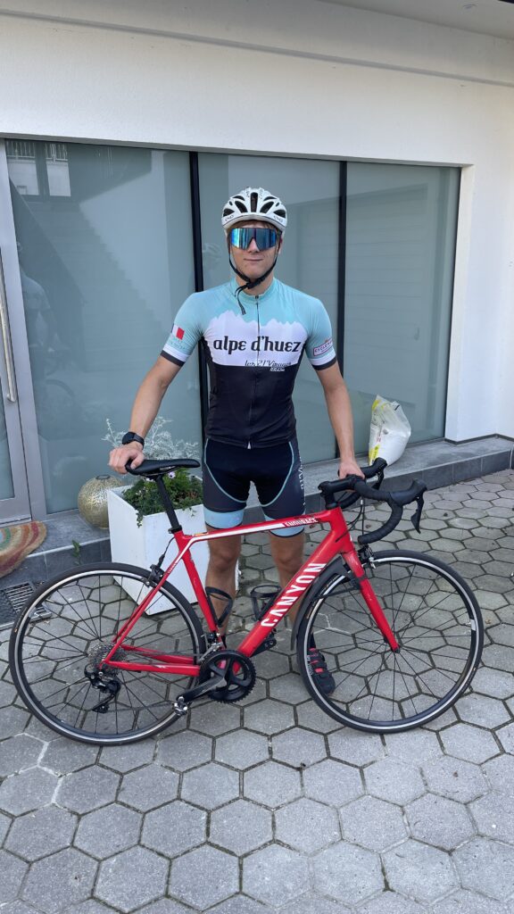 Nico wollte unbedingt mit seinem neuen Triathlon Rad (Canyon Speedmax CF 8) antreten, welches wir erst 2 Tage vorher in Graz über Willhaben gekauft haben. Ursprünglich wollte er sogar mit dem Scheibenrad (disk wheel), das im Kauf dabei war fahren, aber an diesem Tag gab es extremen Wind und ohne Training ist es die Sturzgefahr groß. Darum hat er am Parkplatz das Hinterrad noch gewechselt. Nachdem wir die tollen Räder nur im Auto transportieren wollten und Birgit auch mitgefahren ist, haben wir unsere beiden Räder im Landi verstaut und ich bin dann bei Thomas mitgefahren.