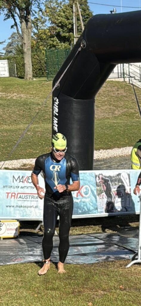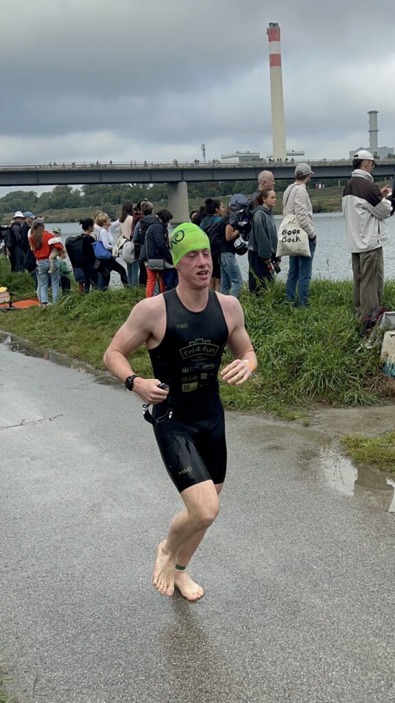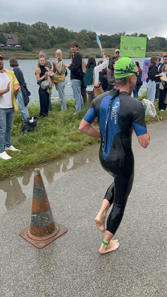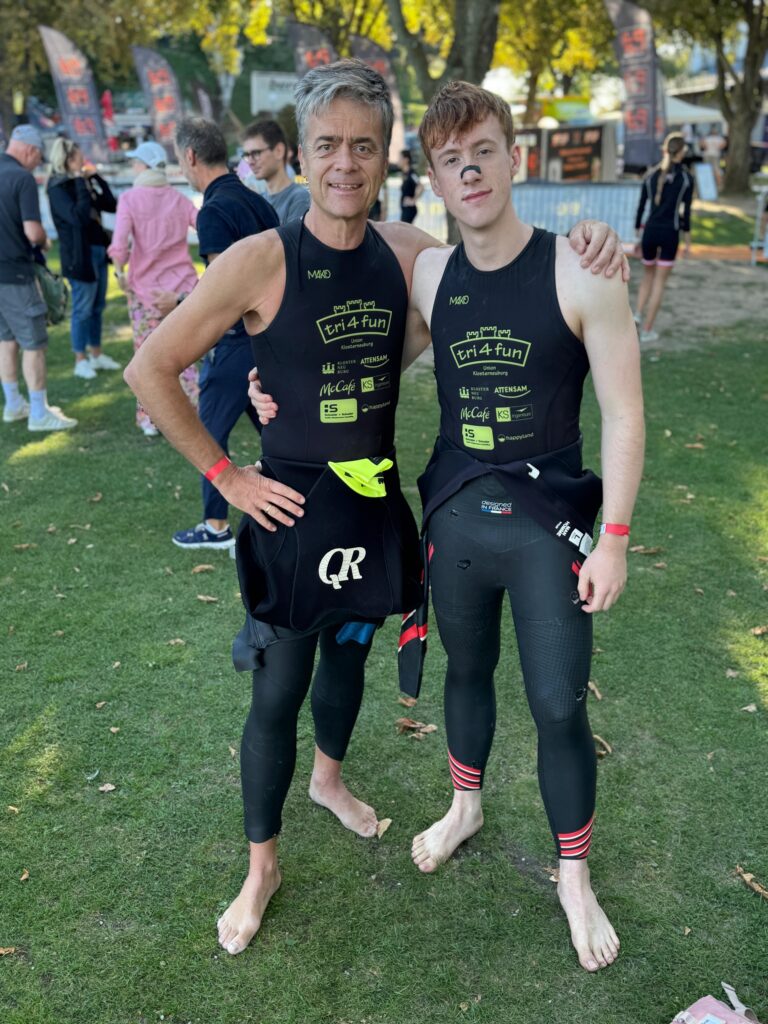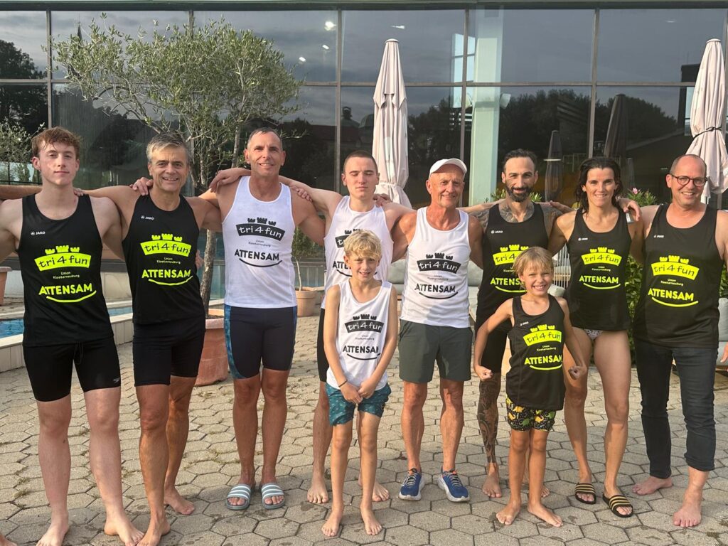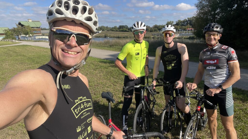 Heute am Start sind neben Nico und mir auch Moritz und Thomas. Als Supporter sind dabei Birgit, Pia und Luca sowie Kathi und Viktoria, Christian mit Flora sowie Josef unser Trainer. Wir sind sehr zeitig schon zur Einchecken gefahren, es ist ja der erste Triathlon von Nico. Nico hat die Vorbereitung bravorös gemeistert. Es ist ja an sehr viel zu denken, wie Neopren, Trisuit, Schwimmbrillen, Radschuhe, Helm, Chip, Startband, Sonnenbrillen, Kapperl, Laufschuhe, Handtuch, Gel, Isogetränk fürs Rad und das alles muss man strategisch aufbauen, um wenig Zeit in der Wechselzone zu verlieren bzw. zu brauchen. Moritz zB hat seinen Trisuit vergessen und musste nochmals heimfahren, zum Glück waren wir so früh dort.