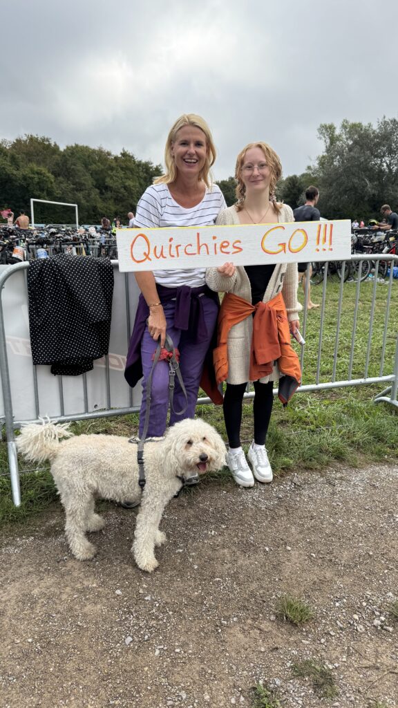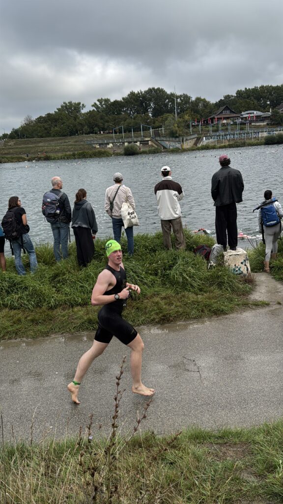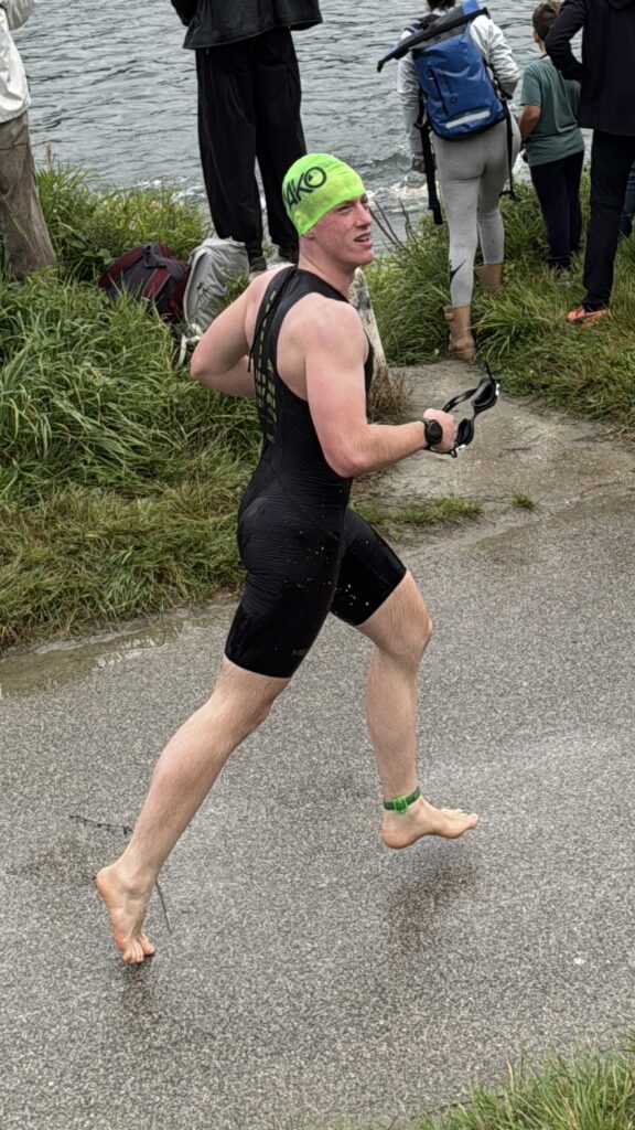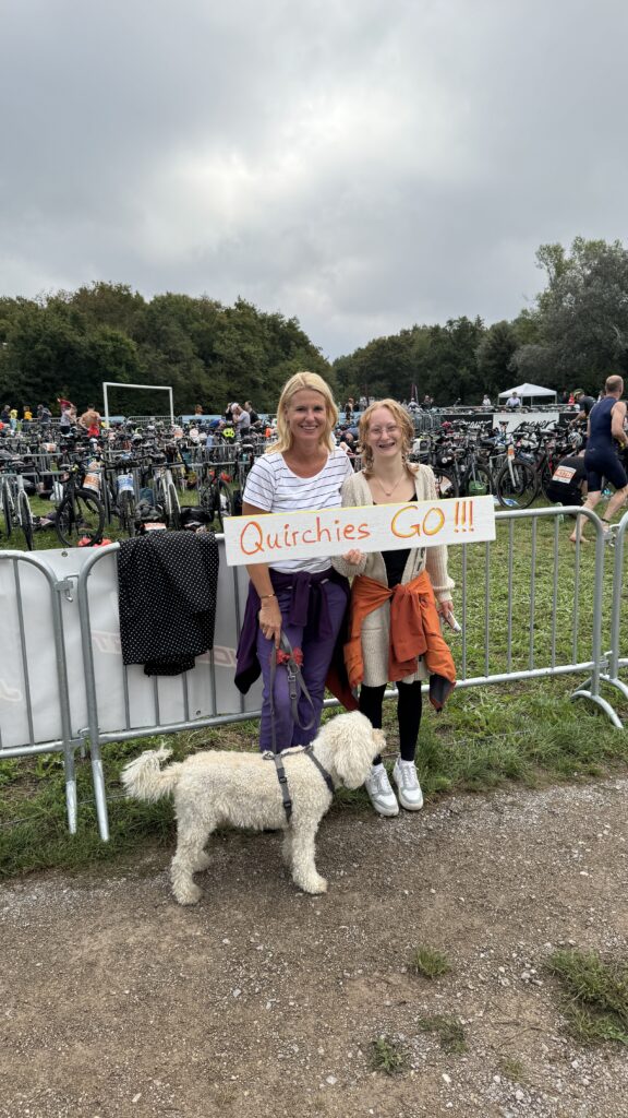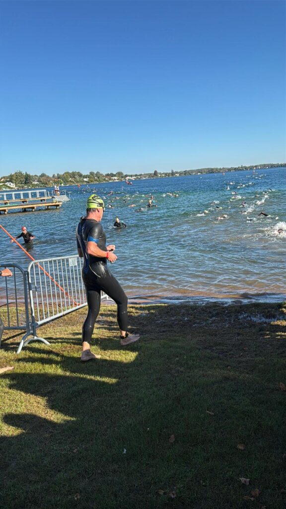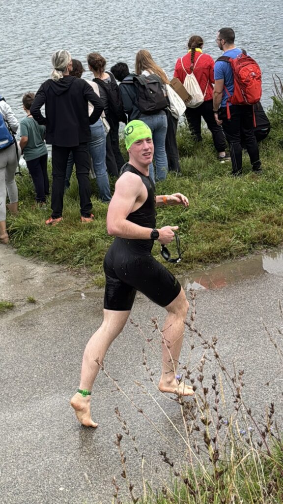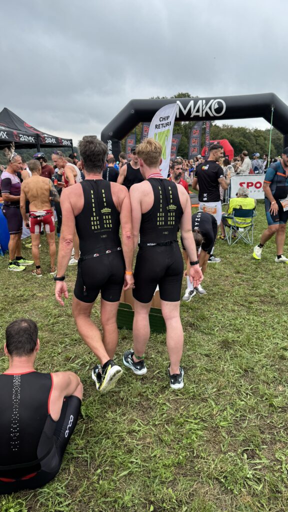 Heute am Start sind neben Nico und mir auch Moritz und Thomas. Als Supporter sind dabei Birgit, Pia und Luca sowie Kathi und Viktoria, Christian mit Flora sowie Josef unser Trainer. Wir sind sehr zeitig schon zur Einchecken gefahren, es ist ja der erste Triathlon von Nico. Nico hat die Vorbereitung bravorös gemeistert. Es ist ja an sehr viel zu denken, wie Neopren, Trisuit, Schwimmbrillen, Radschuhe, Helm, Chip, Startband, Sonnenbrillen, Kapperl, Laufschuhe, Handtuch, Gel, Isogetränk fürs Rad und das alles muss man strategisch aufbauen, um wenig Zeit in der Wechselzone zu verlieren bzw. zu brauchen. Moritz zB hat seinen Trisuit vergessen und musste nochmals heimfahren, zum Glück waren wir so früh dort.