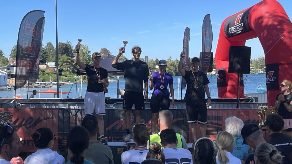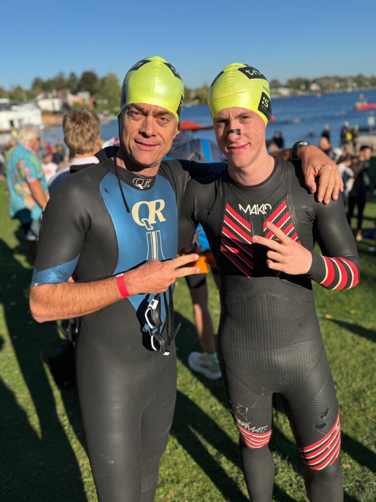 Gegen 9 Uhr war Start. Das Wetter war herrlich (bis auf de starken Wind). Wir drei sind im Neo geschwommen. Nico war nach 24 Minuten aus dem Wasser, ich nach 29 Minuten und Thomas nach 40 Minuten. Mir ist es diesmal beim Schwimmen nicht gut gegangen. Das hat sich dann beim Radfahren fortgesetzt. Mit dem starken Gegenwind bin ich nicht so zu Recht gekommen. Nico war diesmal 1-2 Minuten auf die 40 km schneller als ich. Bei mir war dann der Bewerb nach dem Bike aus, Nico ist noch 10,4 km geschwommen. Birgit hat uns supportet und hatte dabei mächtig viel Stress uns zu sehen. Nico hat mit 2 Stunde 37 bei diesen Bedingungen toll gefinisht, Thomas war 20 Minuten langsamer. Obwohl Nico in der Klasse Junioren – also 18 – 20 Jahre – gestartet ist, wurde er Zweiter und war wieder am Podium und hat einen Pokal bekommen. Es war wieder ein schönes gemeinsames Erlebnis.