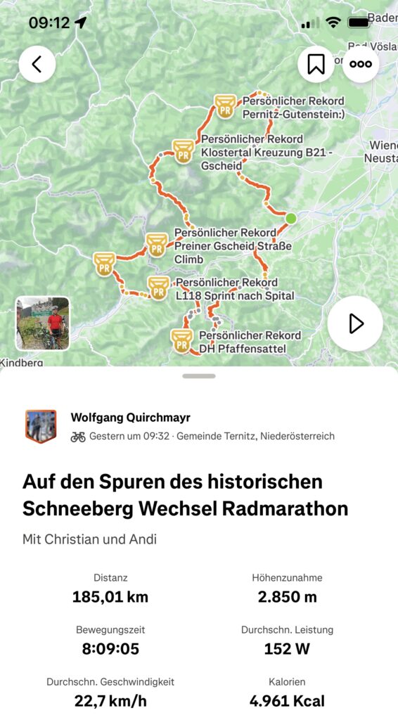 Zunächst fuhren wir über Sieding nach Puchberg am Schneeberg, dann ging es über den Ascher und Lanzingweg ins Triestingtal nach Pernitz. Weiter dann über’s Klostertaler Gscheid ins Höllental und zur Raxseilbahnstation. Dann über das Preiner Gscheid nach Altenberg an der Rax und weiter nach Mürzzuschlag. Jetzt nach über 4 Stunden ging es mir schon viel besser, der Restalkohol war nun auch abgebaut. Dort waren wir beim großen Billa Semmeln einkaufen und haben uns gestärkt. Dann ging es rauf zum Pfaffensattel und runter nach Rettenegg. Von dort dann über den Freistizer Sattel nach Kirchberg am Wechsel und dann wieder rauf auf den Ramssattel. Dann gings nur noch runter nach Gloggnitz und zurück nach Ternitz, wo es schon dunkel wurde. In Summe waren es rd. 185 km mit 3.300 Höhenmeter. Es war wieder eine supertolle Radrunde. Mit Christian war ich dann noch in Neunkirchen in einer tollen Pizzeria Abendessen.