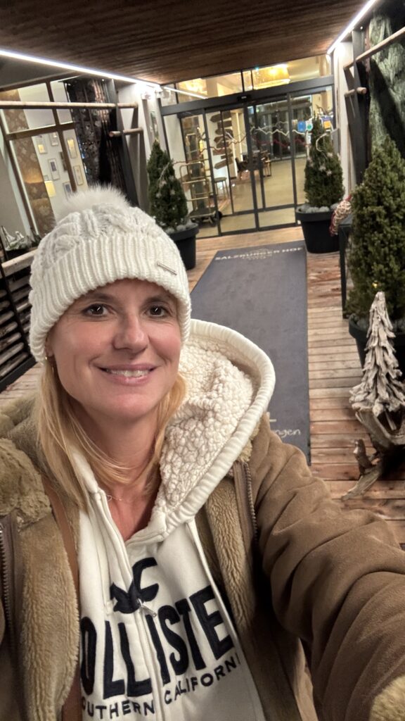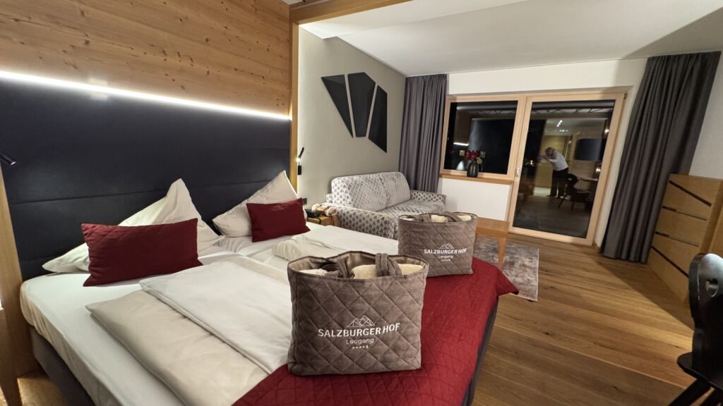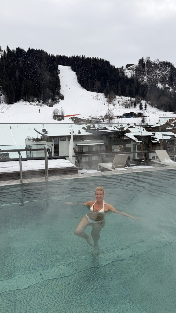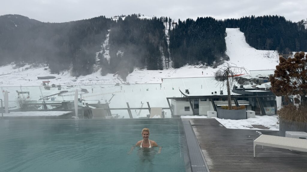 Im Salzburger Hof waren Birgit und ich dann im Outdoor Pool und dann relaxen im Zimmer, da ich ganz starke Knieschmerzen bekommen habe, so dass mir Birgit sogar Socken, Hose und Schuhe zum Abendessen anziehen musste. Nach dem Abendessen waren wir noch wenn Uno spielen. Die halbe Nacht schmerzte das Knie noch so stark, dass ich schlecht geschlafen habe, aber in der Früh waren die Schmerzen wieder weg.