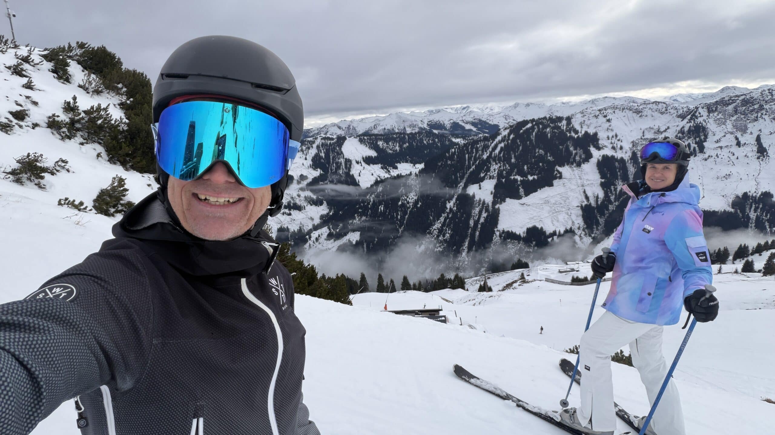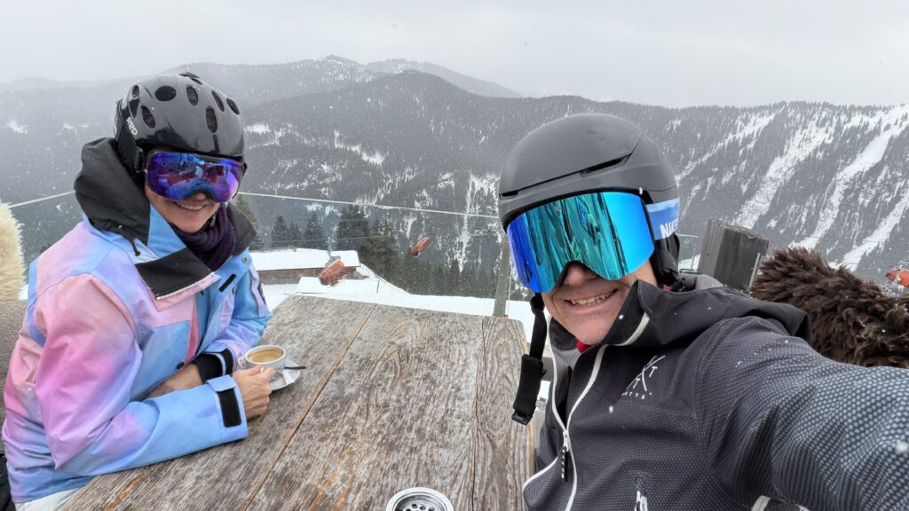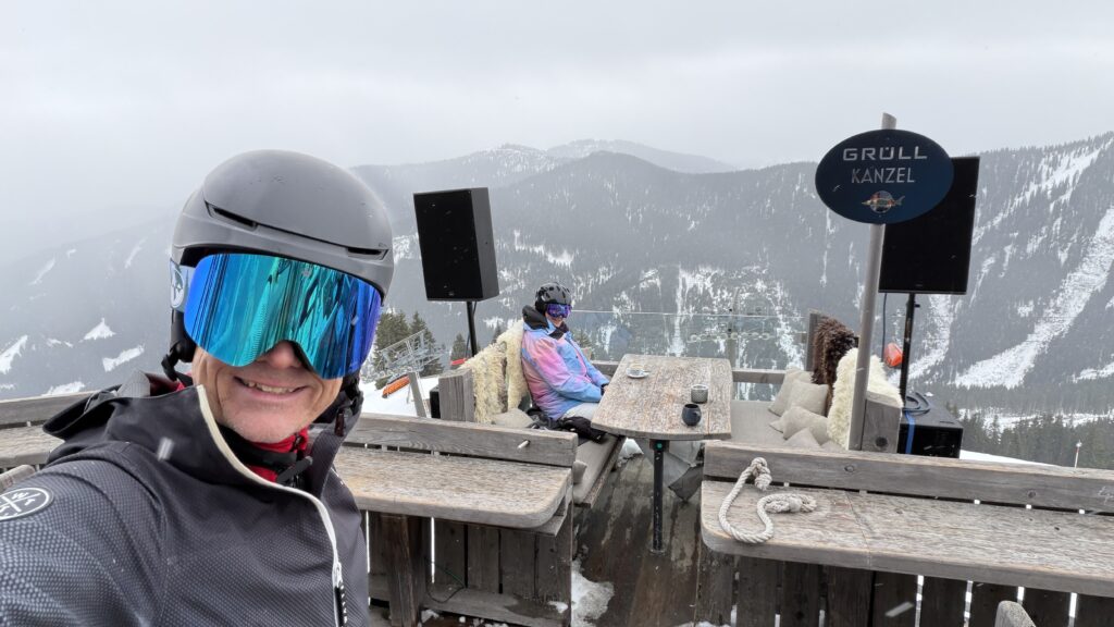 Um 12:30 sind wir bereits 40 km und über 9000 Höhenmeter gefahren. Damit die beiden nicht mit Hunger Formel 1 schauen müssen, sind wir oben bei der Asitzhütte noch auf Germknödel und Kaiserschmarrn gegangen. Während Nico und Luca um 13:15 Uhr dann runtergefahren sind, sind Birgit und ich noch eine Tal Abfahrt zur Steinberg Bahn gefahren. Oben am Asitz Gipfel sind wir dann noch auf einen Kaffee gegangen. Es hat zum schneien begonnen und wir haben uns draußen hingesetzt. Es war recht fein. Am Ende waren es wieder 47 km und über 10.000 Höhenmeter.