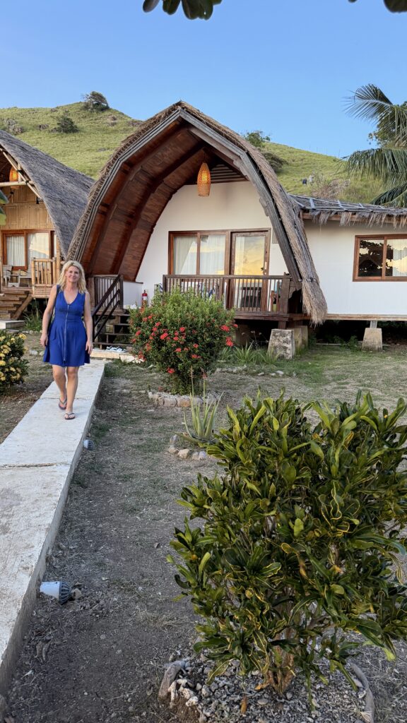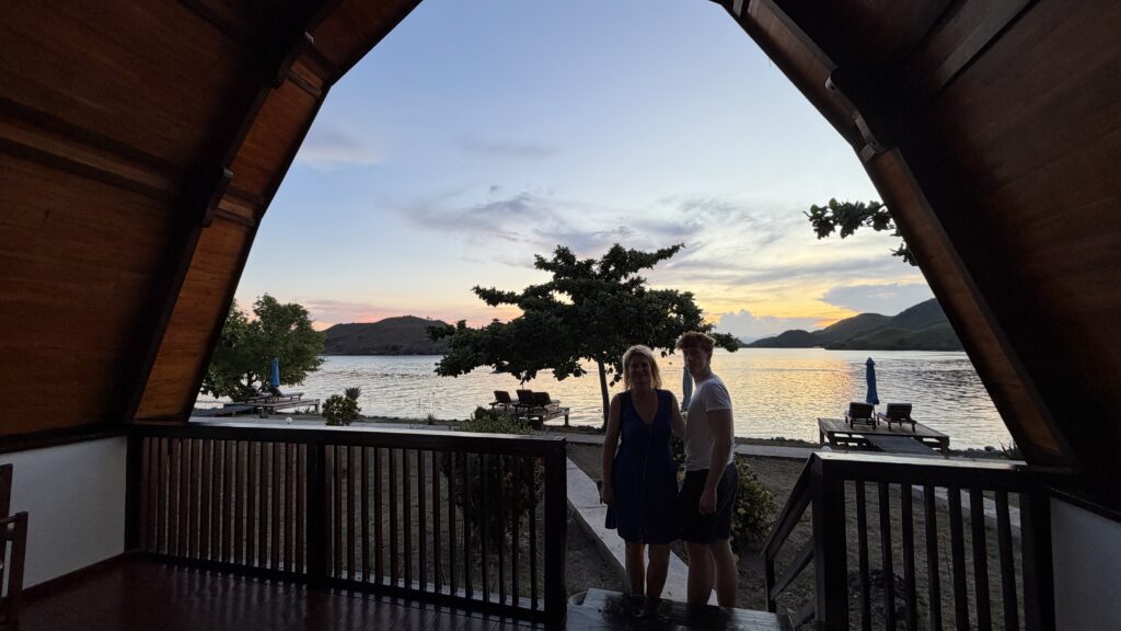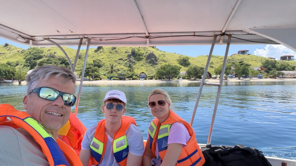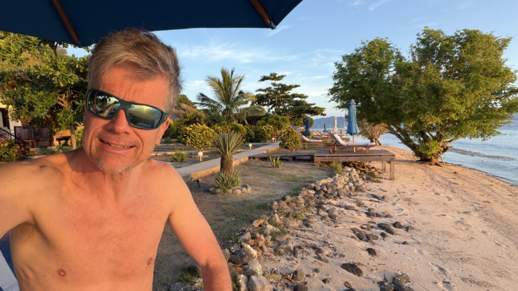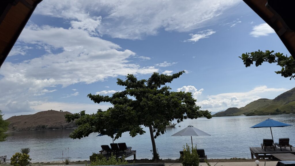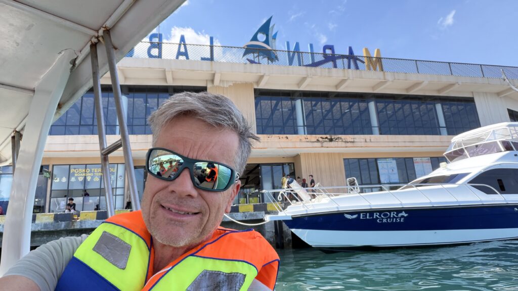 Am Airport in Labuan Bajo ging alles recht flott und es wartete draußen schon jemand auf uns. Zunächst fuhren wir mit einem kleinen Bus hinunter zum Hafen dort ging es dann durch das Hafengebäude zu unserem Speedboat. Die Fahrt zu unserem Komodo Resort im Nationalpark auf die Sabayor Besar Island dauerte rund 45 Minuten. Kurz nach 11:00 Uhrwaren wir bereits auf der kleinen Insel im Nationalpark (das ist das einzige Hotel im Nationalpark).