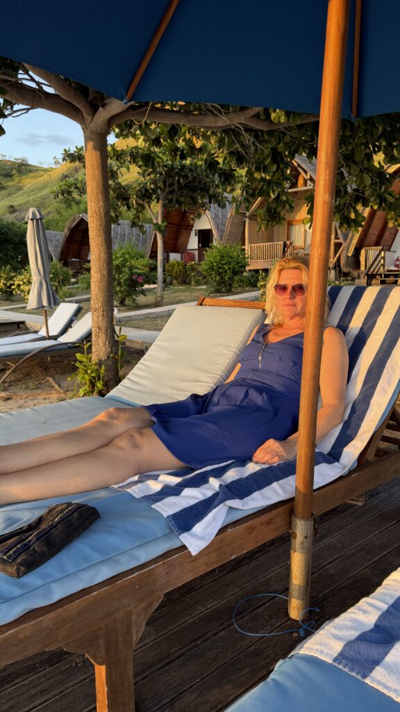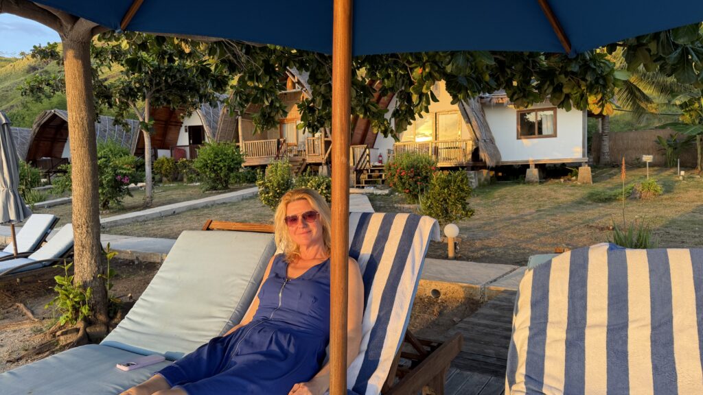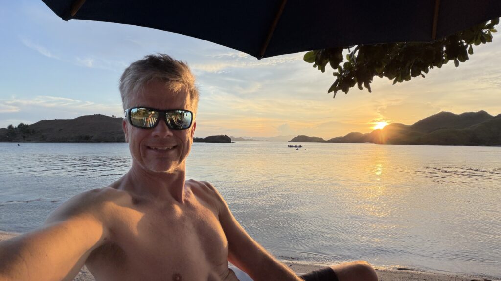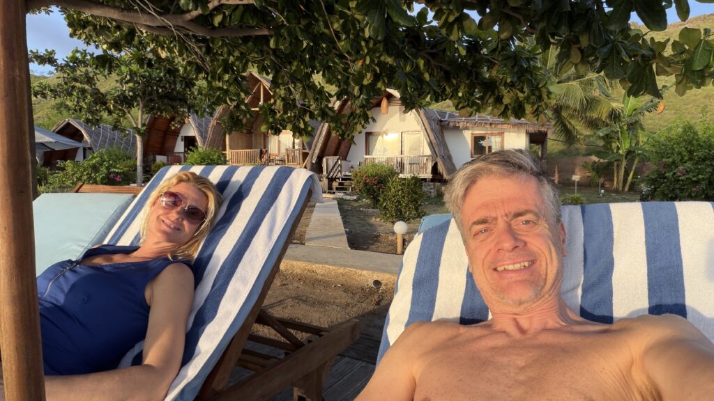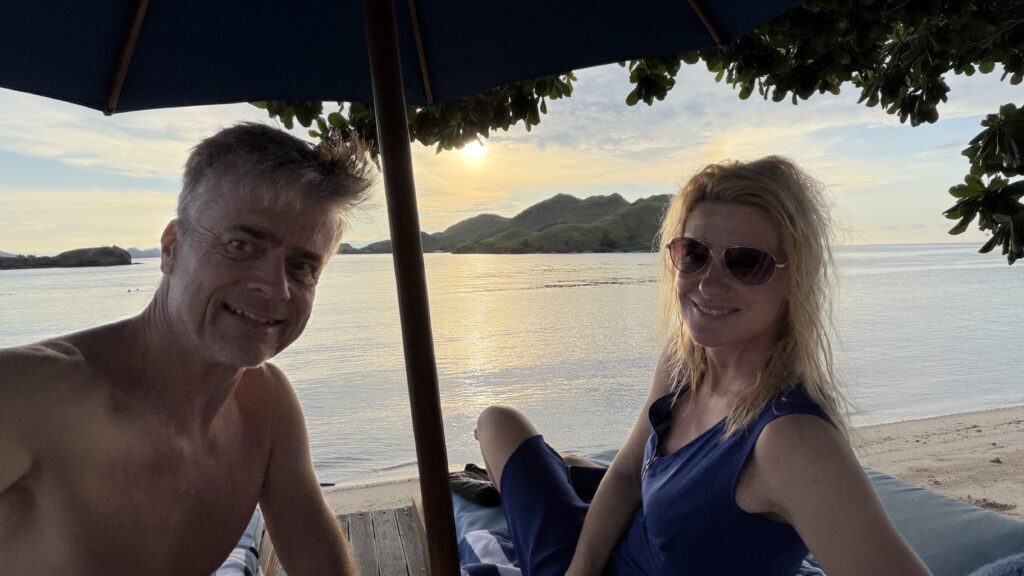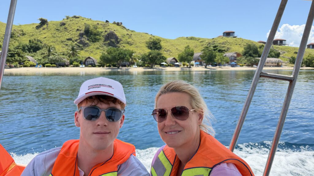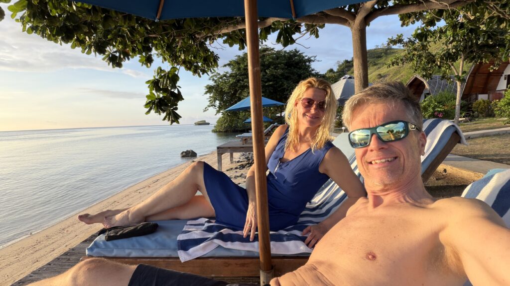 Am Airport in Labuan Bajo ging alles recht flott und es wartete draußen schon jemand auf uns. Zunächst fuhren wir mit einem kleinen Bus hinunter zum Hafen dort ging es dann durch das Hafengebäude zu unserem Speedboat. Die Fahrt zu unserem Komodo Resort im Nationalpark auf die Sabayor Besar Island dauerte rund 45 Minuten. Kurz nach 11:00 Uhrwaren wir bereits auf der kleinen Insel im Nationalpark (das ist das einzige Hotel im Nationalpark).