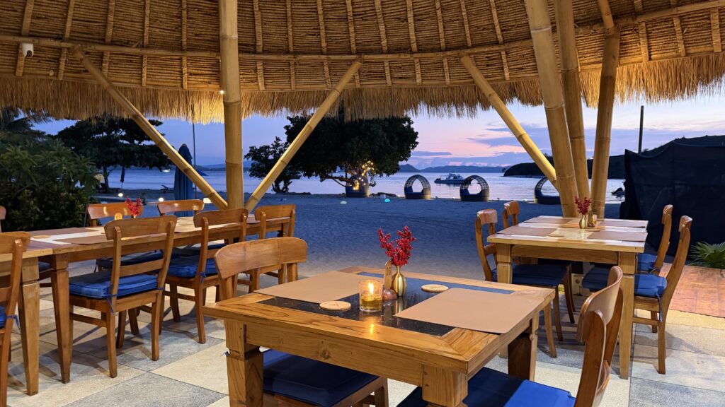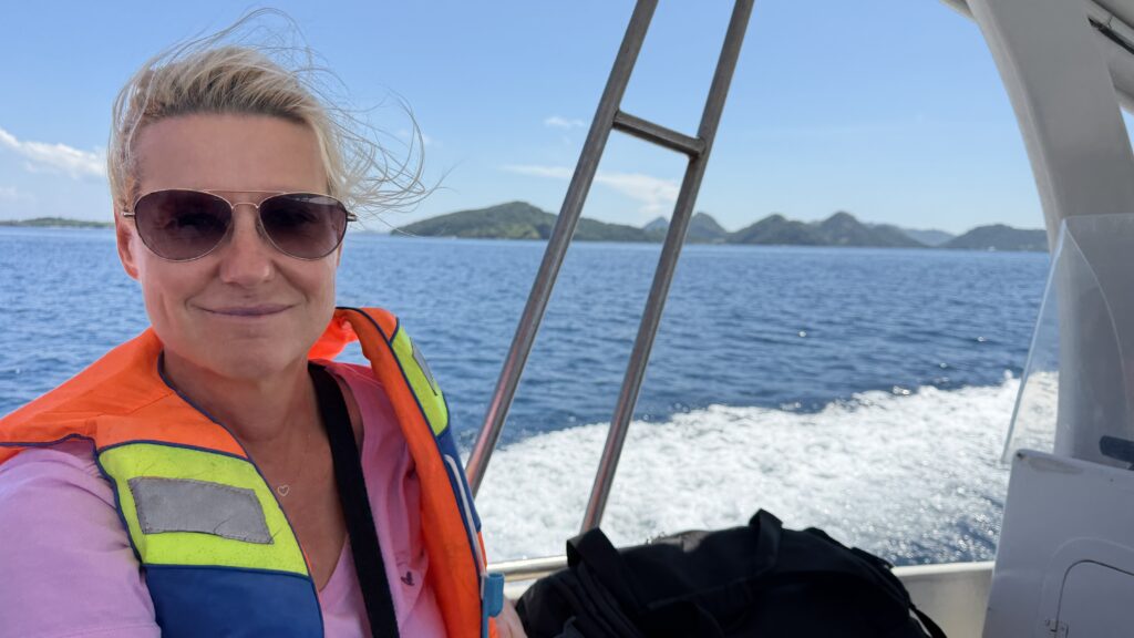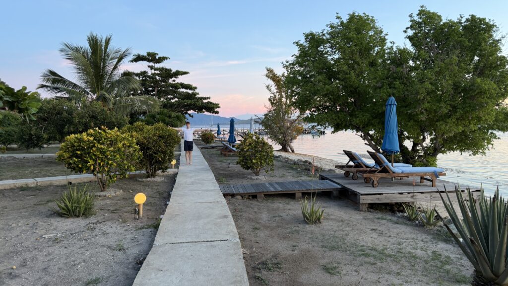 Das Ressort mit vielen kleinen Strandbungalows liegt in idyllisch zwischen ganz vielen Inseln mit kleinen grün bewachsenen Hügeln. Wir haben uns dieses Ressort ausgesucht, da wir von hier aus um 1 Stunde weniger An- und Abfahrt bei unseren täglichen Ausflügen haben.