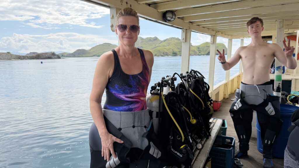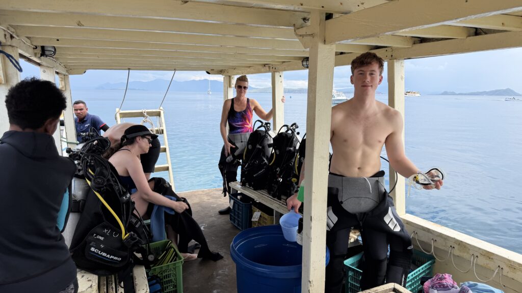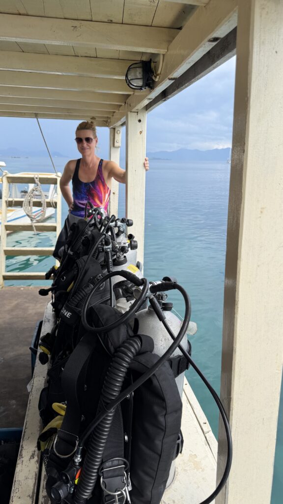 Aufgrund der noch nicht überwunden Zeitverschiebung und im frühen aufstehen waren wir alle sehr sehr müde und haben uns ein wenig hingelegt. Da wir aber bereits morgen im Nationalpark tauchen gehen wollen, hatten wir noch um 15:00 Uhr einen Checkdive auf der gegenüberliegenden Insel. Es war recht hart rechtzeitig dafür alles bereitzustellen und auch fit zu sein.