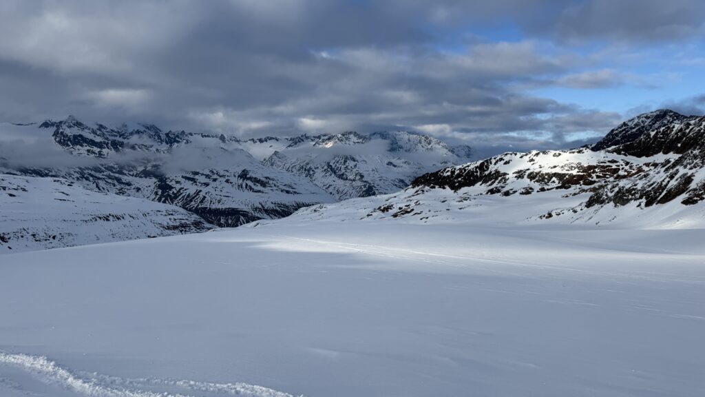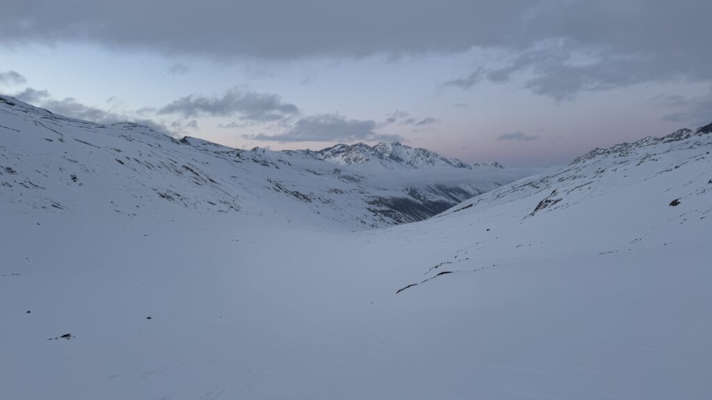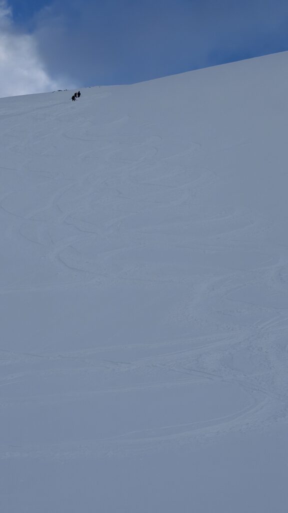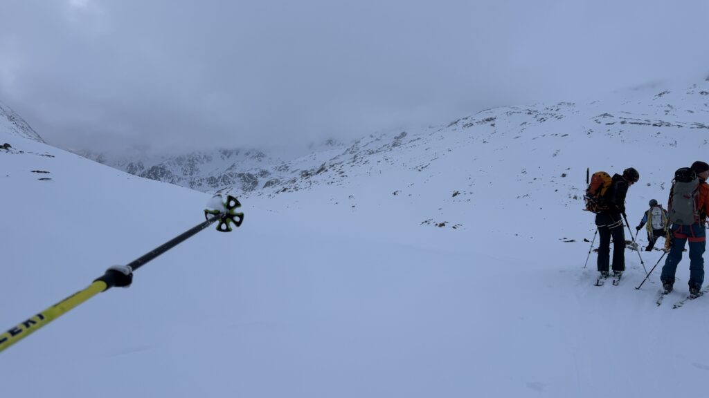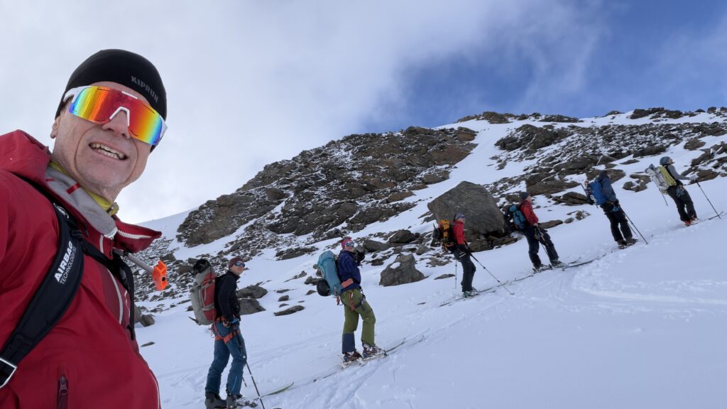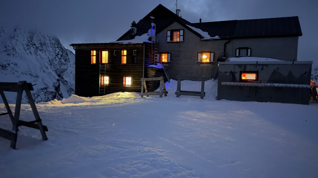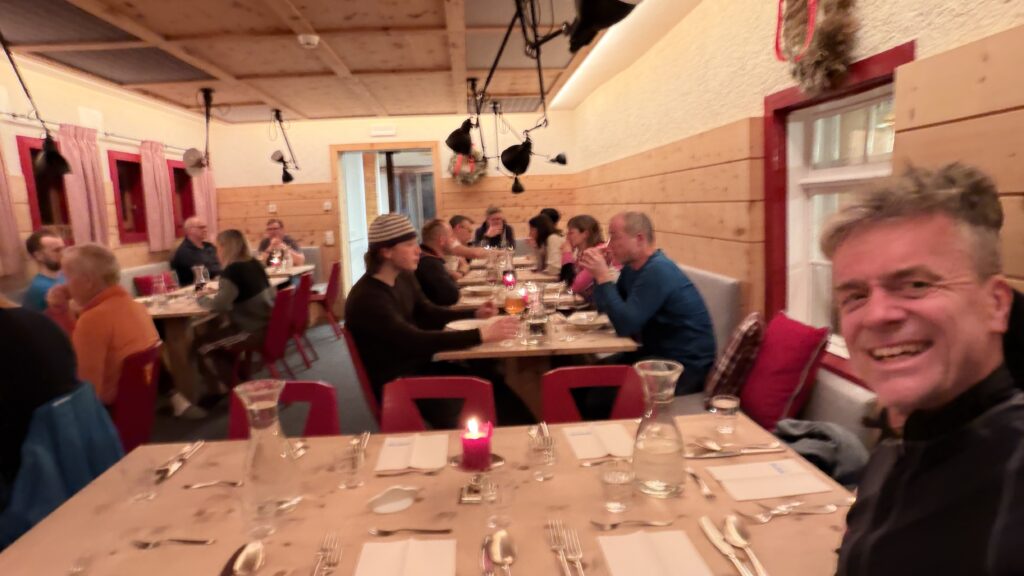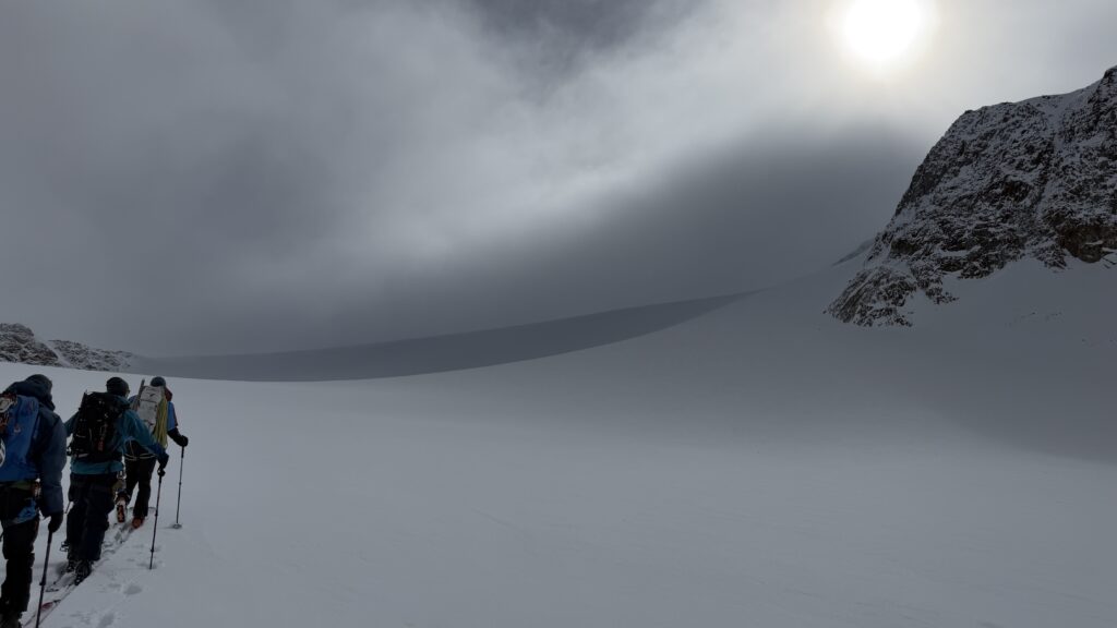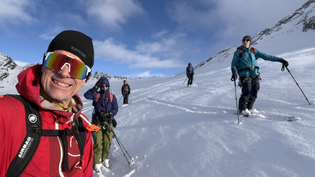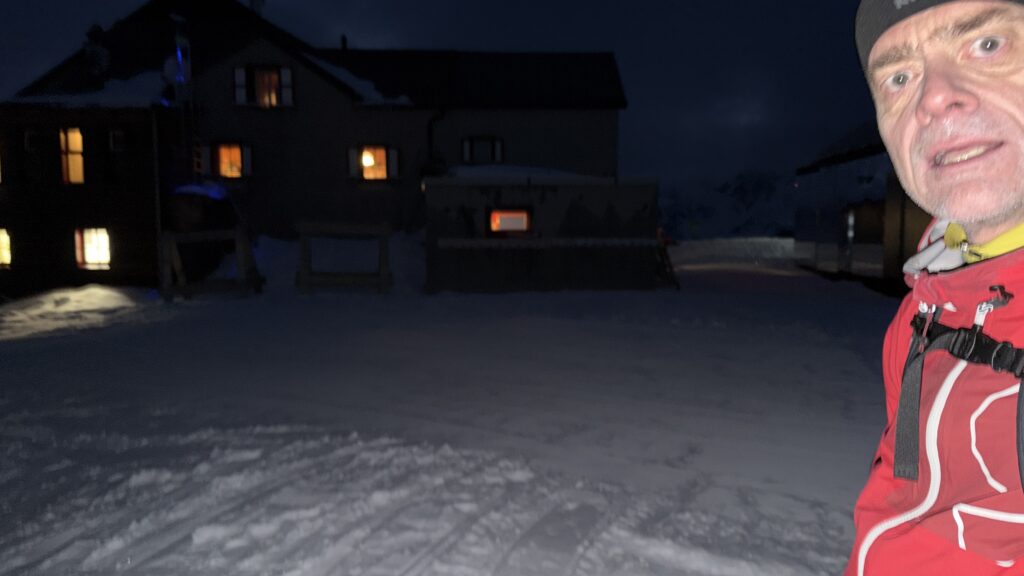 Jetzt geht’s wieder schön bergan. Einmal eine 35 Grad Abfahrt. Dann wieder anfellen. Der Weg war leider noch weit. Nun sind weitere Materialprobleme hinzu gekommen und zwar mit den Fellen, durch das oftmalige An- und Abfällen hat es bei einigen nicht mehr gehalten. Ich bin dann schneller zur Bella Vista war erst um 19:15 Uhr, da war es dann schon dunkel. Ich habe gesorgt, dass 3 von uns vom Hotel mit dem Skidoo abgeholt.