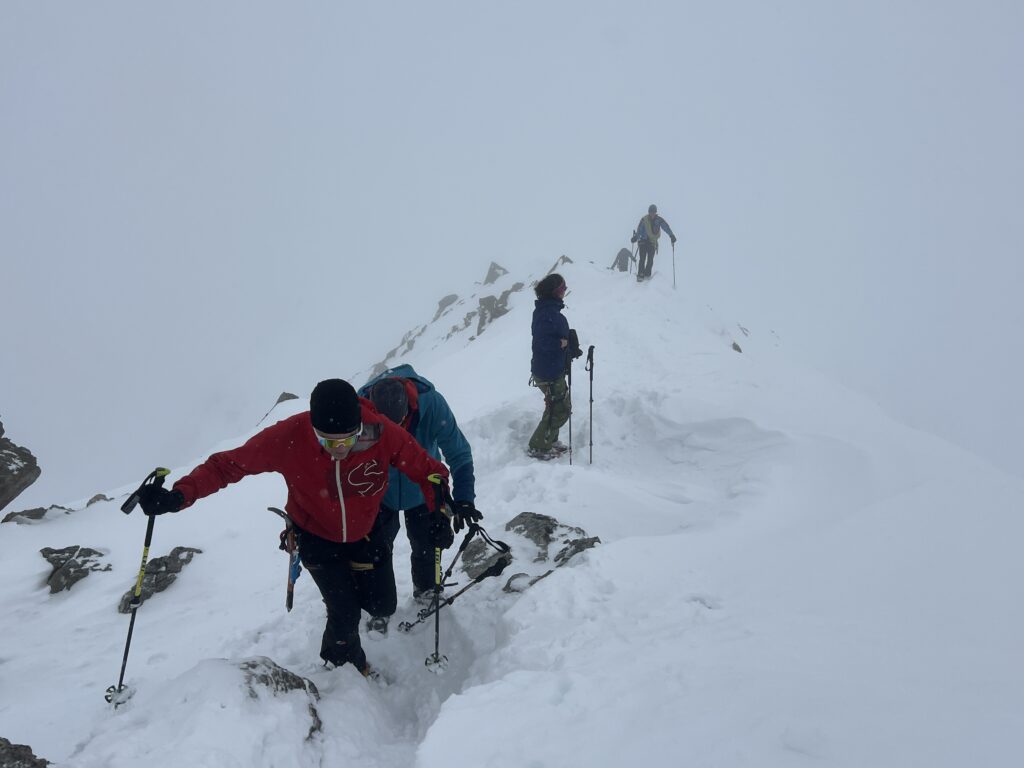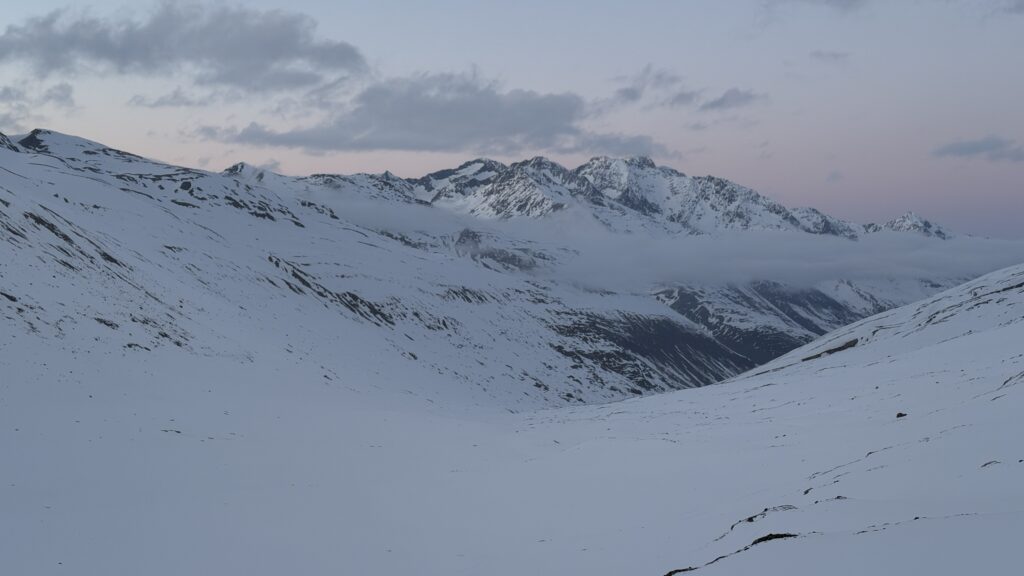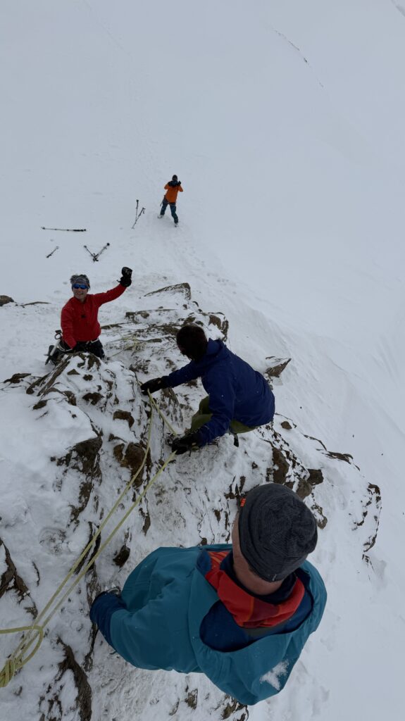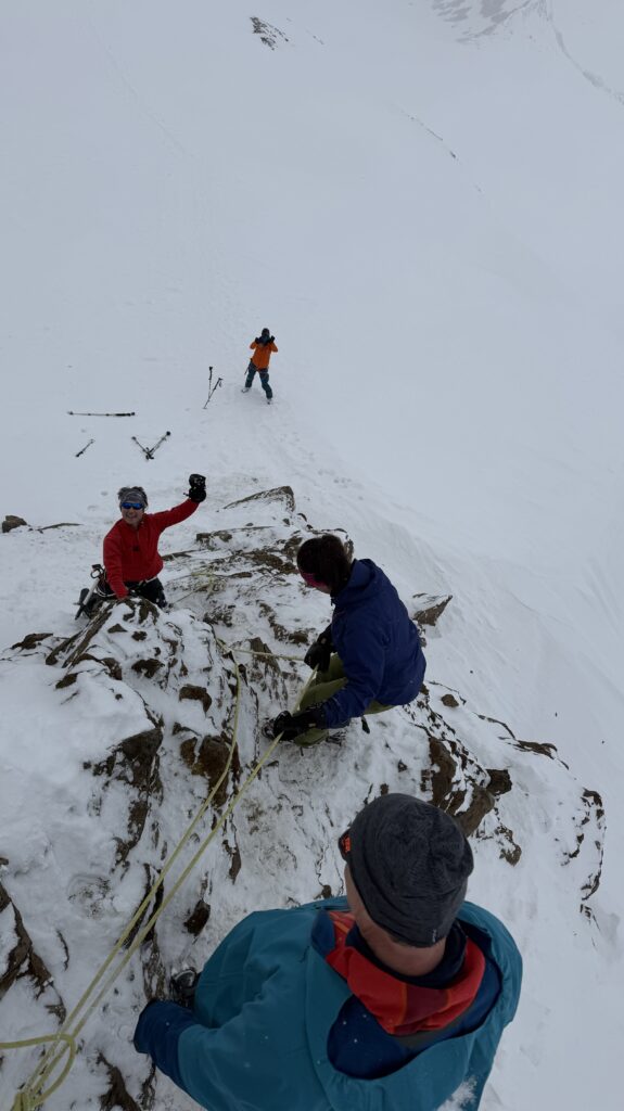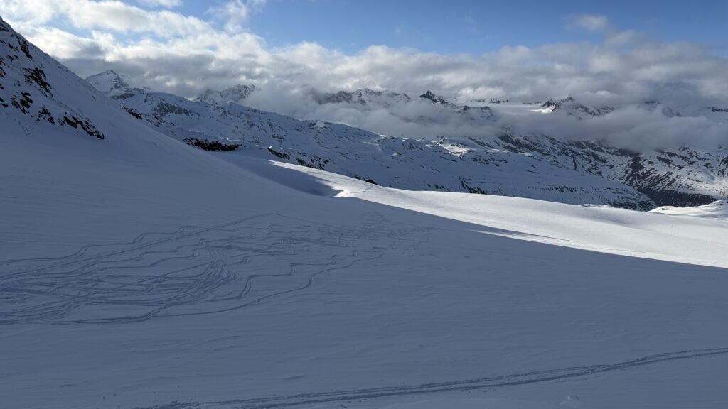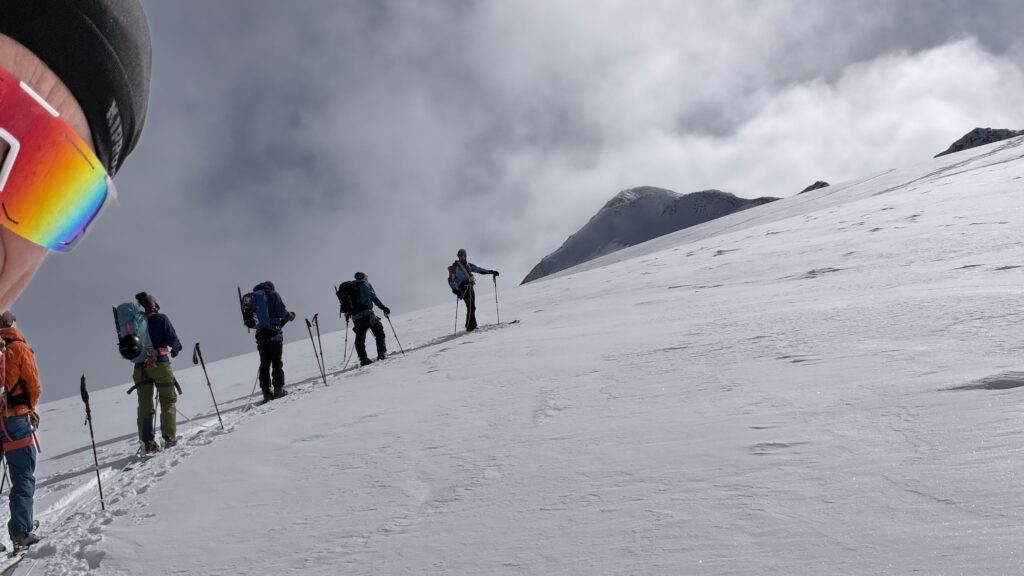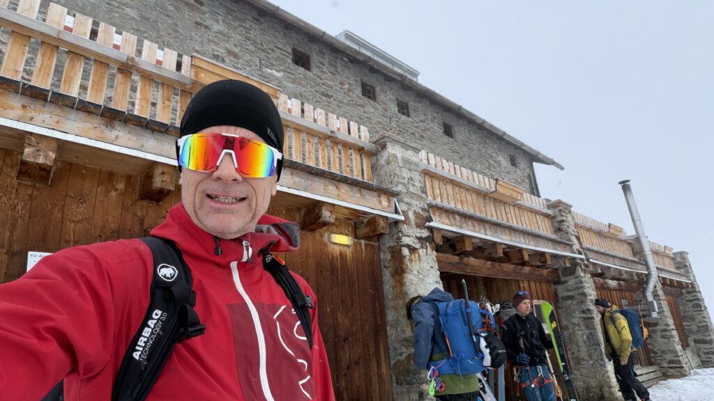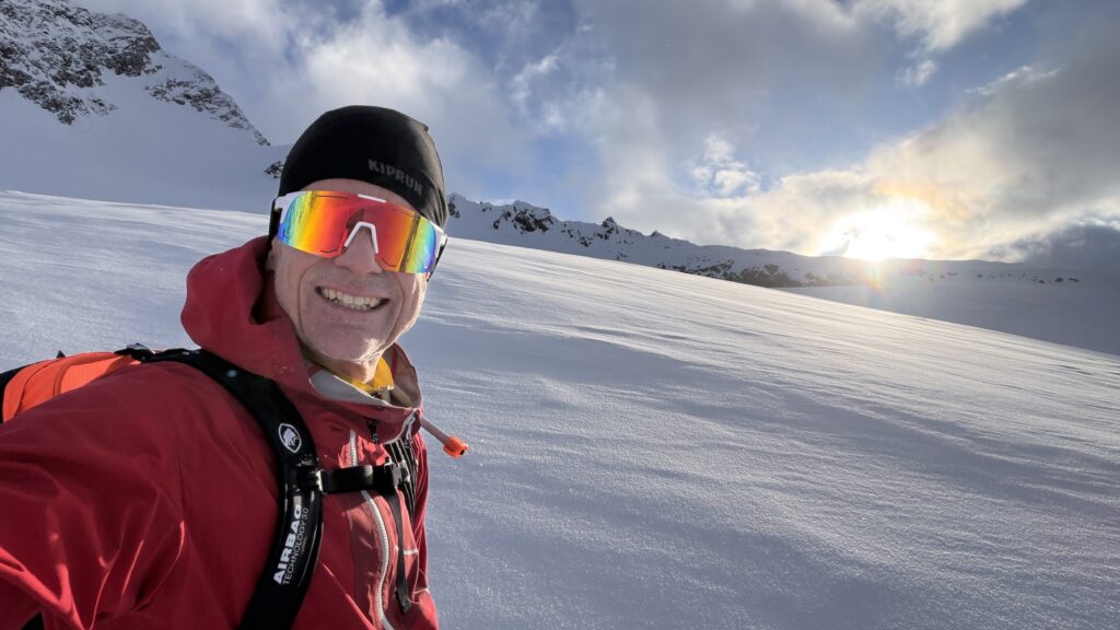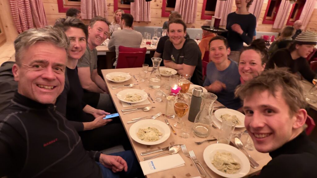 Jetzt geht’s wieder schön bergan. Einmal eine 35 Grad Abfahrt. Dann wieder anfellen. Der Weg war leider noch weit. Nun sind weitere Materialprobleme hinzu gekommen und zwar mit den Fellen, durch das oftmalige An- und Abfällen hat es bei einigen nicht mehr gehalten. Ich bin dann schneller zur Bella Vista war erst um 19:15 Uhr, da war es dann schon dunkel. Ich habe gesorgt, dass 3 von uns vom Hotel mit dem Skidoo abgeholt.