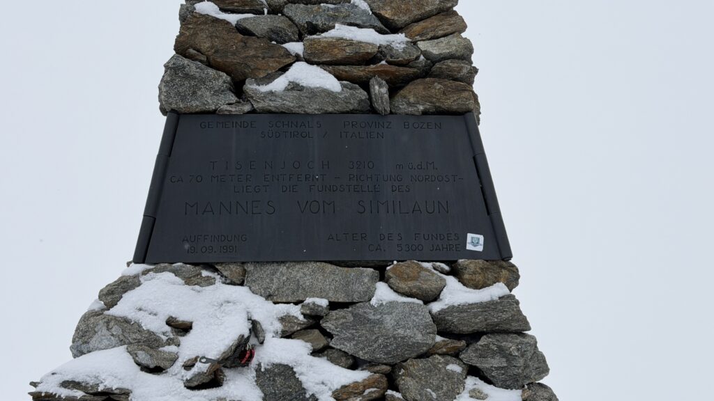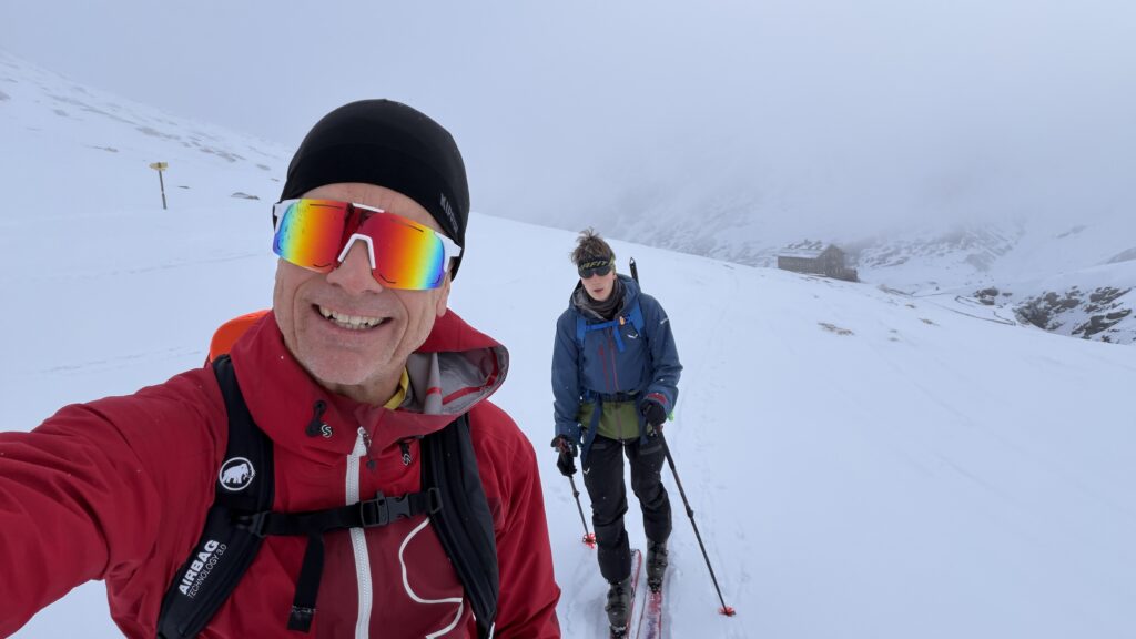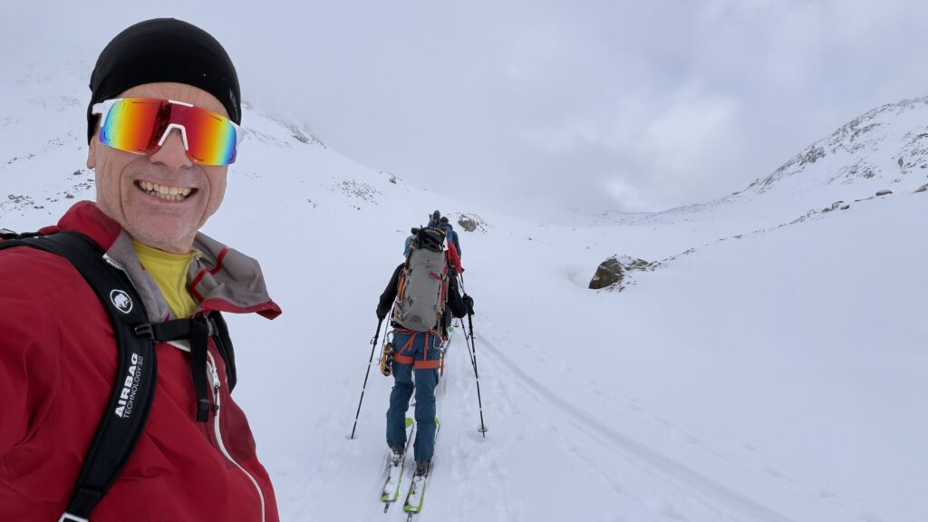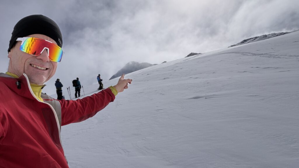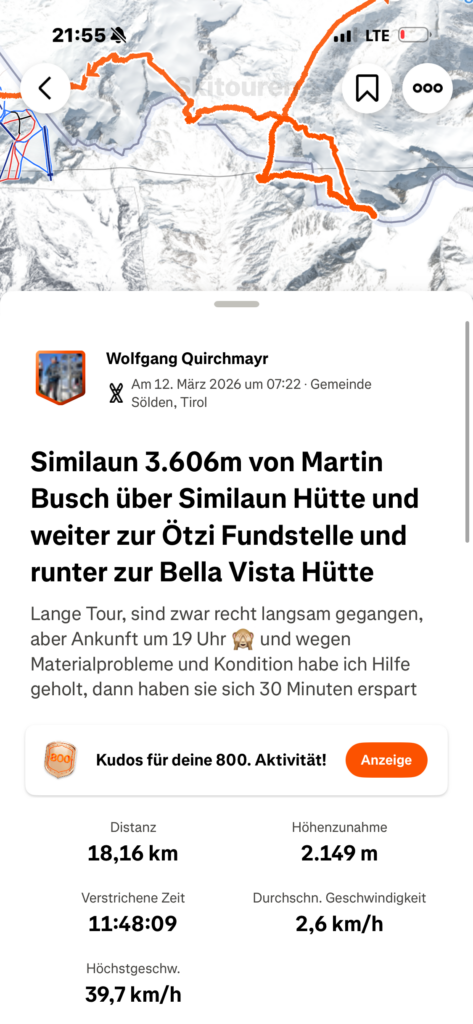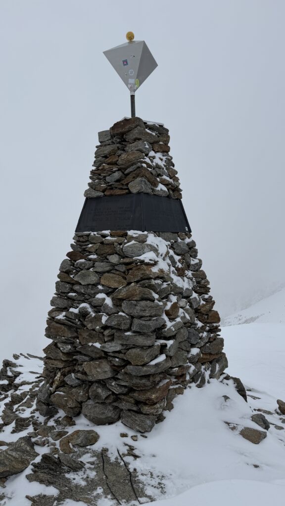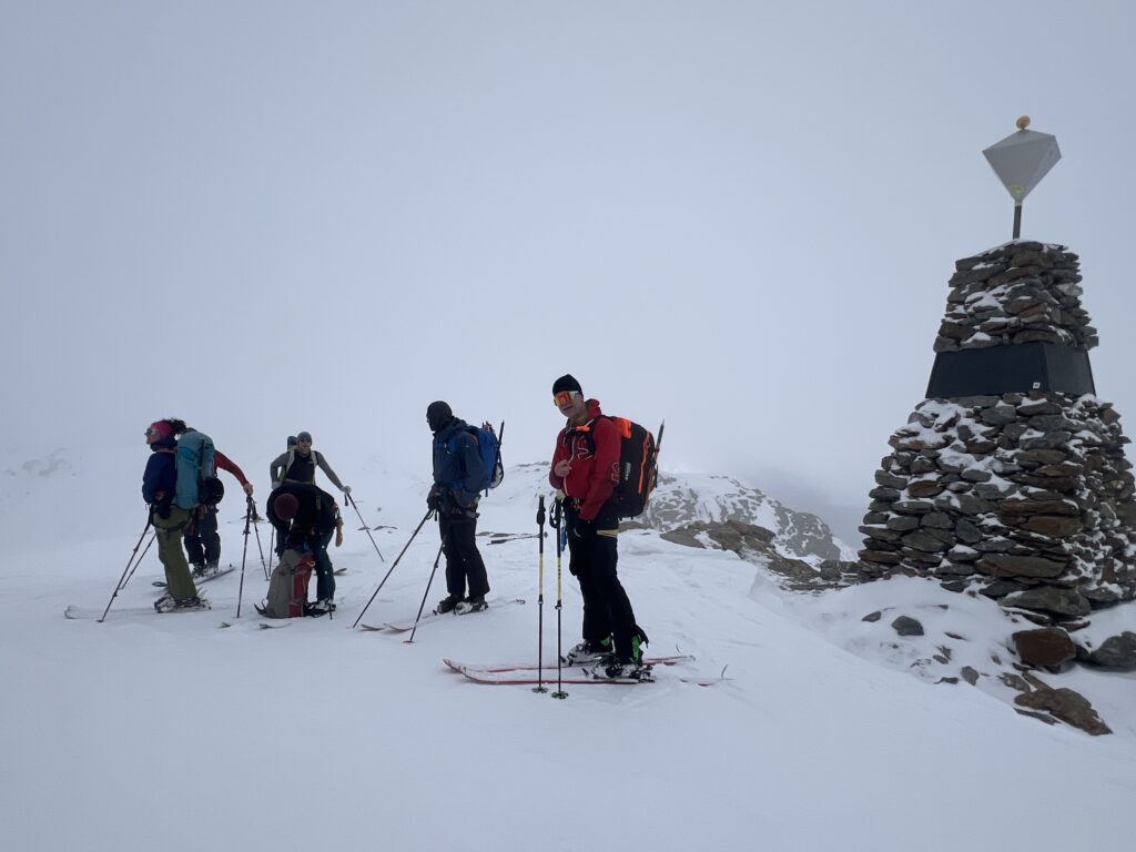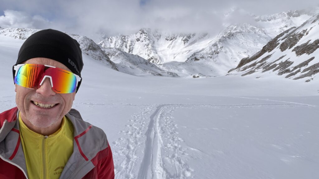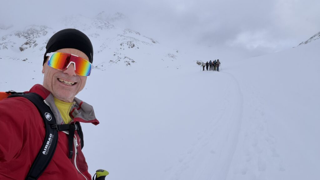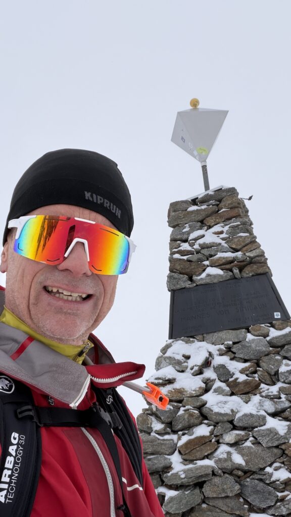 jetzt hatten wir tolle 900 Höhenmeter zum Abfahren hinunter auf 2700 m. Unten haben wir wieder angefüllt über 550 m bergauf zum Hauslabjoch auf 3.272m. Kurz vor dem Hauslabjoch sind bei der Ötzi Fundstelle vorbeigekommen. Dort gibt es ein Denkmal, die Stelle liegt bereits in Italien beziehungsweise Südtirol. Auf dem Joch waren wir erst um 17 Uhr. Ich hatte dann ein großes Material Problem, denn der Spanner zum Stopper ging bei einem Ski kaputt und ich konnte nicht mehr einsteigen. Mithilfe von Alex hab ich geschafft.