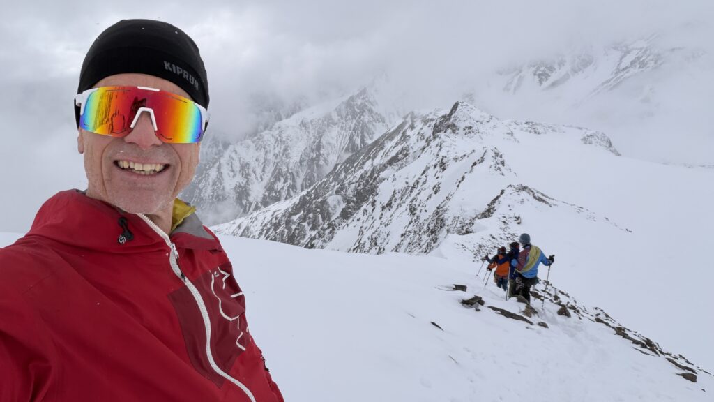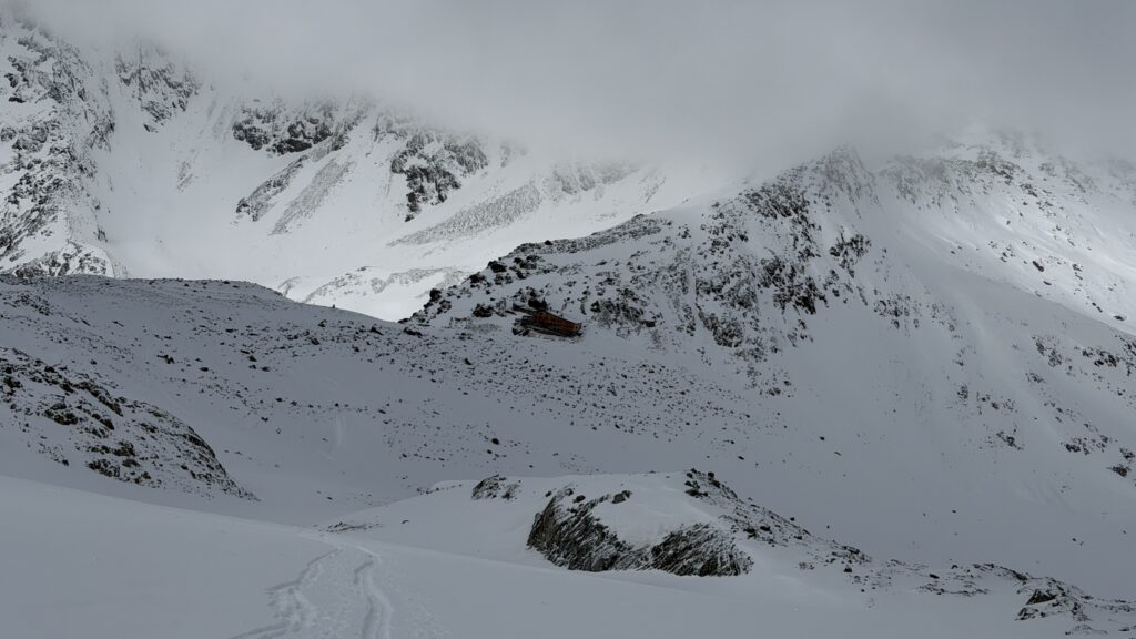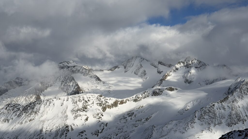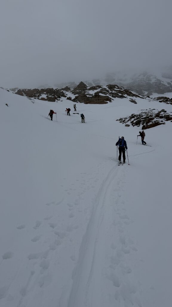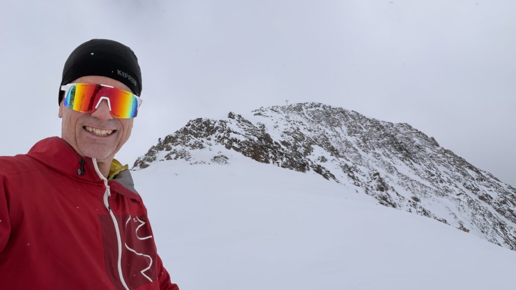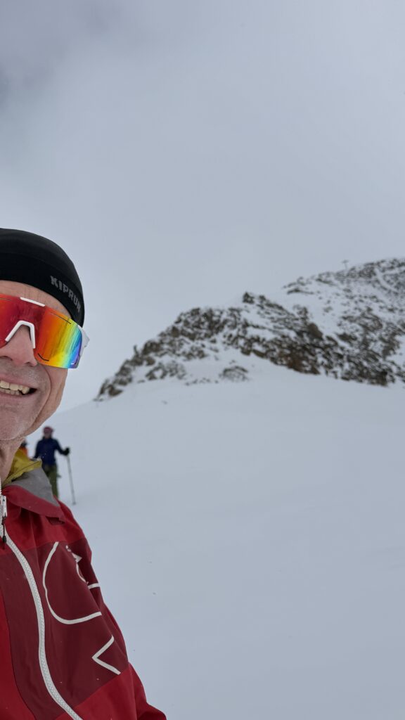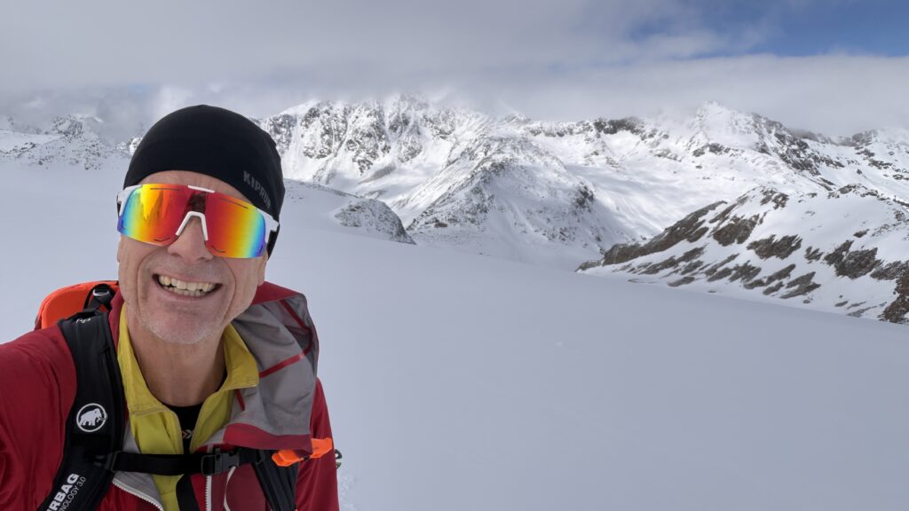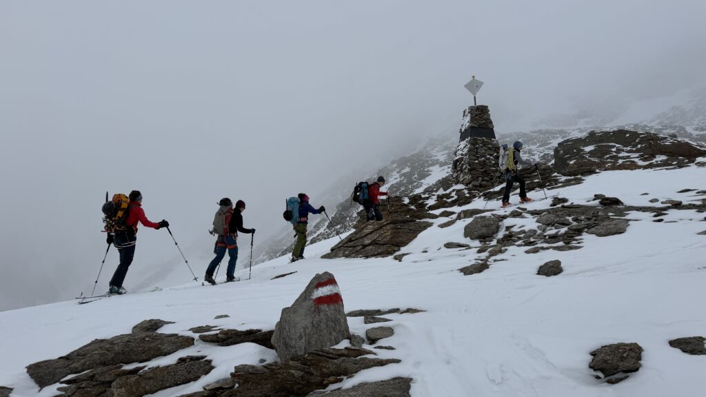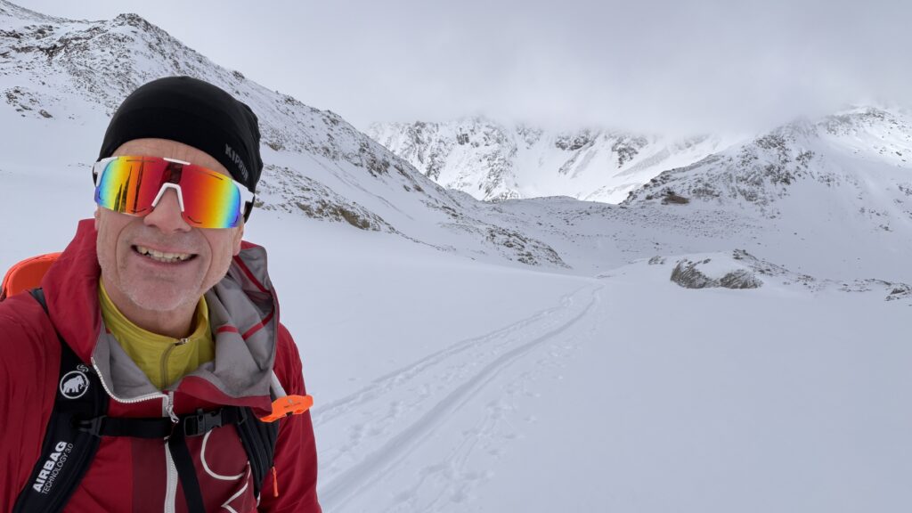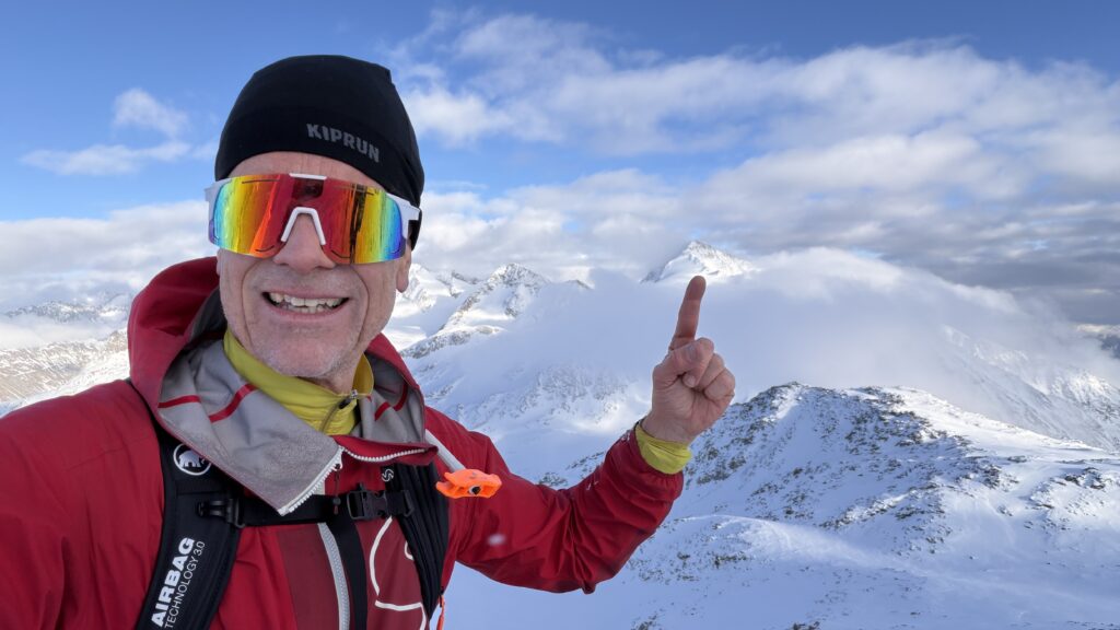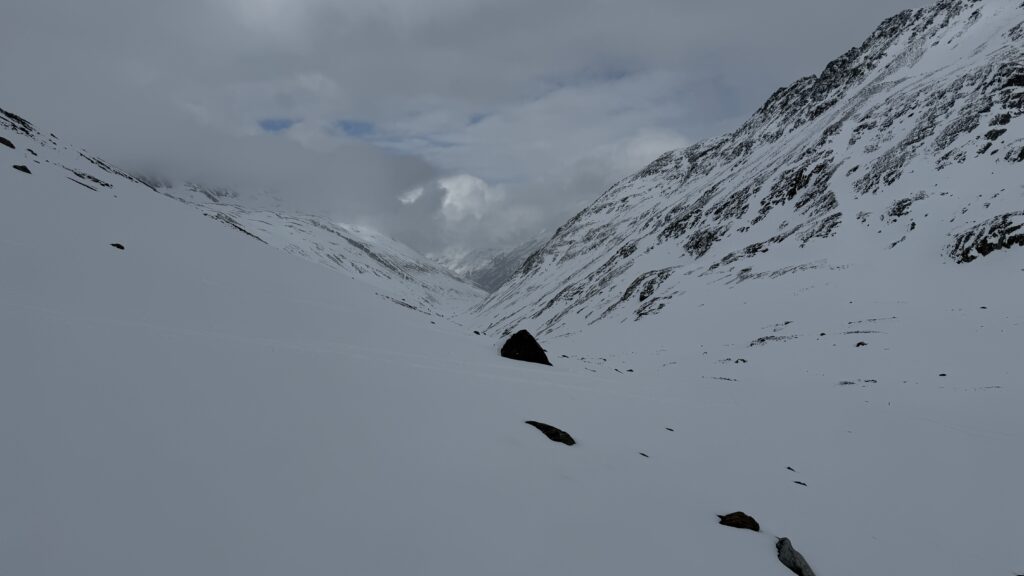 jetzt hatten wir tolle 900 Höhenmeter zum Abfahren hinunter auf 2700 m. Unten haben wir wieder angefüllt über 550 m bergauf zum Hauslabjoch auf 3.272m. Kurz vor dem Hauslabjoch sind bei der Ötzi Fundstelle vorbeigekommen. Dort gibt es ein Denkmal, die Stelle liegt bereits in Italien beziehungsweise Südtirol. Auf dem Joch waren wir erst um 17 Uhr. Ich hatte dann ein großes Material Problem, denn der Spanner zum Stopper ging bei einem Ski kaputt und ich konnte nicht mehr einsteigen. Mithilfe von Alex hab ich geschafft.