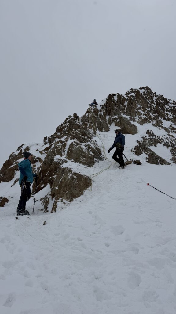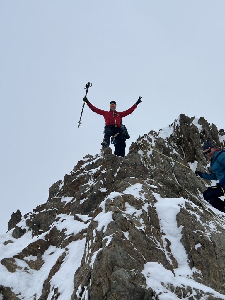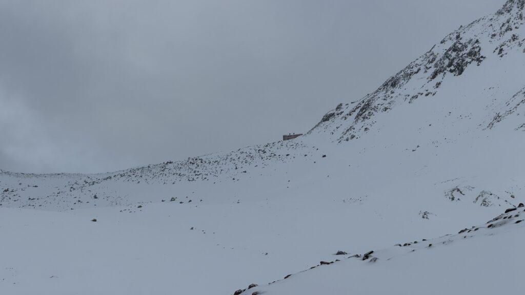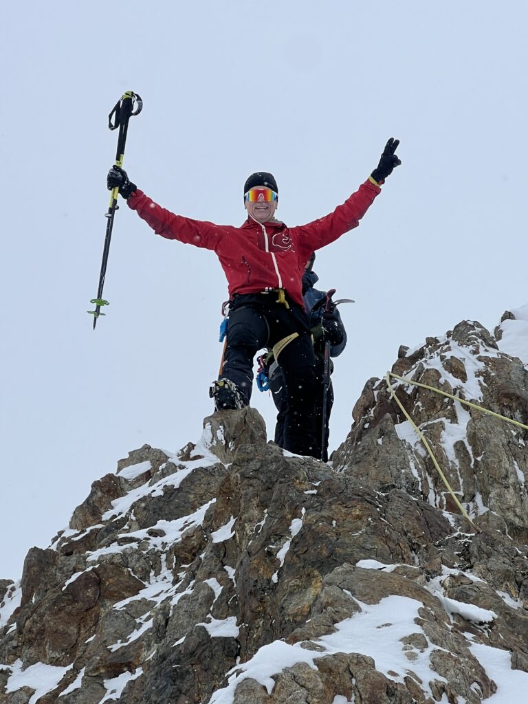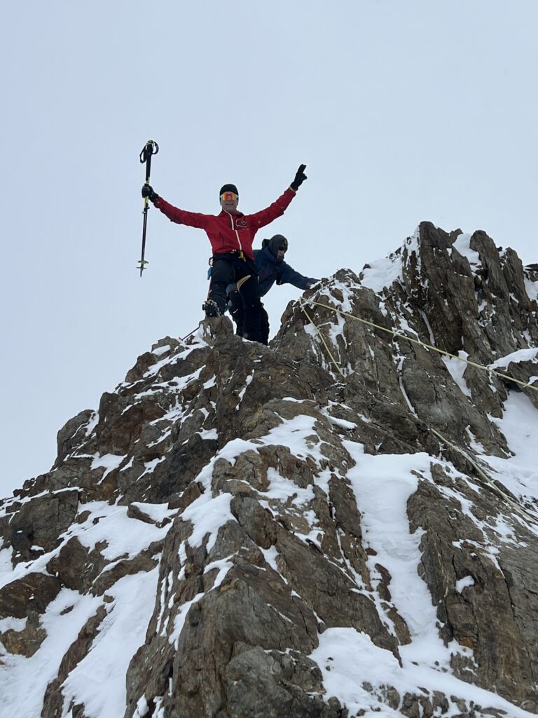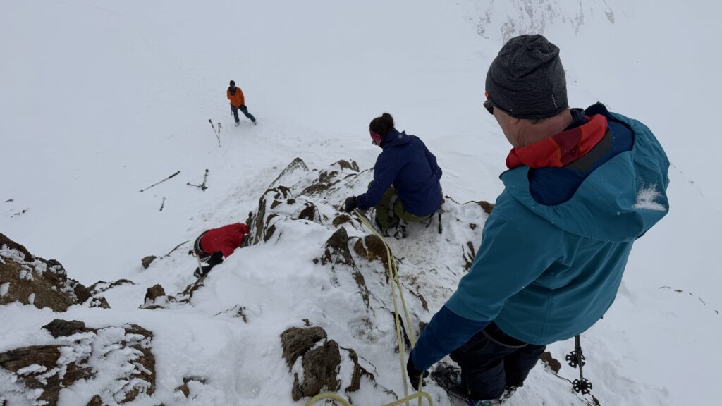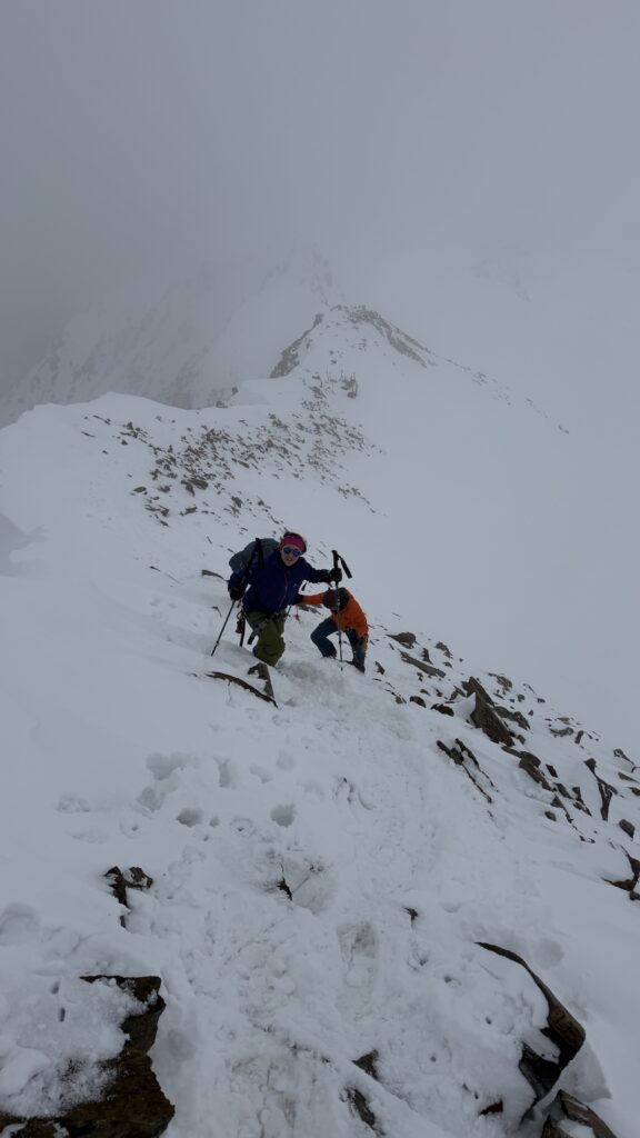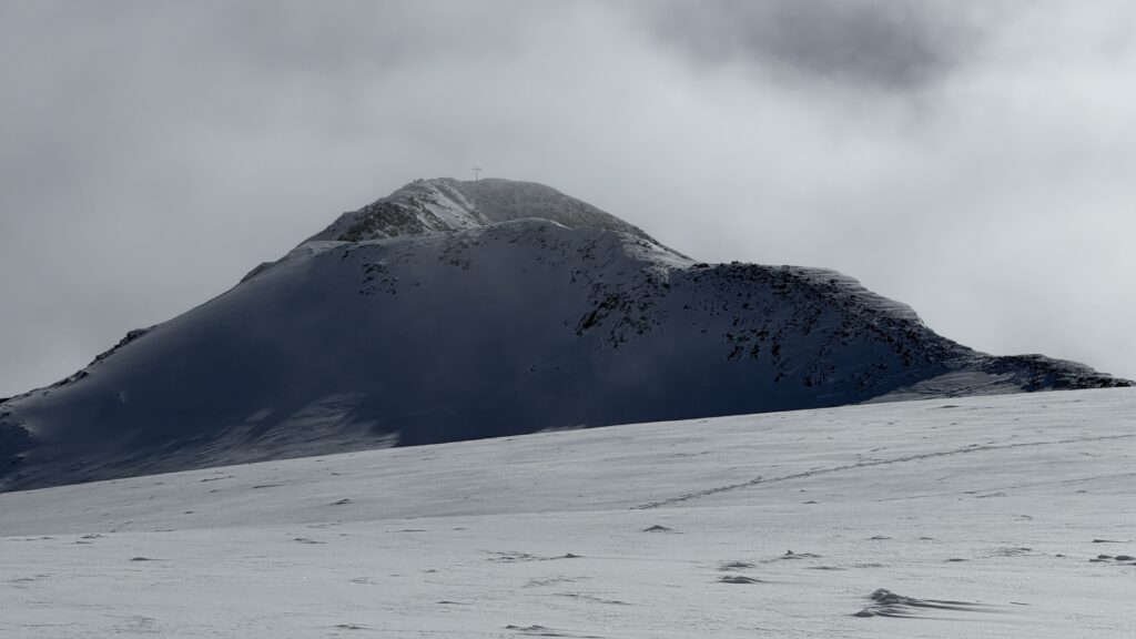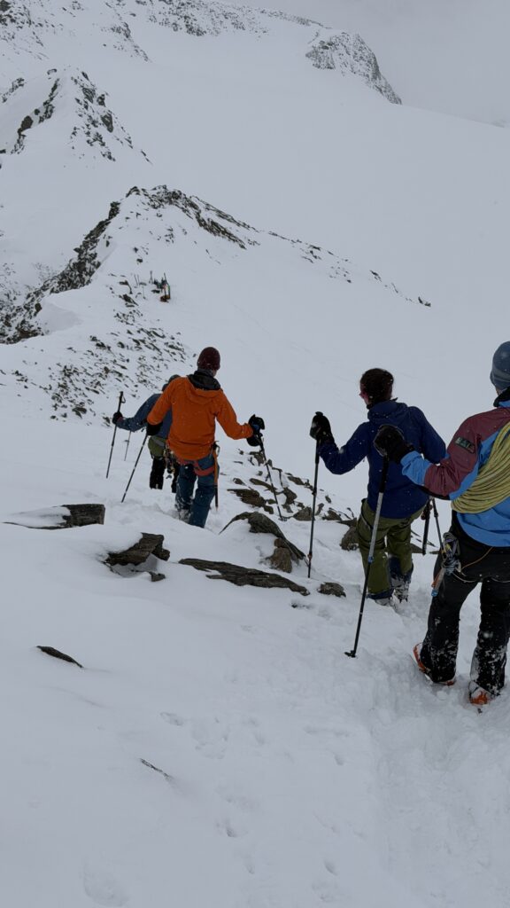 jetzt hatten wir tolle 900 Höhenmeter zum Abfahren hinunter auf 2700 m. Unten haben wir wieder angefüllt über 550 m bergauf zum Hauslabjoch auf 3.272m. Kurz vor dem Hauslabjoch sind bei der Ötzi Fundstelle vorbeigekommen. Dort gibt es ein Denkmal, die Stelle liegt bereits in Italien beziehungsweise Südtirol. Auf dem Joch waren wir erst um 17 Uhr. Ich hatte dann ein großes Material Problem, denn der Spanner zum Stopper ging bei einem Ski kaputt und ich konnte nicht mehr einsteigen. Mithilfe von Alex hab ich geschafft.