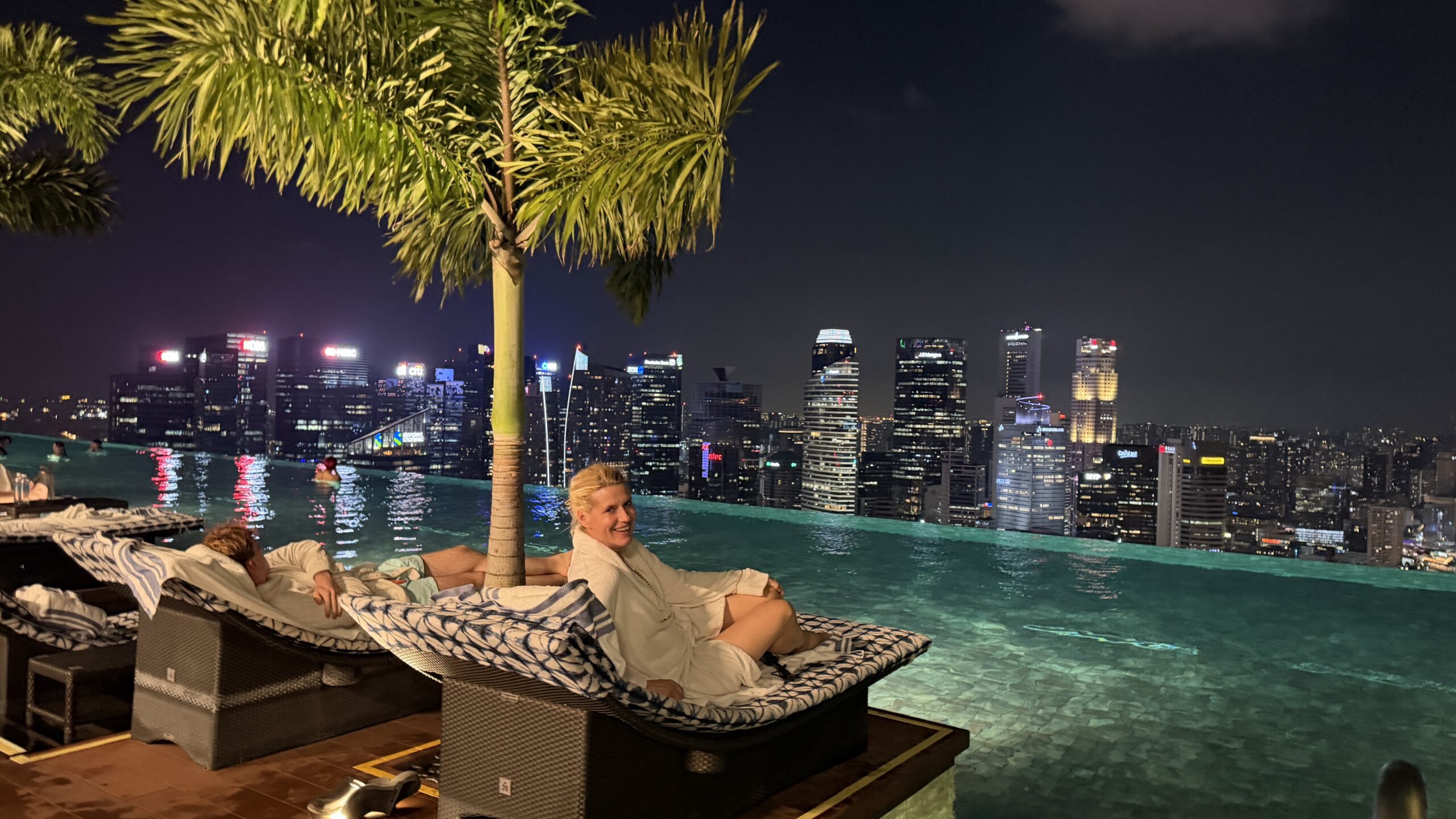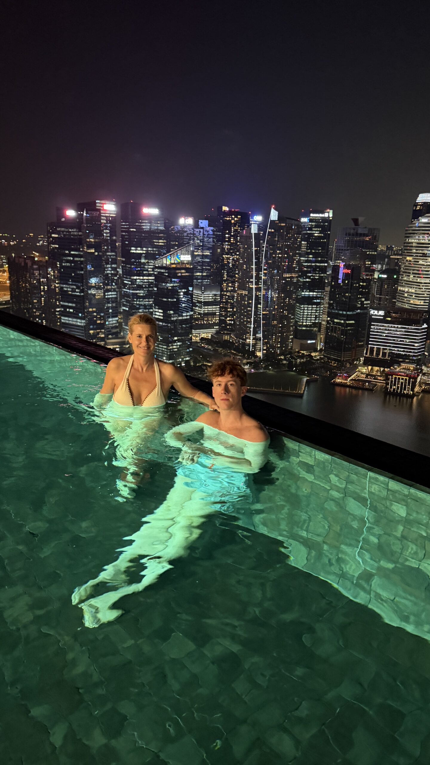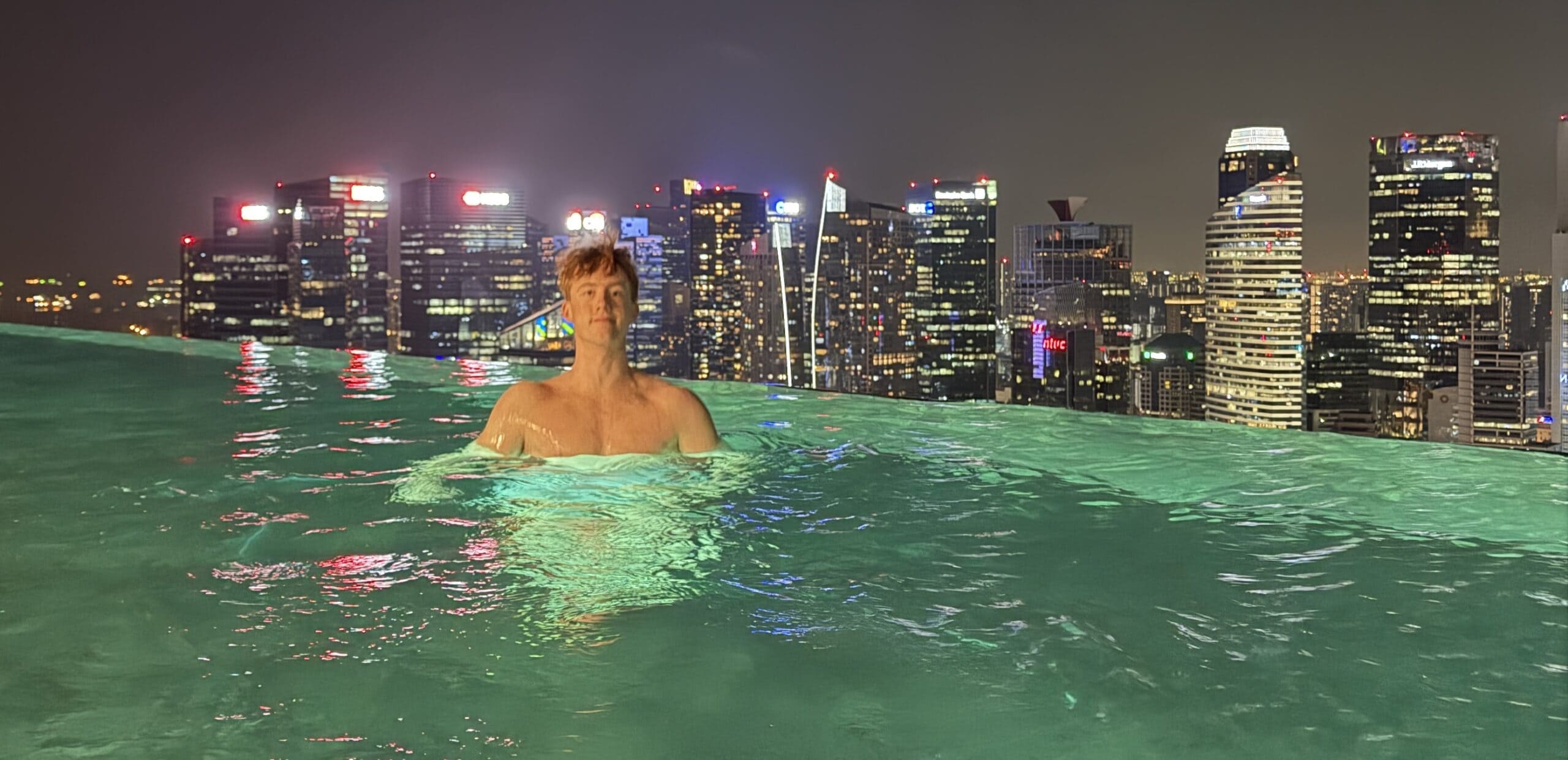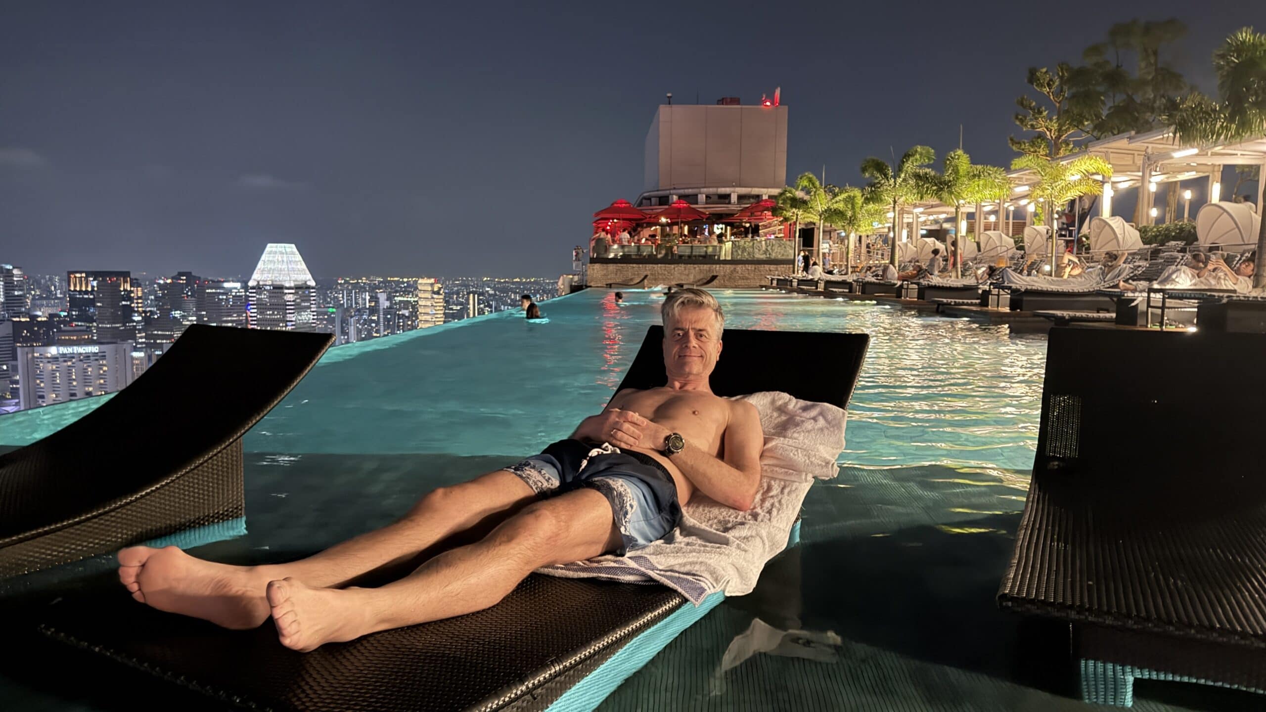 Nach 1 Stunde gegen 19:30 Uhr fahren wir wieder zurück in unser Hotel. Dort gingen wir dann gleich hinauf zum Sky Pool haben eine Fruchtbowl mit Eis gegessen. Danach geht’s gleich ins Wasser und wir genossen den Ausblick auf die Skyline.