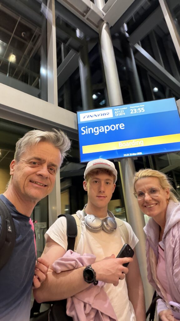 19:15 Uhr sind wir mit Finnair nach Helsinki geflogen. Dort hatten wir einen kurzen Stopover und um Mitternacht ging’s dann für zwölfeinhalb Stunden nach Singapur.