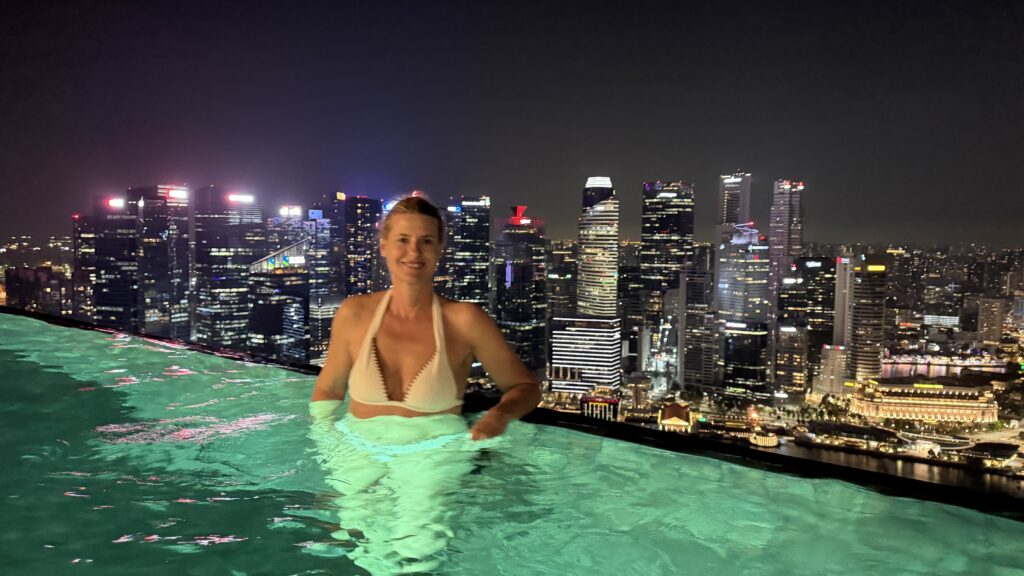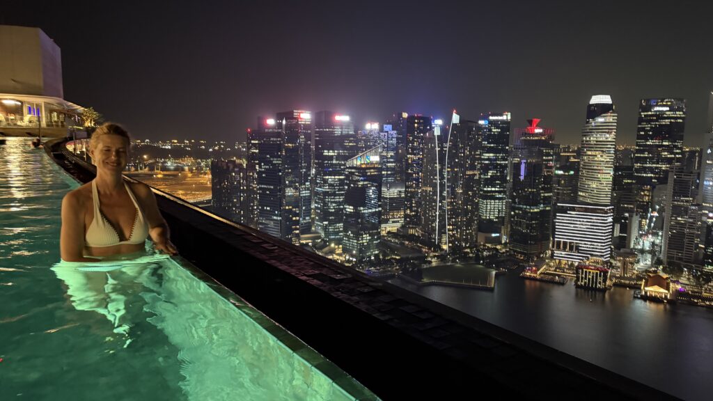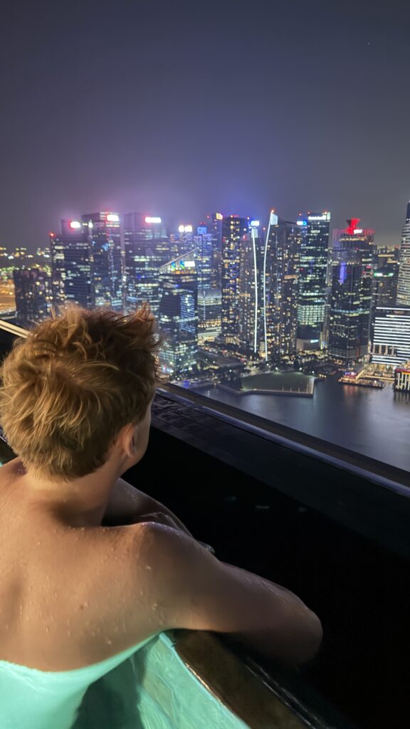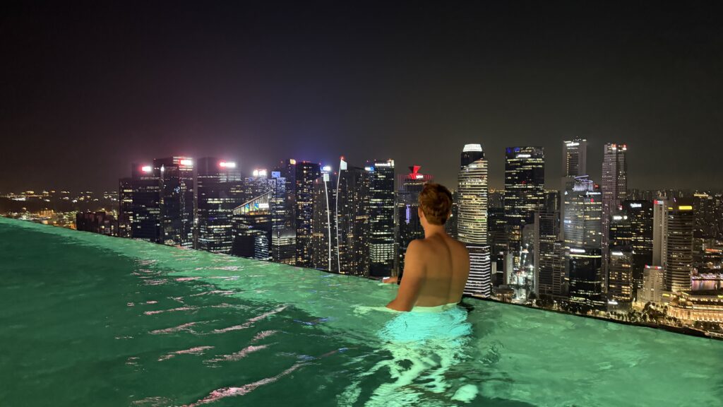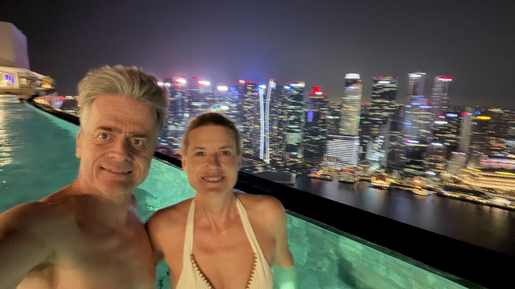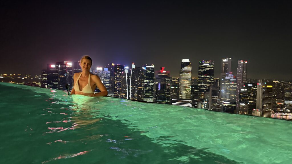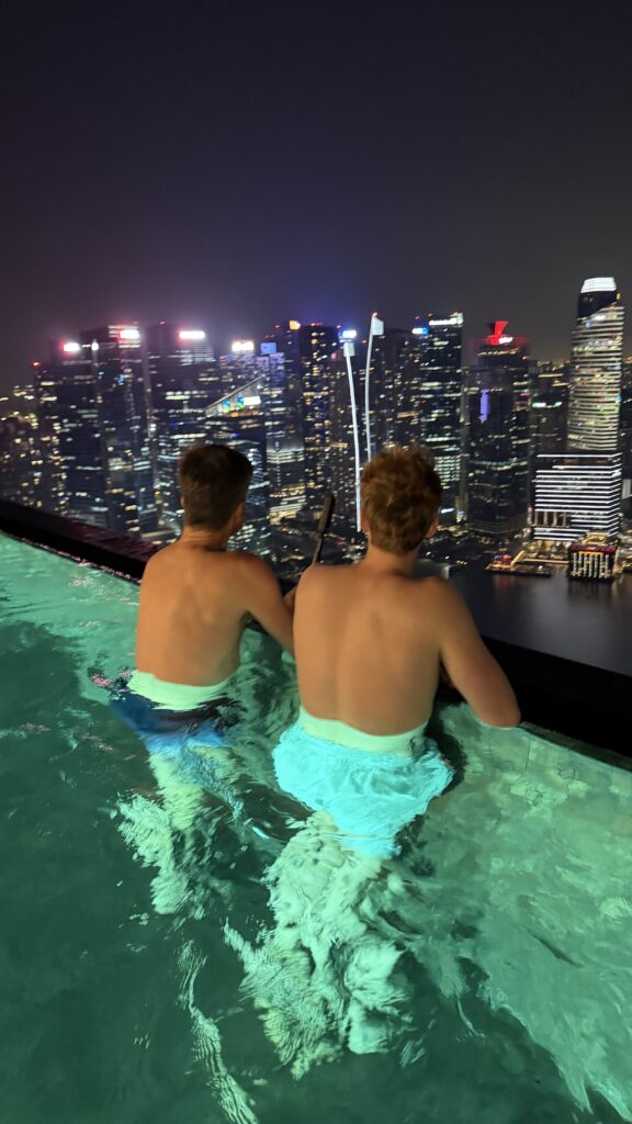 Zunächst sind wir auf unser Zimmer im 38. Stock gegangen und waren happy über unseren Ausblick auf die Skyline von Singapur. Dann fuhren wir hinauf in den 57. Stock zum Swimmingpool. Dort haben wir noch Burger bei herrlichem Ausblick auf die Sky Skyline gegessen.