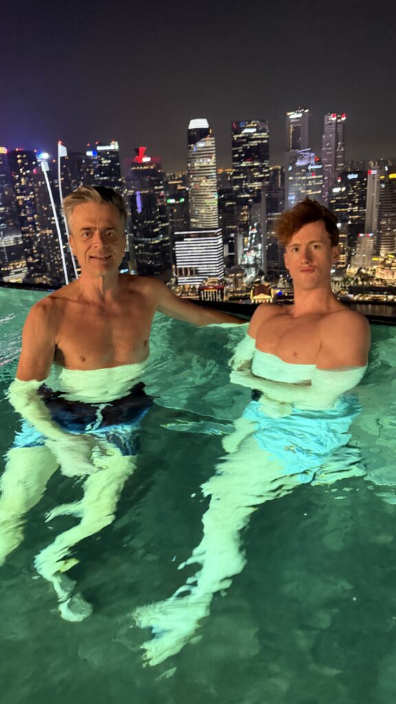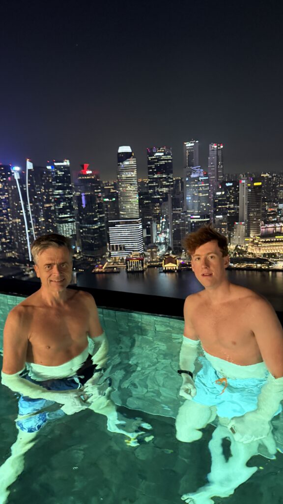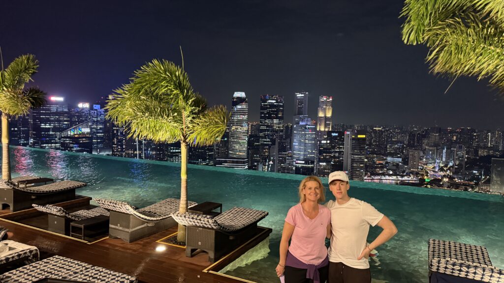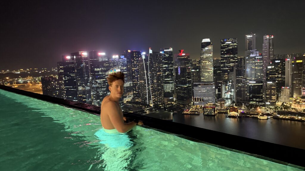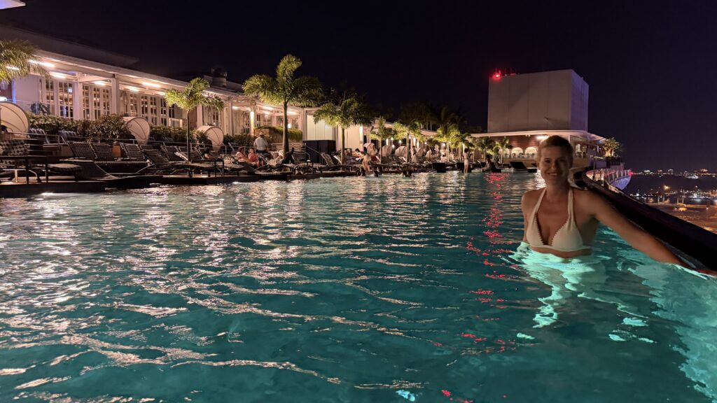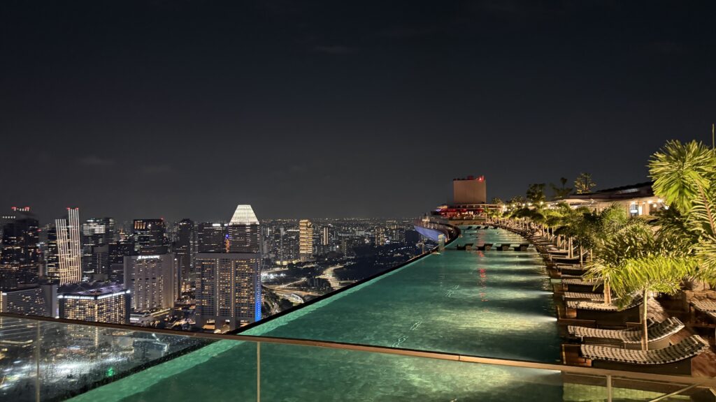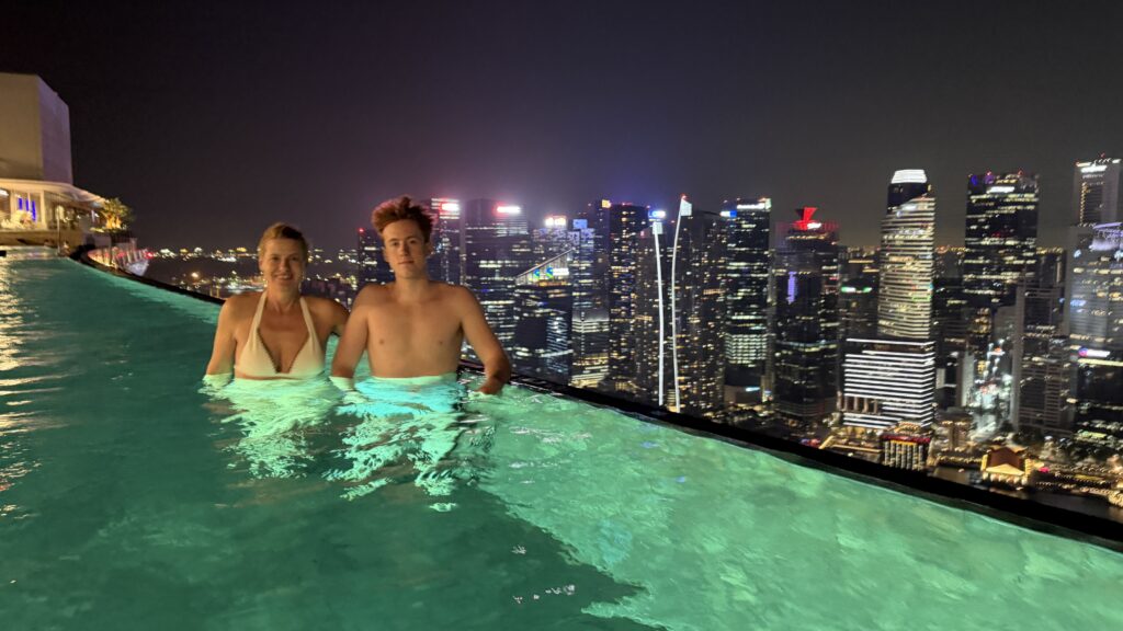 Zunächst sind wir auf unser Zimmer im 38. Stock gegangen und waren happy über unseren Ausblick auf die Skyline von Singapur. Dann fuhren wir hinauf in den 57. Stock zum Swimmingpool. Dort haben wir noch Burger bei herrlichem Ausblick auf die Sky Skyline gegessen.